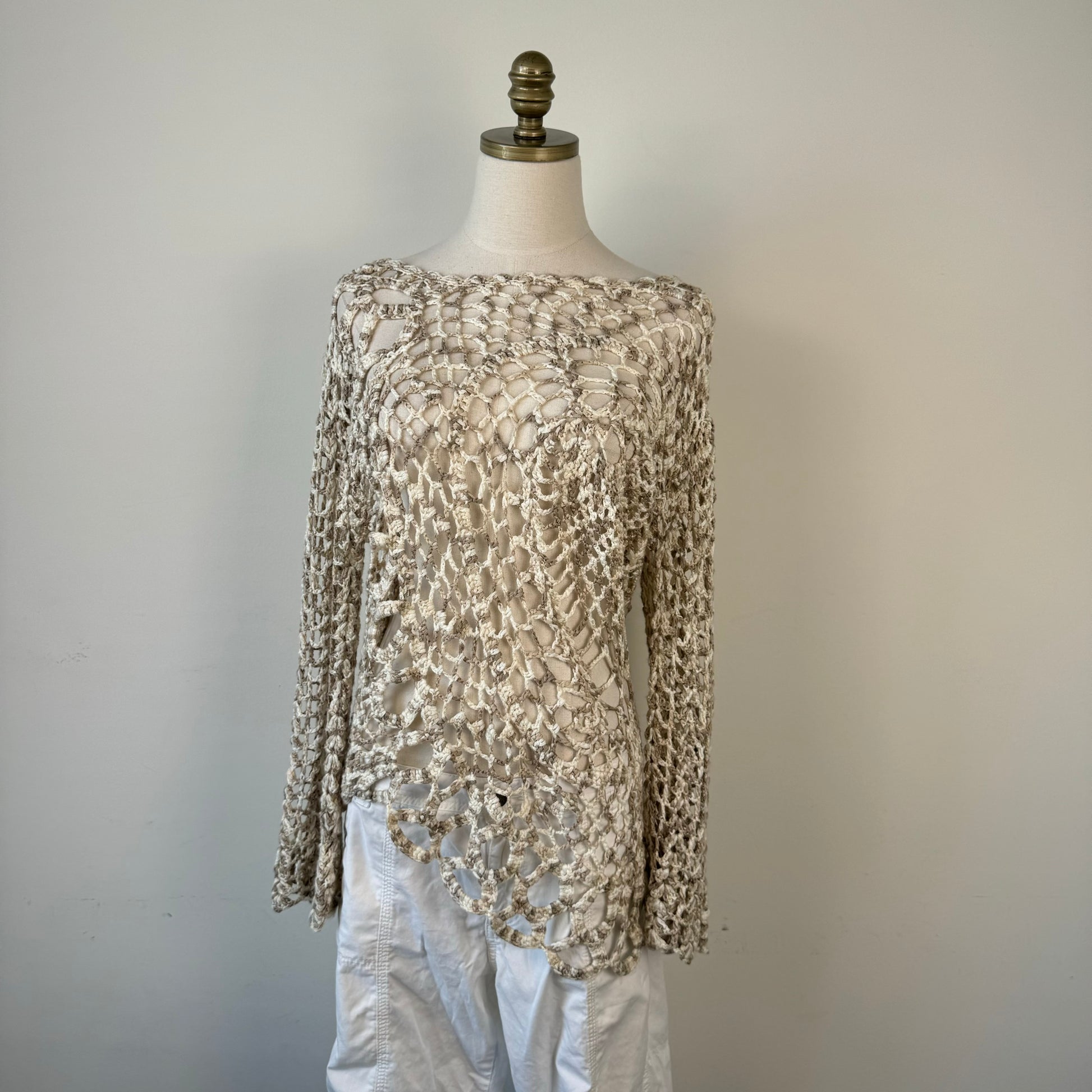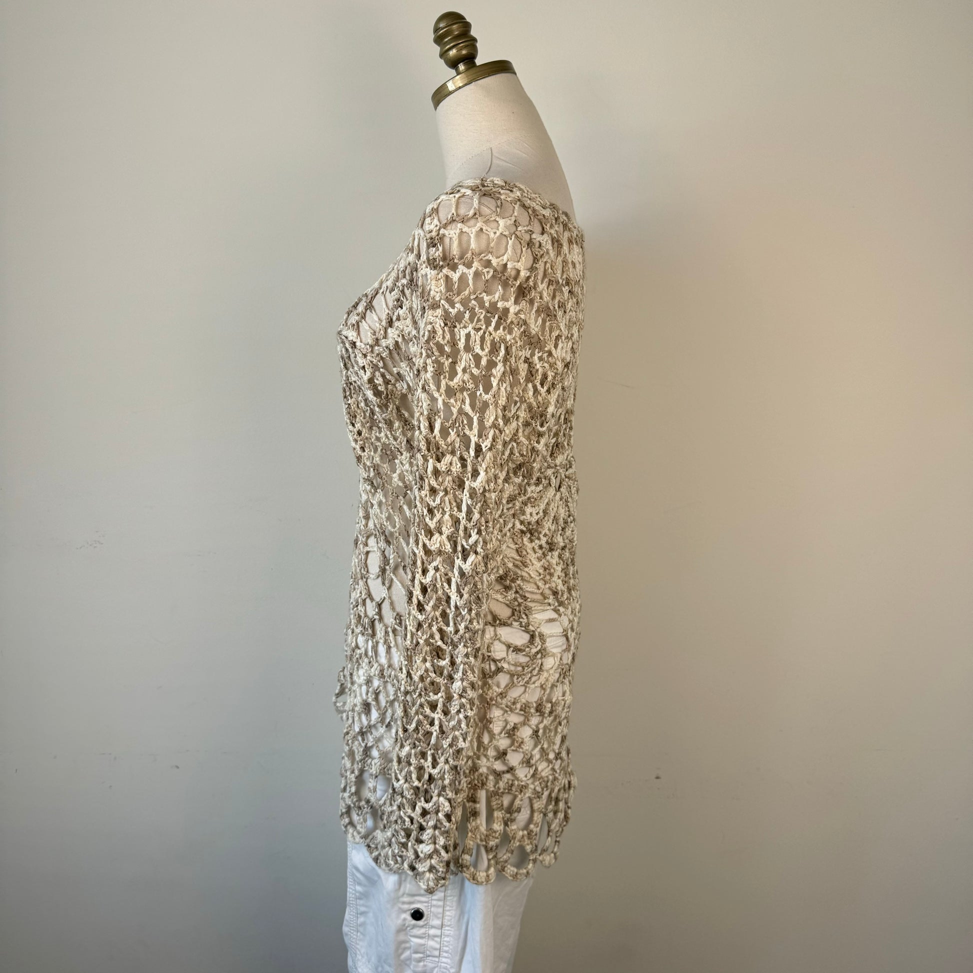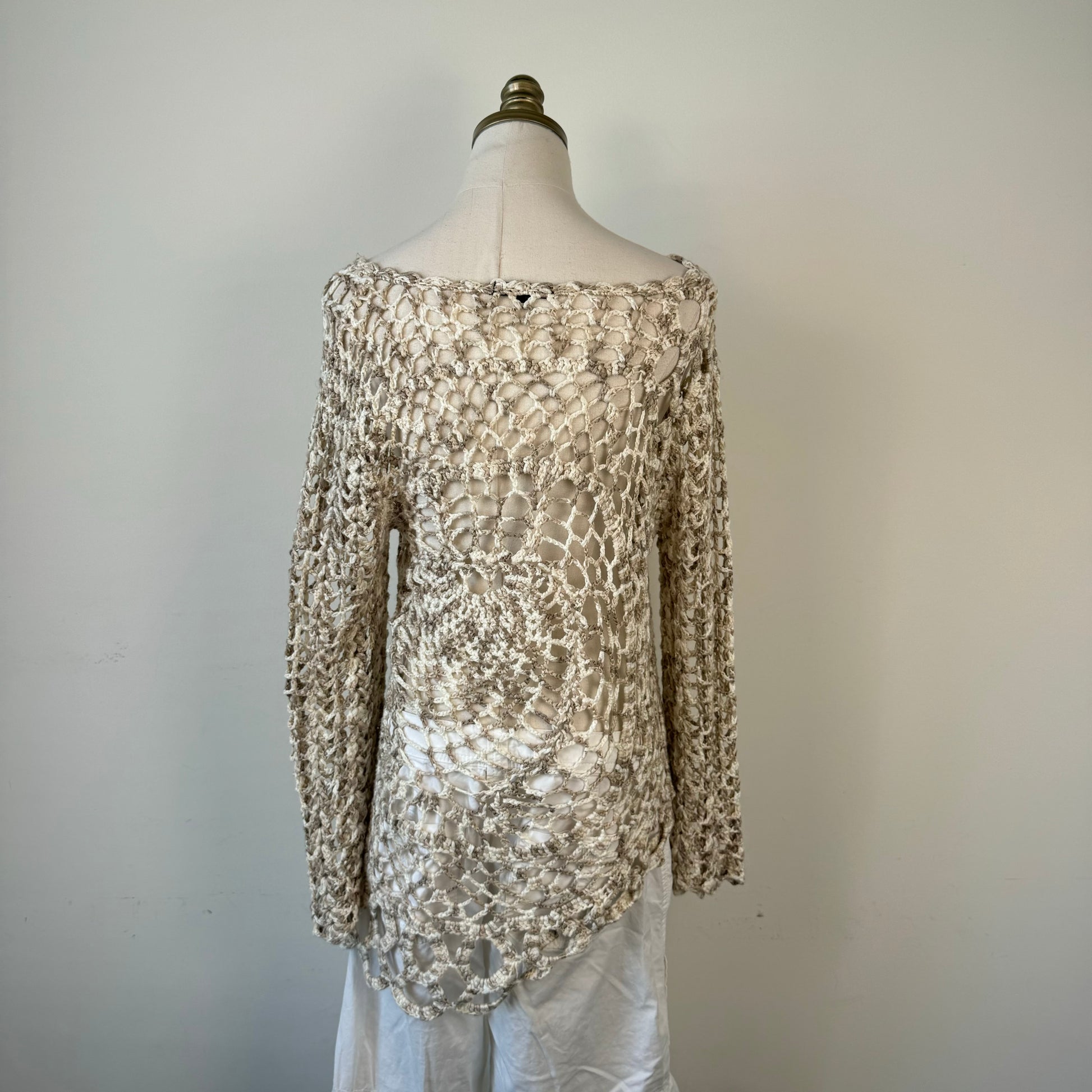 Details: Vintage asymmetric off-shoulder sweater in brown and white crochet mesh knit.