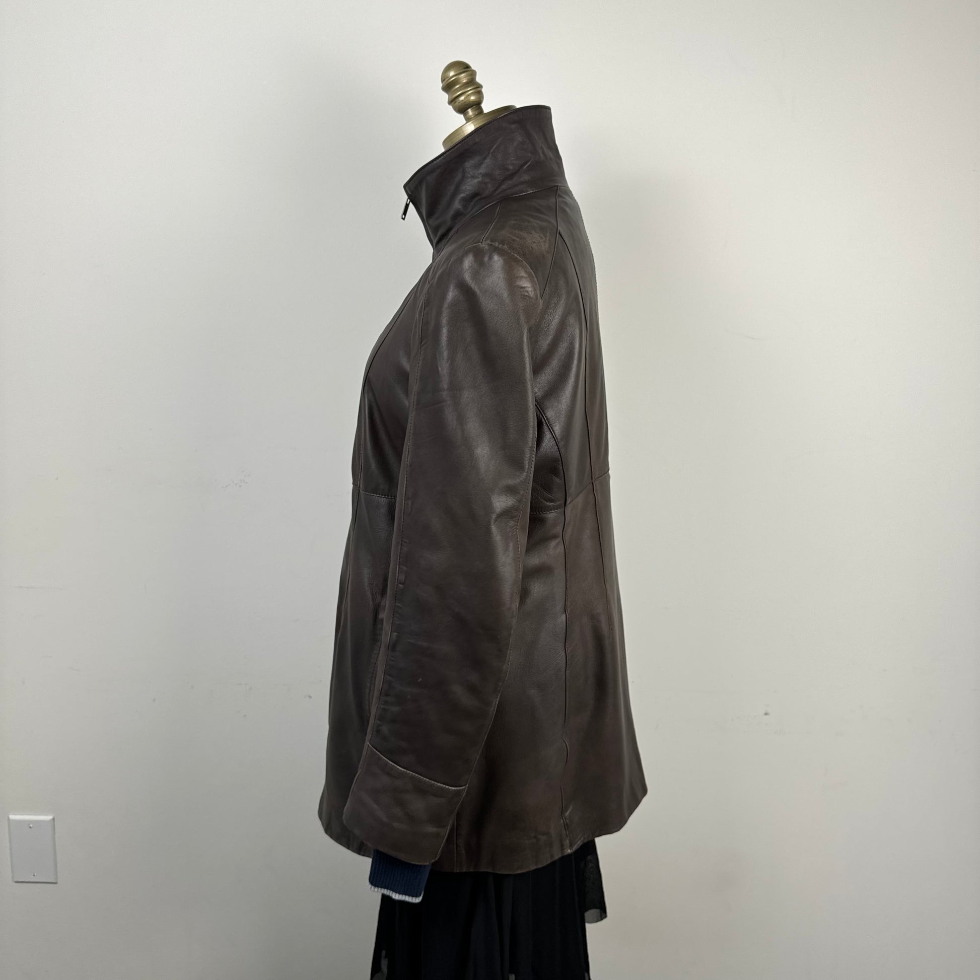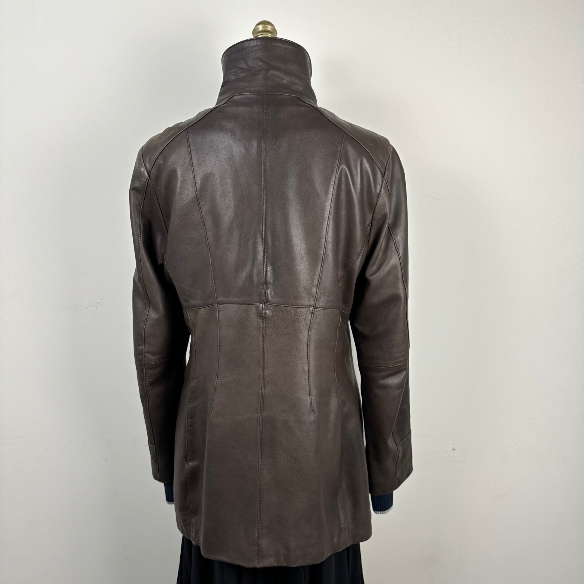 Details: Dark brown genuine leather jacket with a longer torso, double zip-up front.