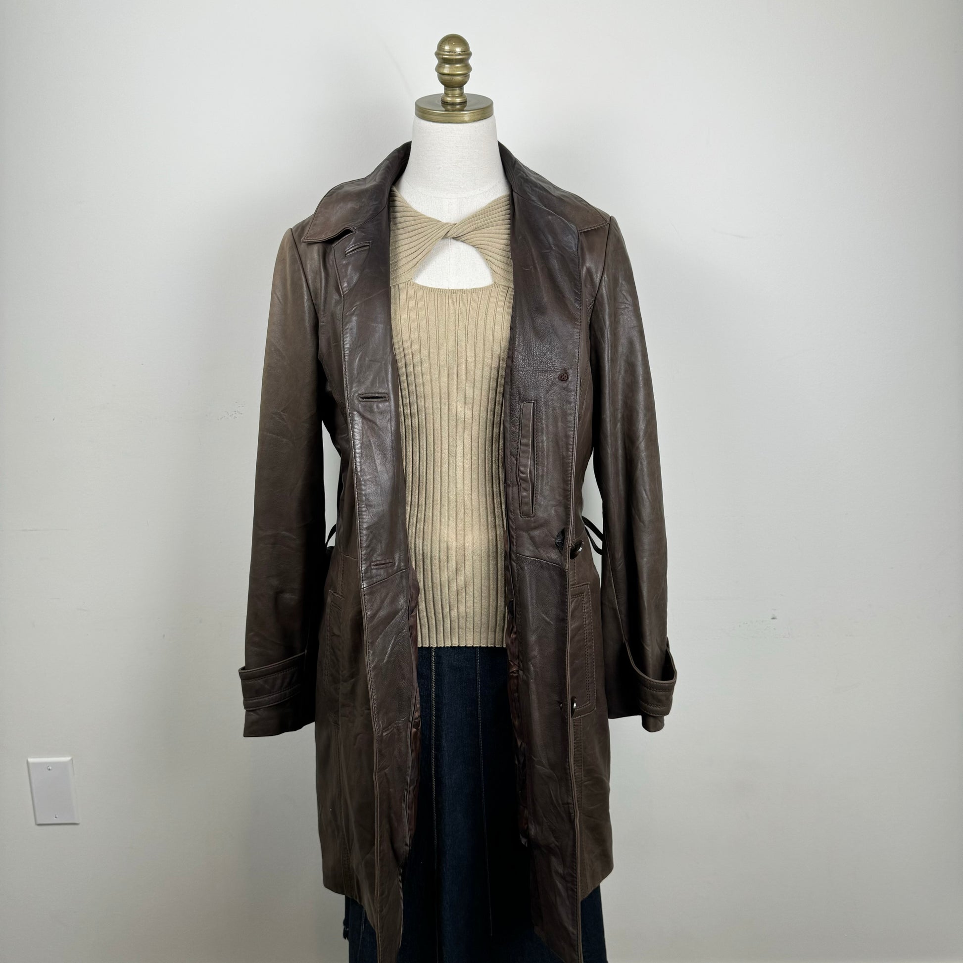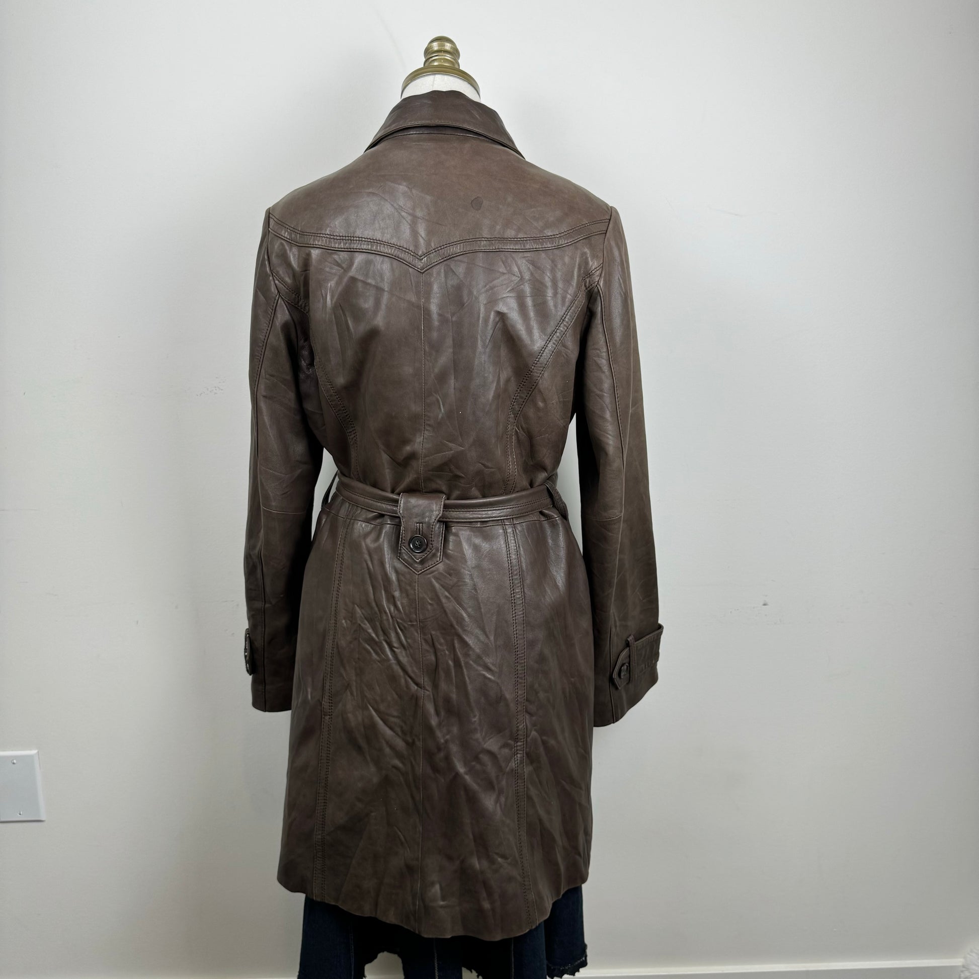 Details: Brown genuine leather trench coat with button-up front.