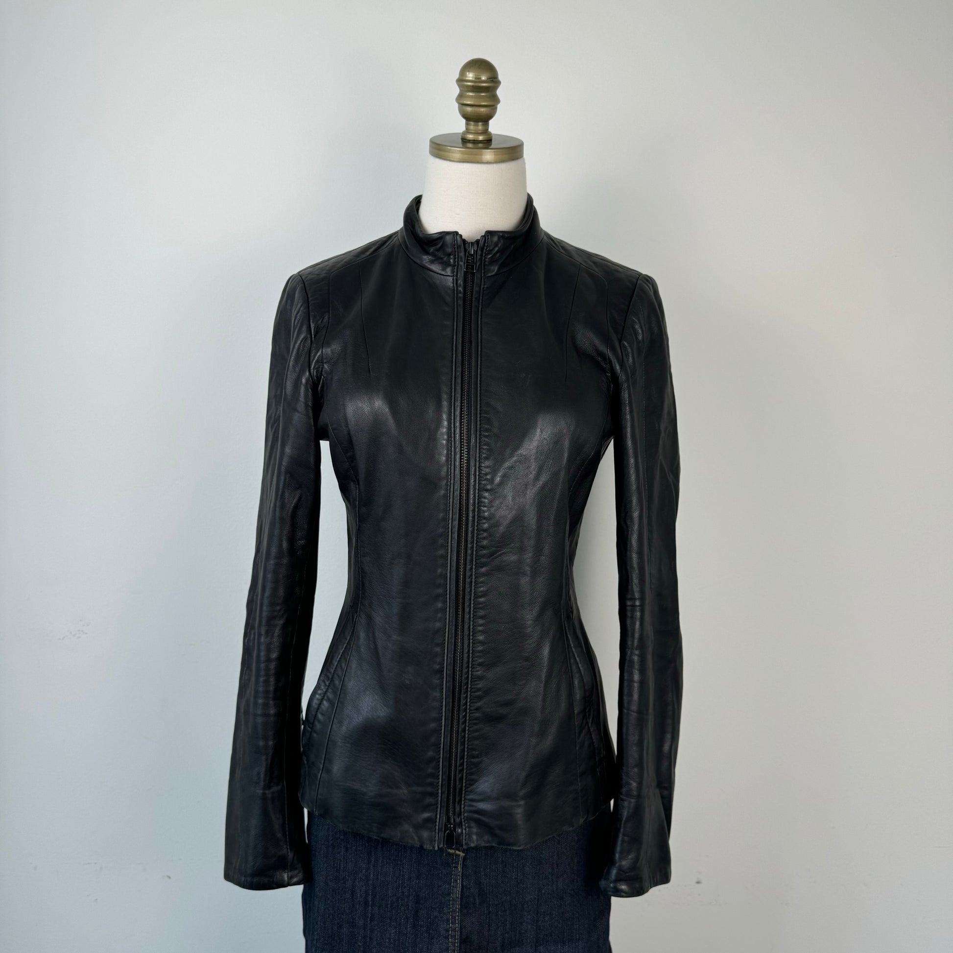 Details: Black fitted zip-up moto jacket made of genuine leather, with silver hardware details.