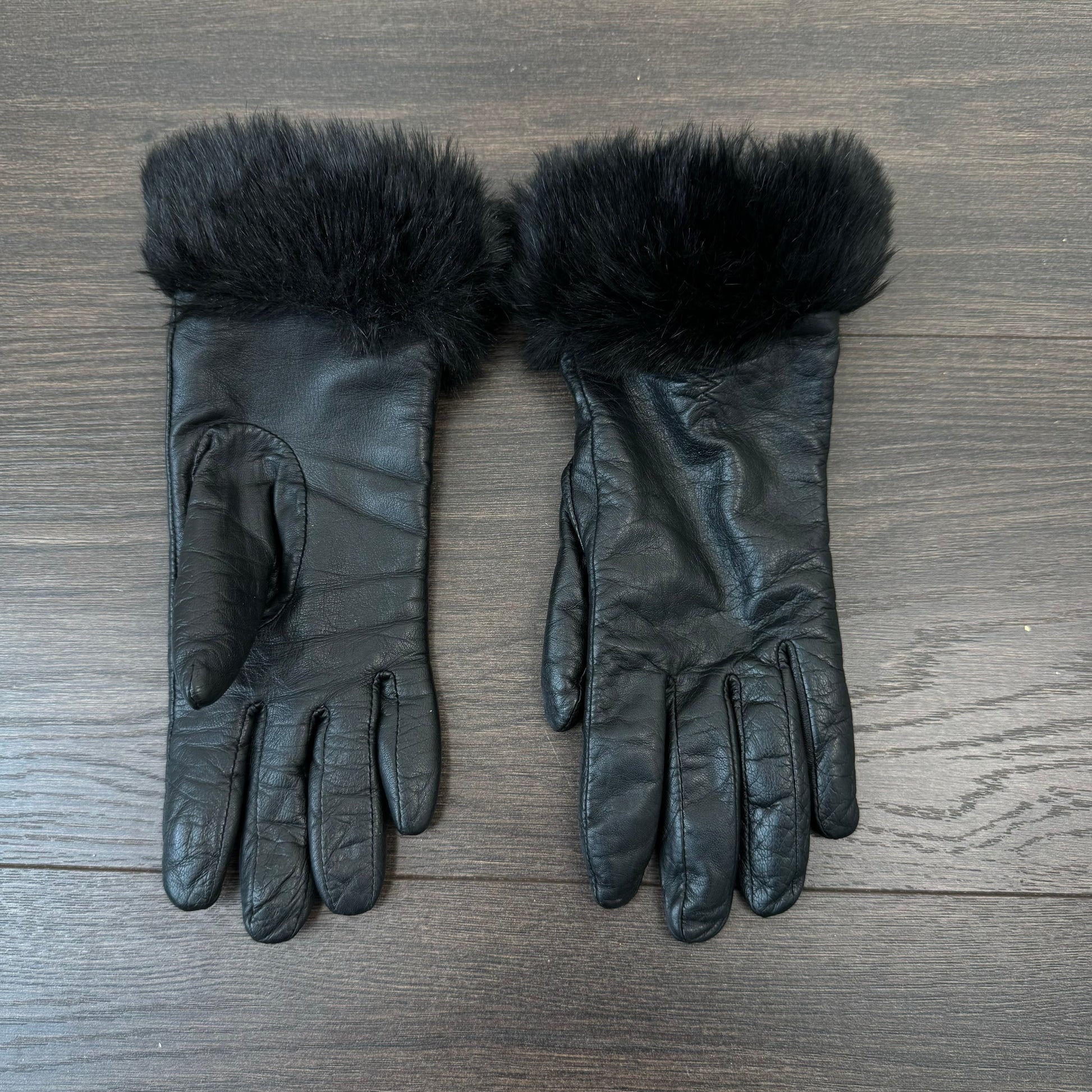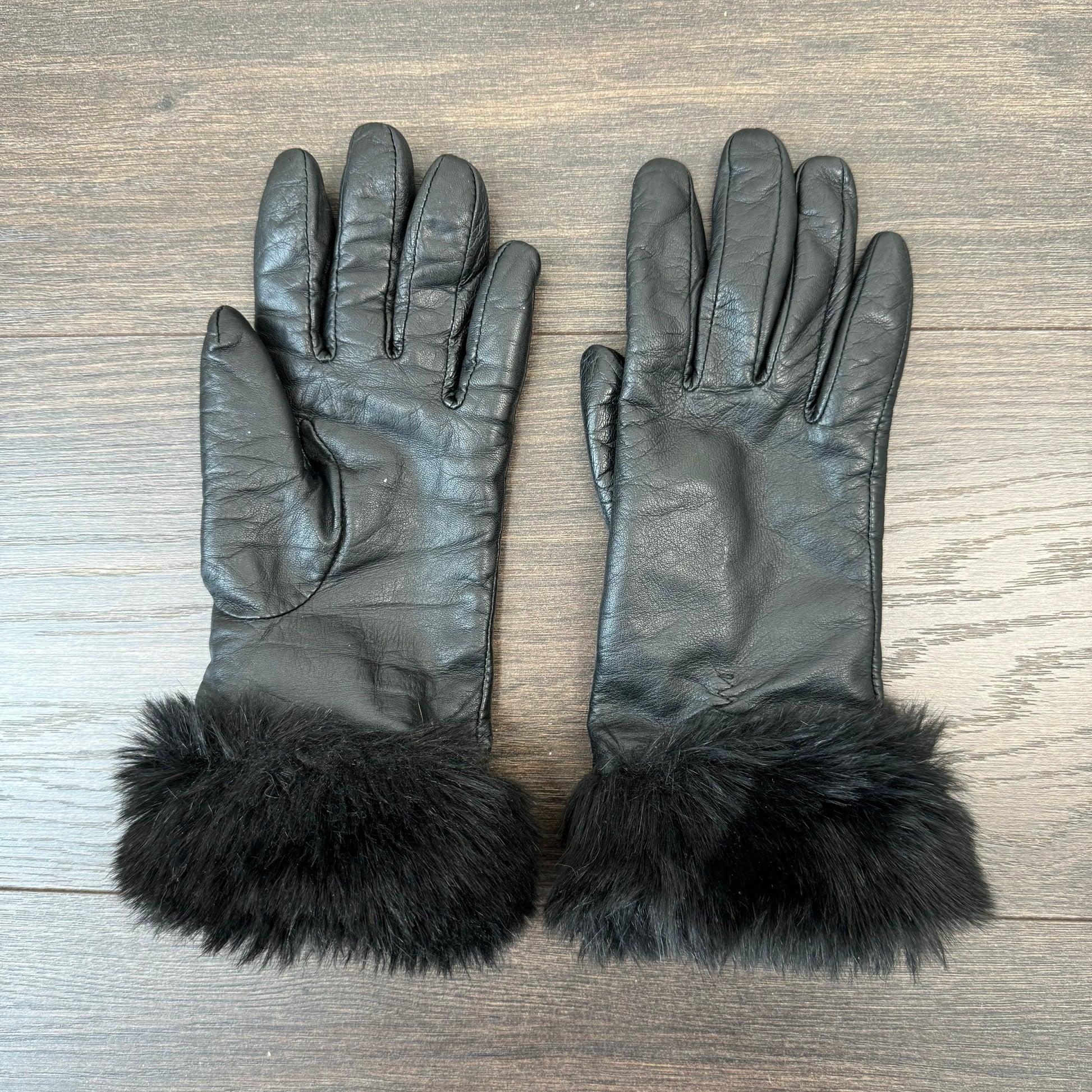 Details: Black genuine leather gloves with fur trim, brand Danier.