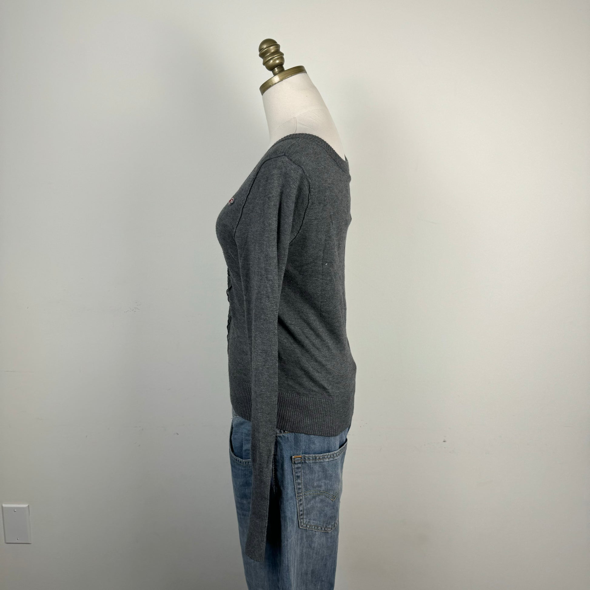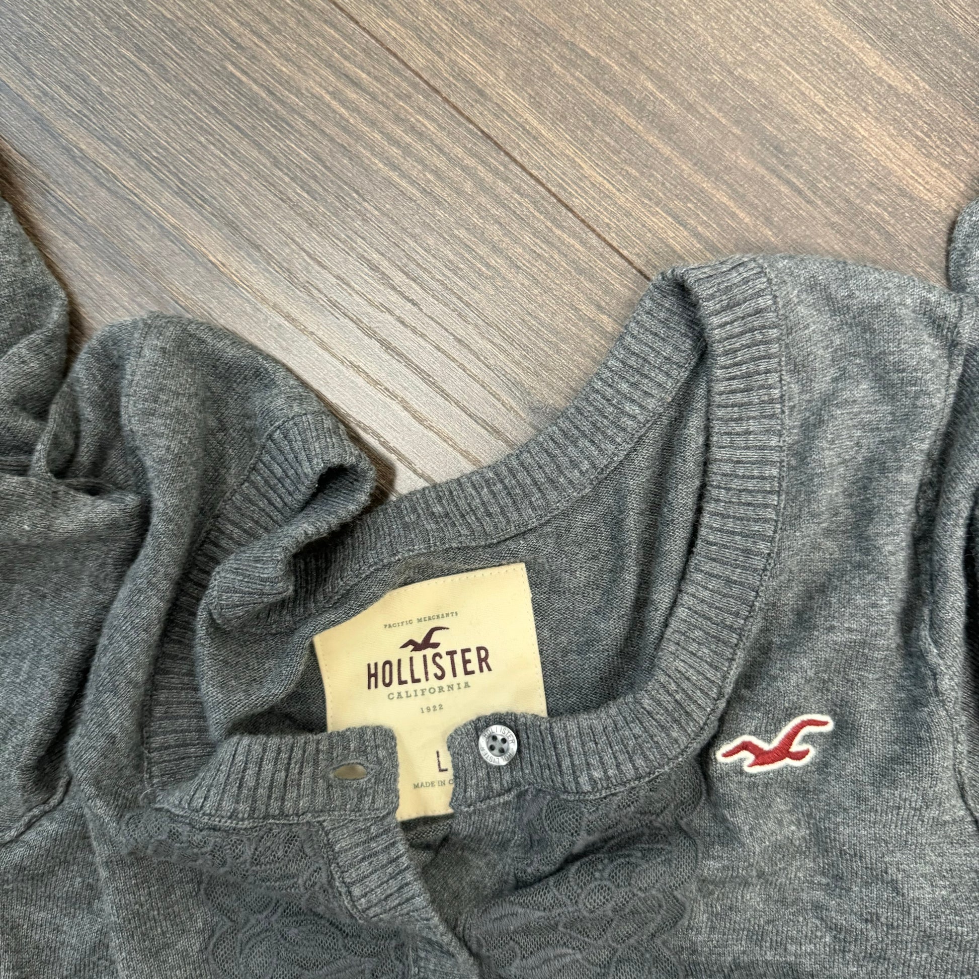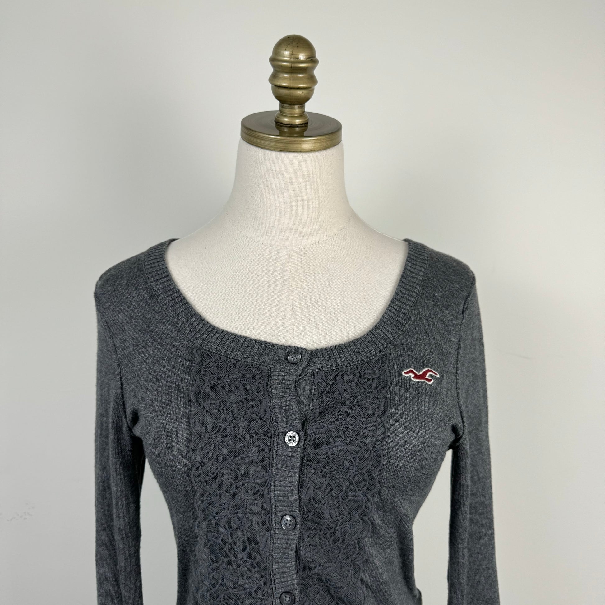 Details: Dark grey fitted cardigan with button-up closure, featuring lace floral details that can be styled off the shoulder.