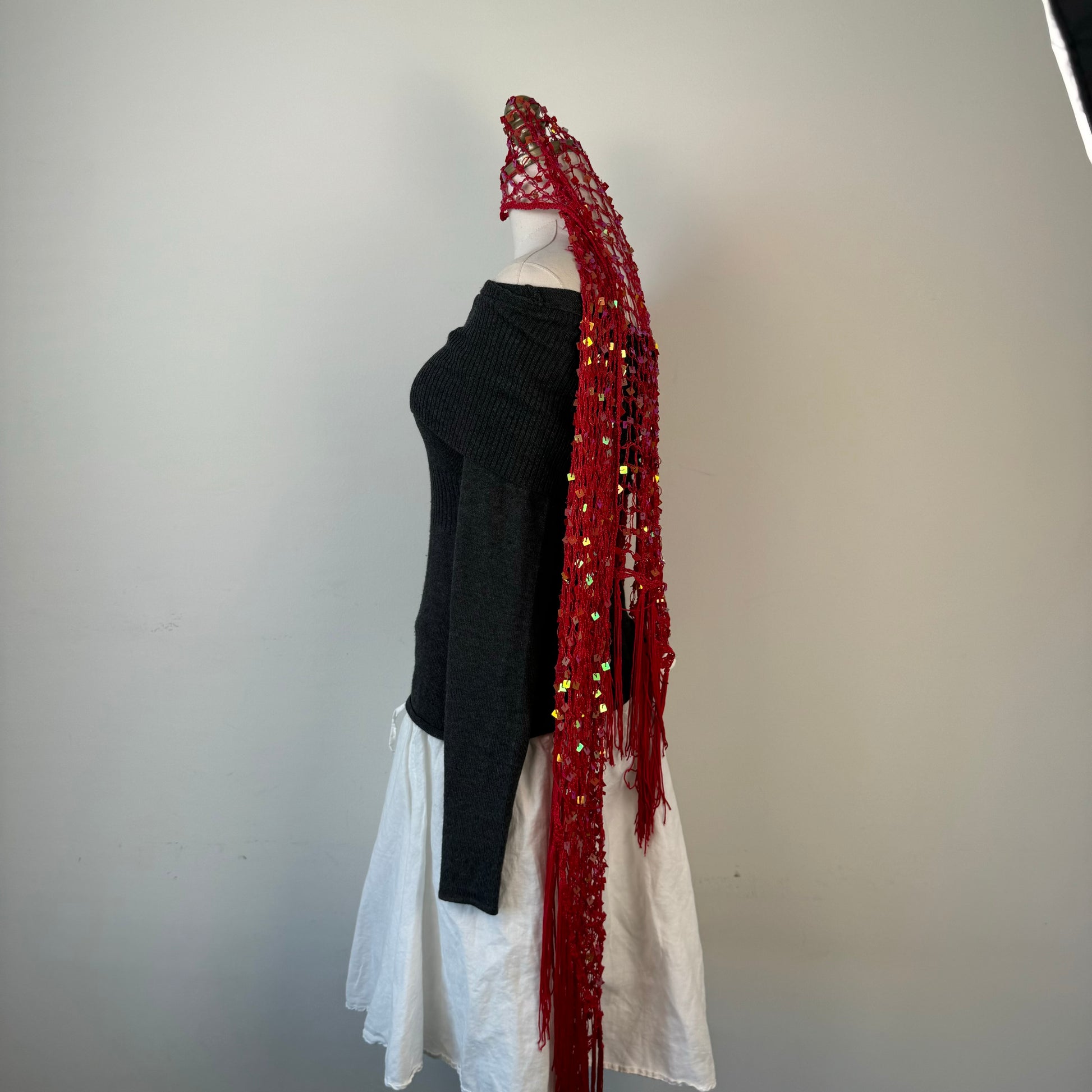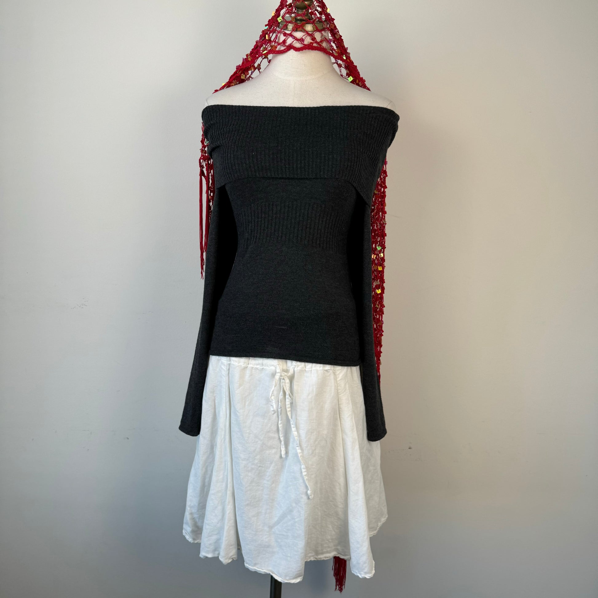 Details: Dark grey off the shoulder sweater with cinched waist detail.