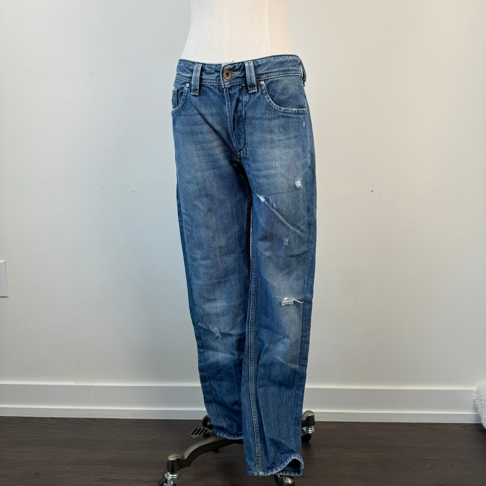 Details: Low rise straight cut jeans by Diesel with distressed details, Larkee style.