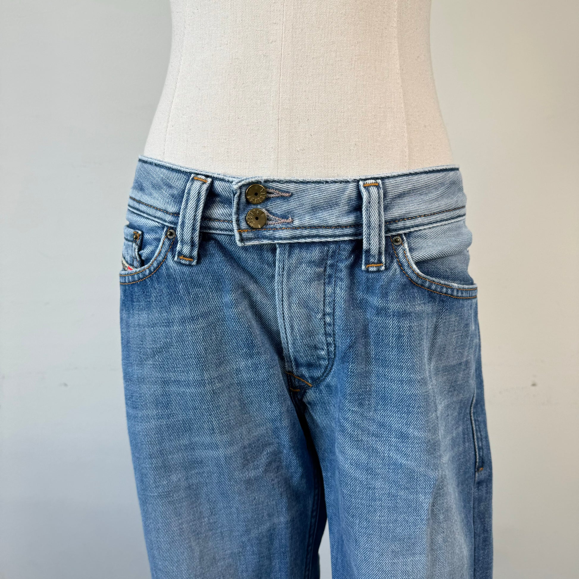Details: Low rise slim-straight cut light wash jeans in the Viker-R-Box model by Diesel.