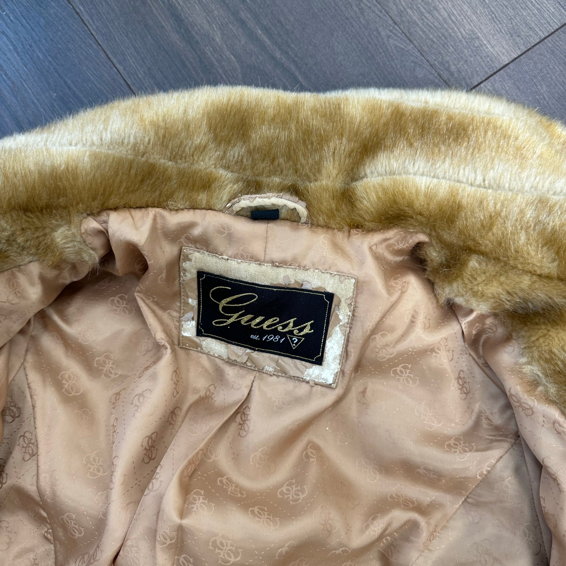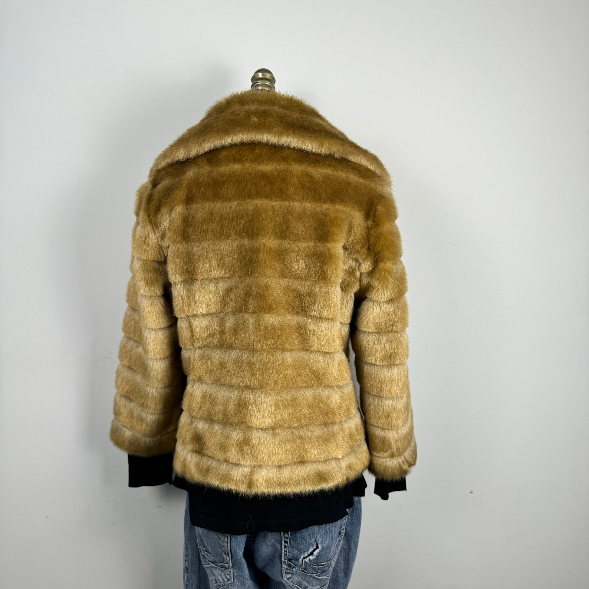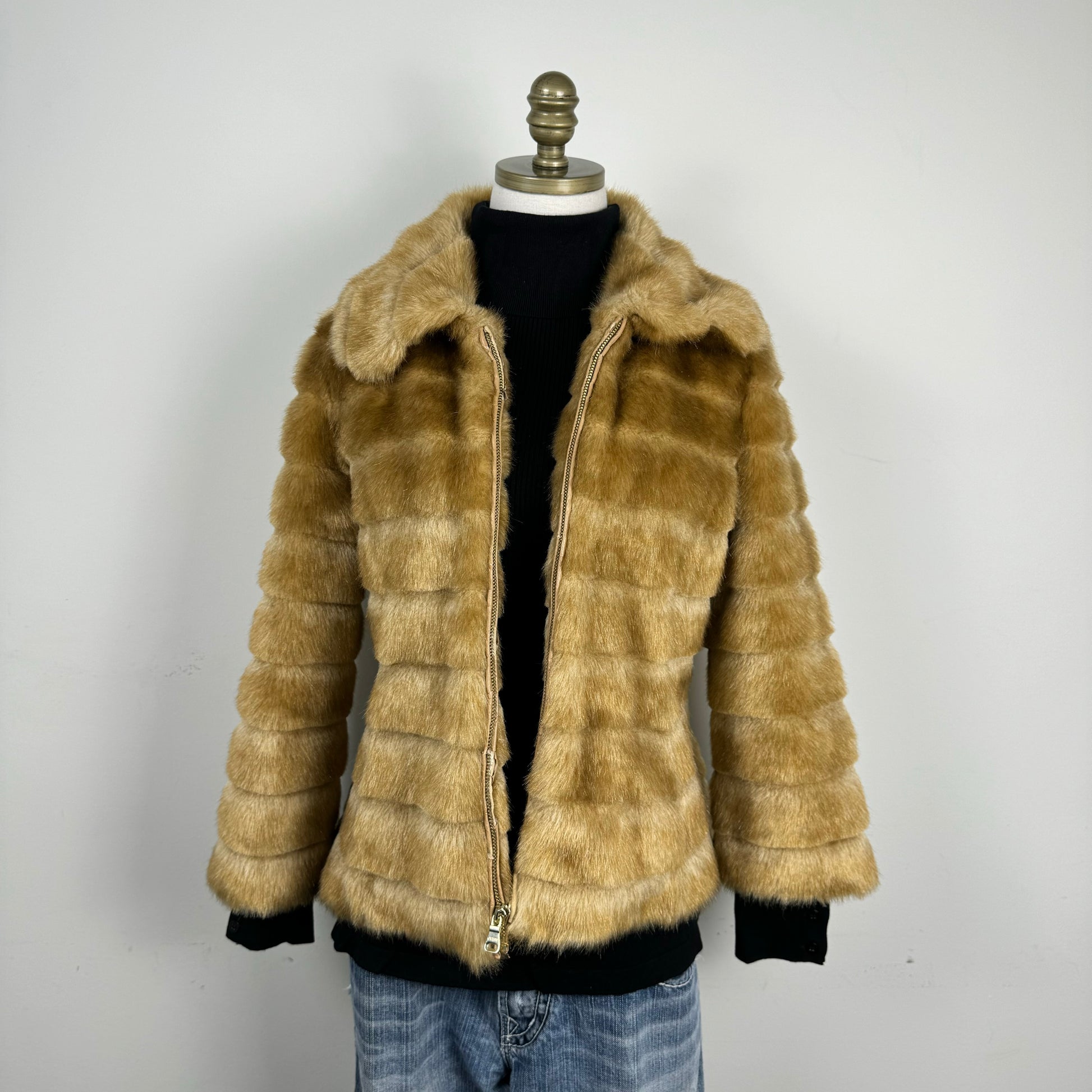 Details: Faux fur zip-up jacket in tan color, with fur collar.