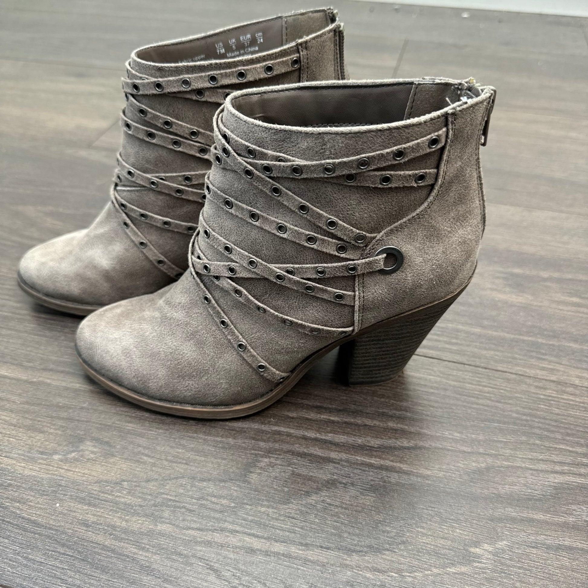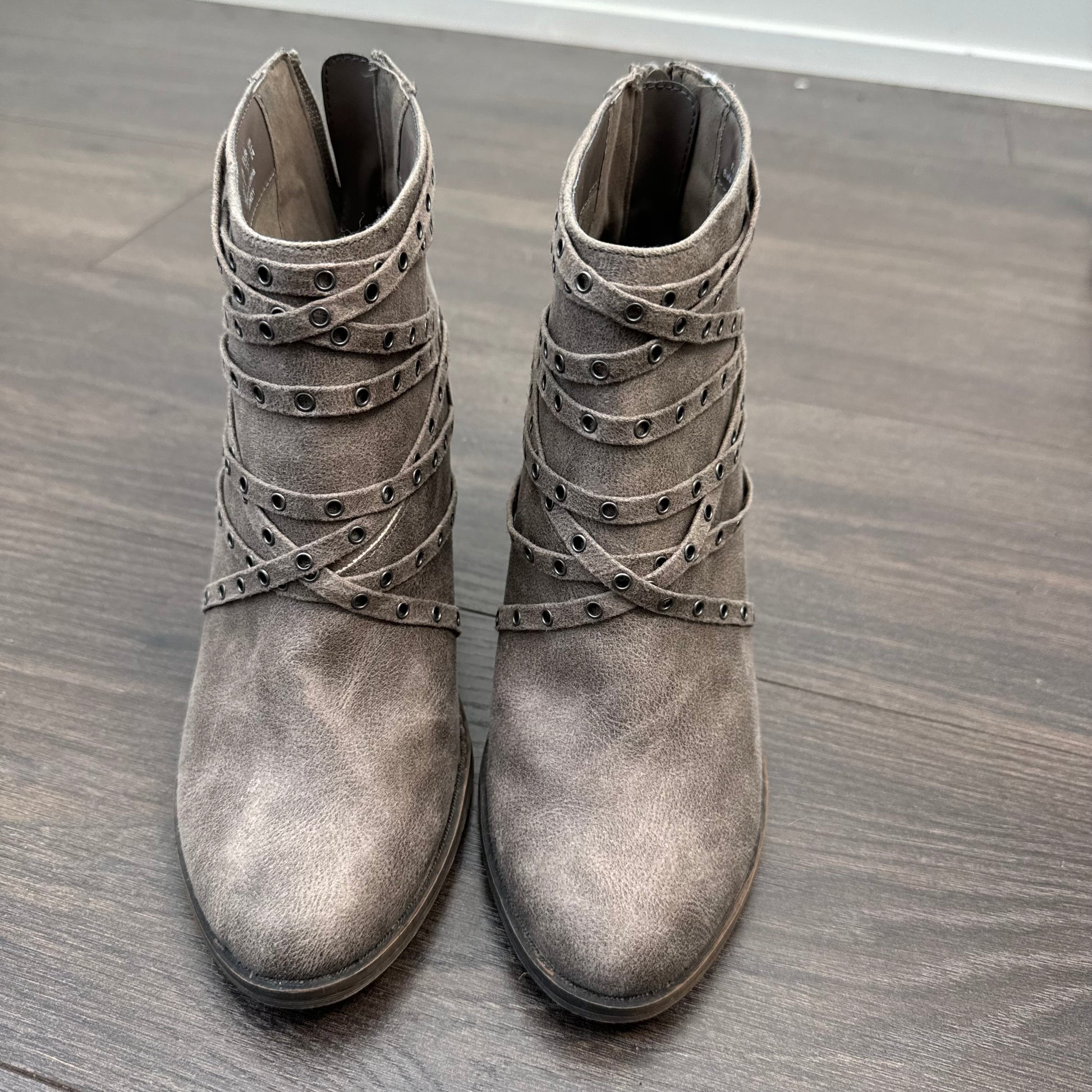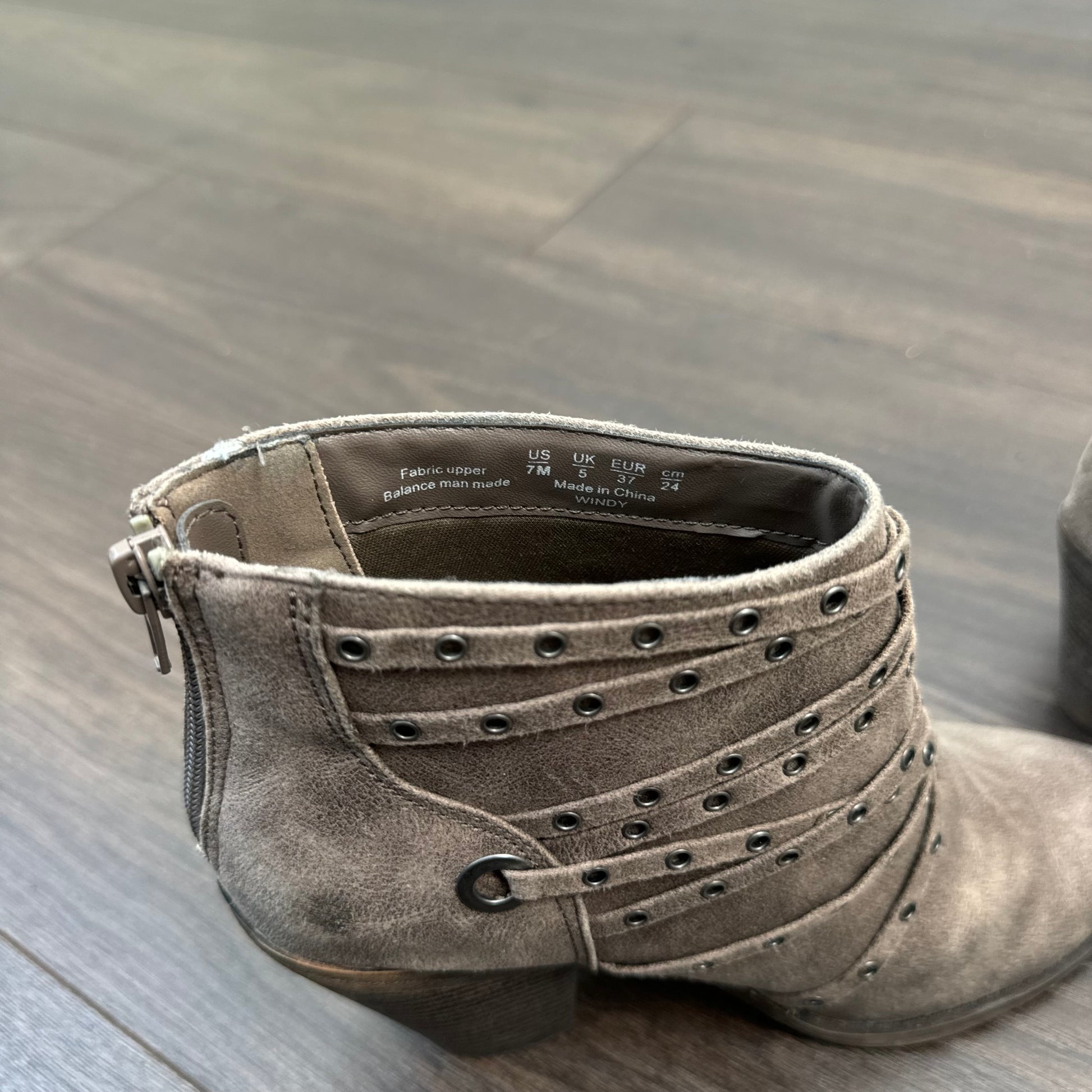 Details: Brown boot heels with silver hardware eyelet details, ankle length, faux suede material.