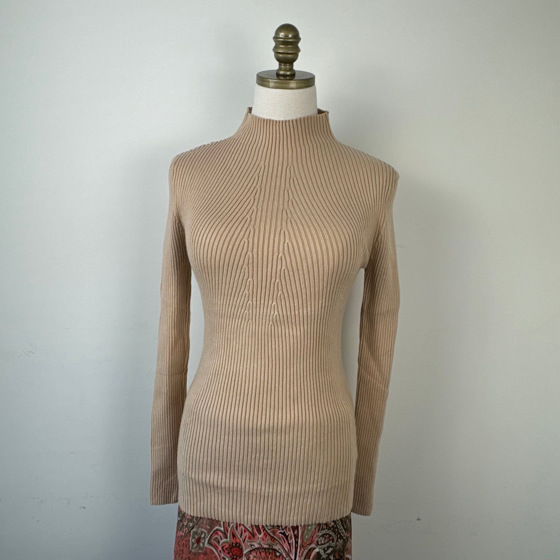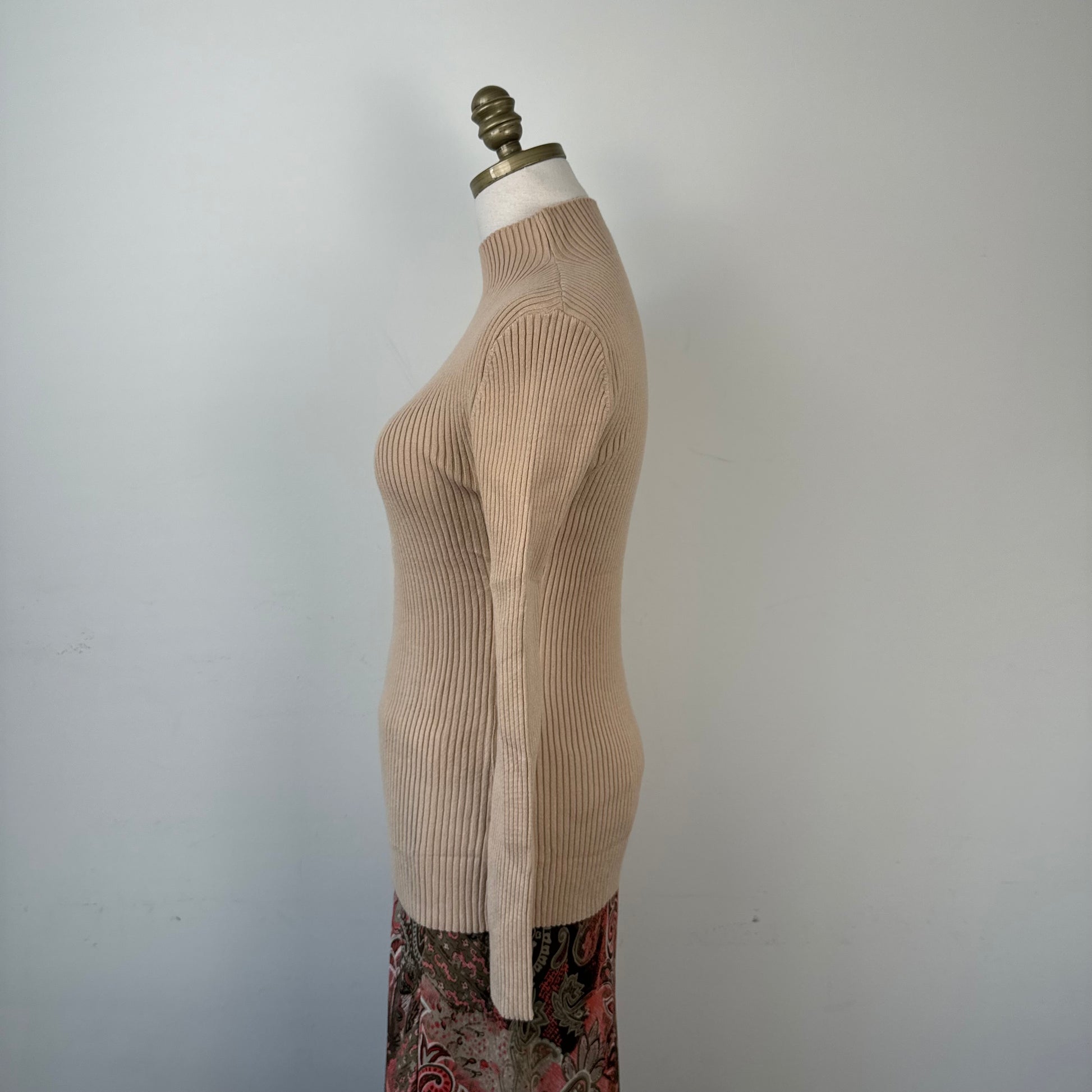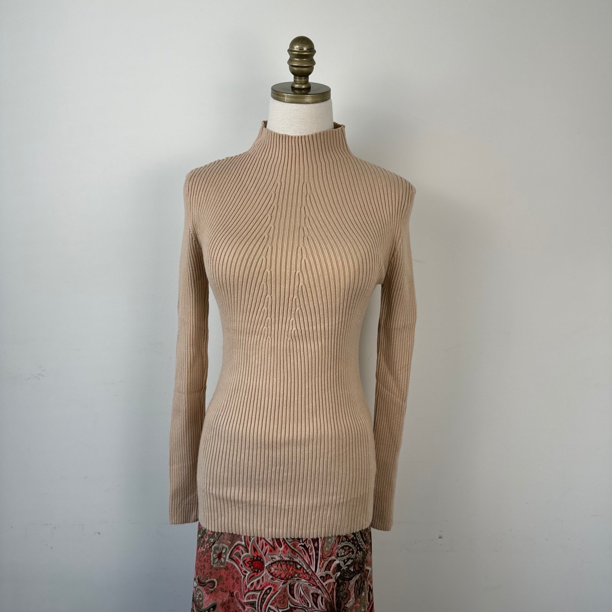 Fitted Beige Long Sleeve Mock Neck Sweater