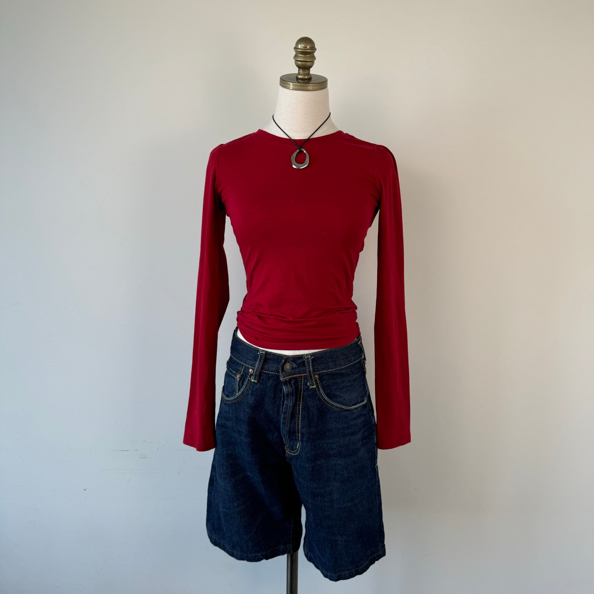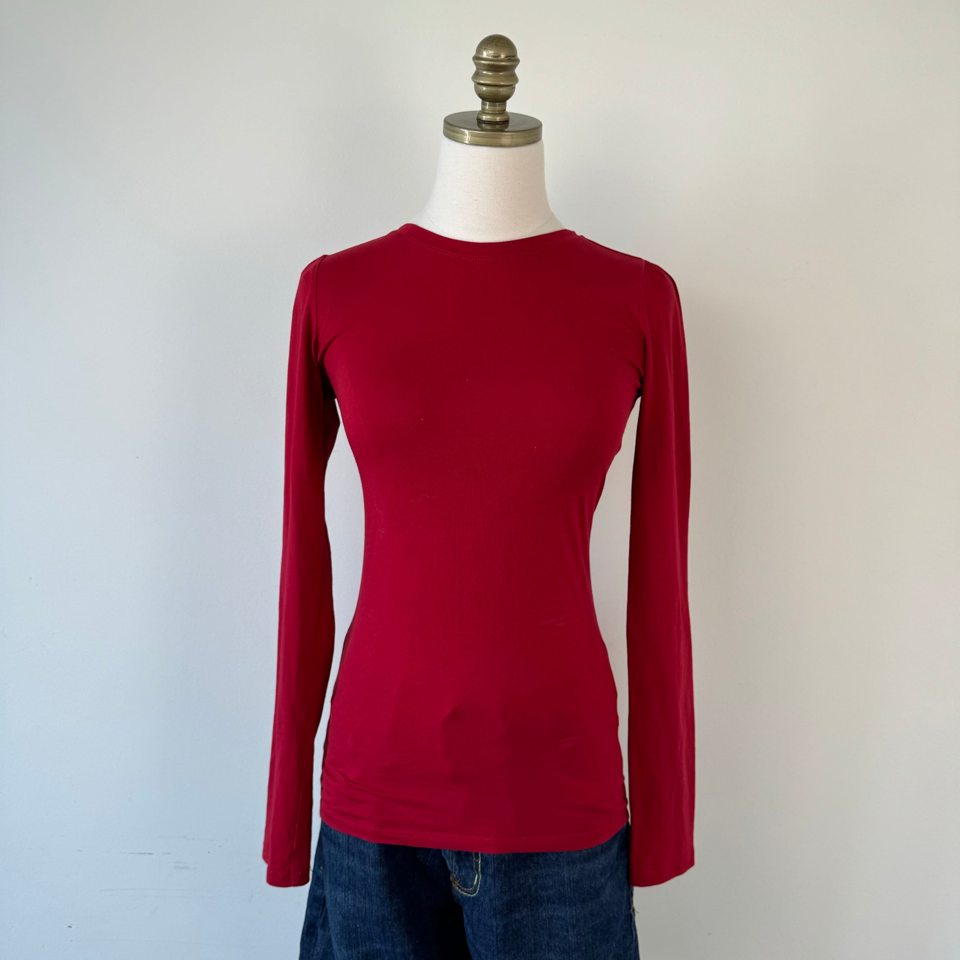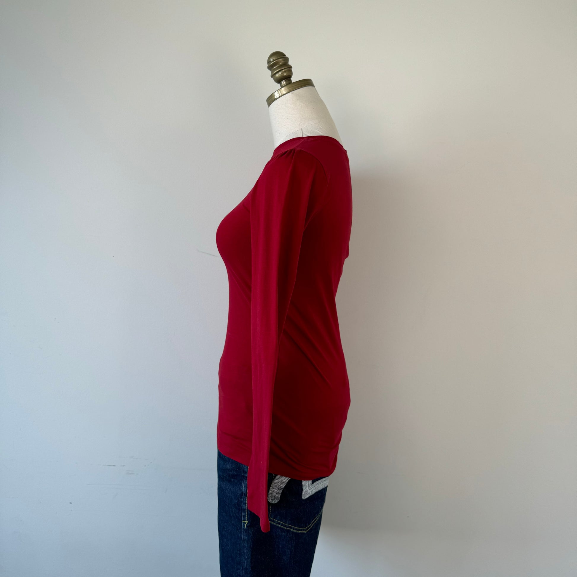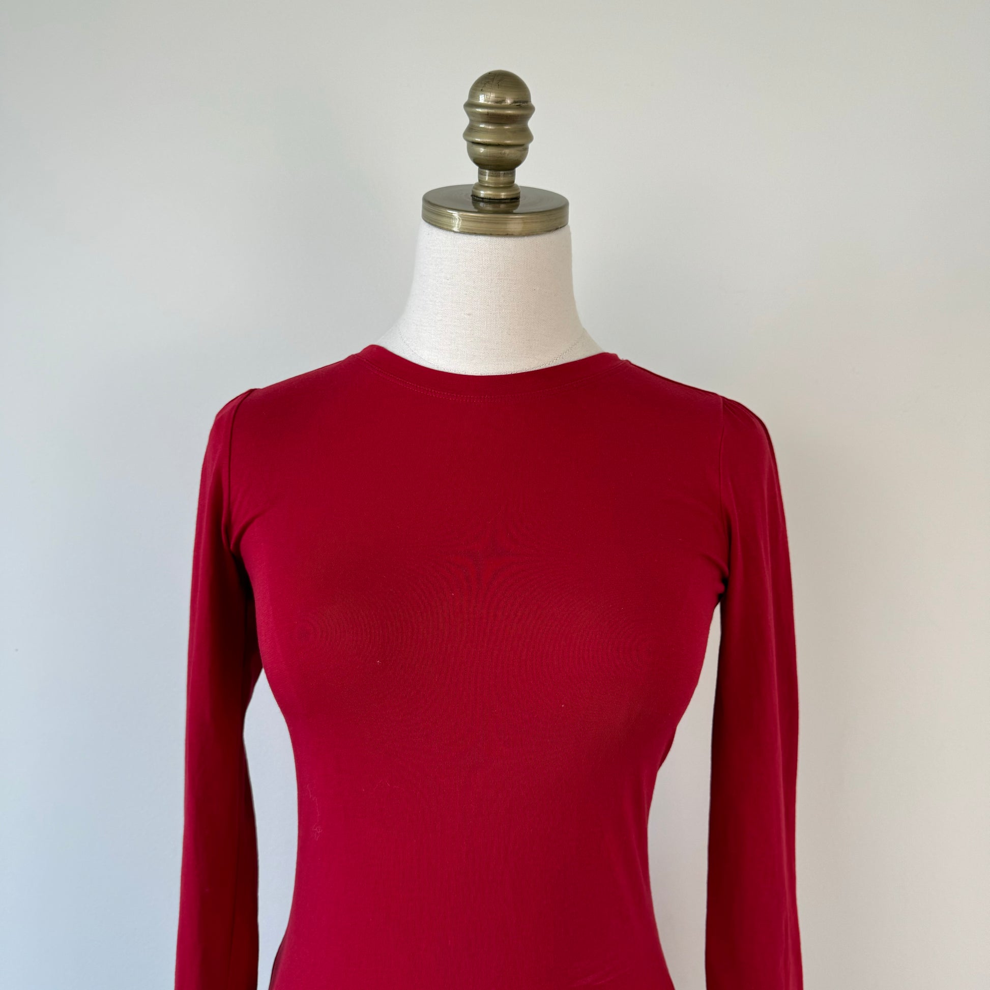 Details: Dark cherry red fitted long sleeve top with high neckline.