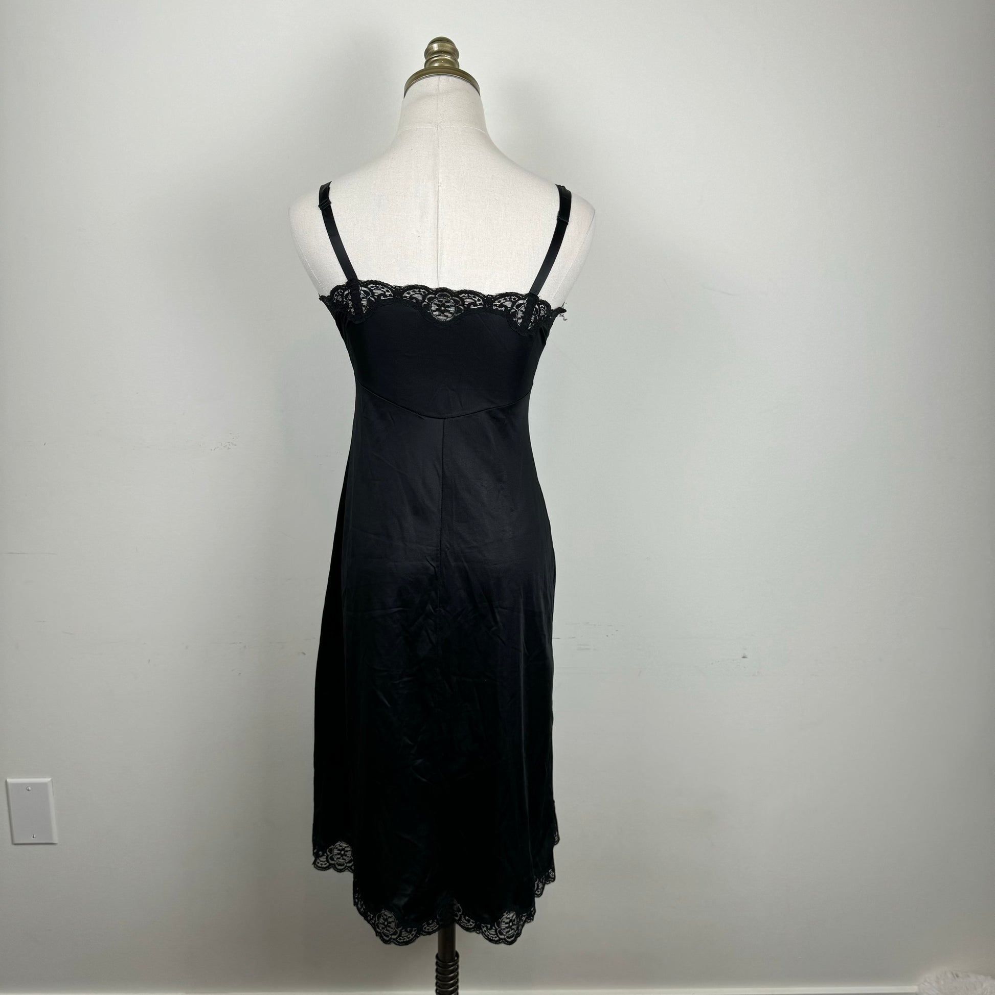 Details: Vintage black satin slip dress with lace trim, made of 100% nylon.