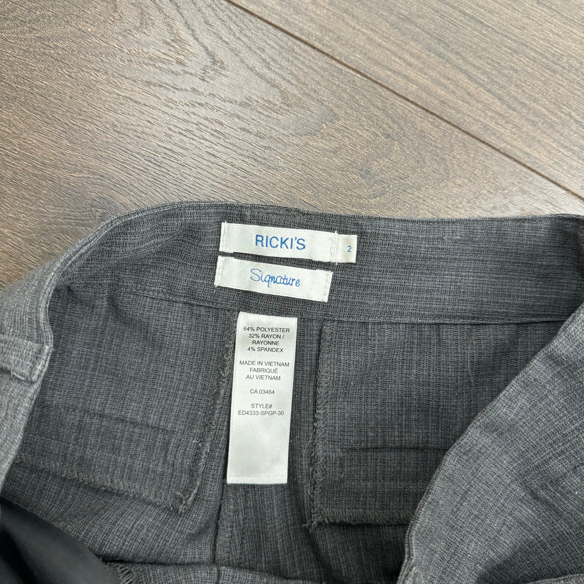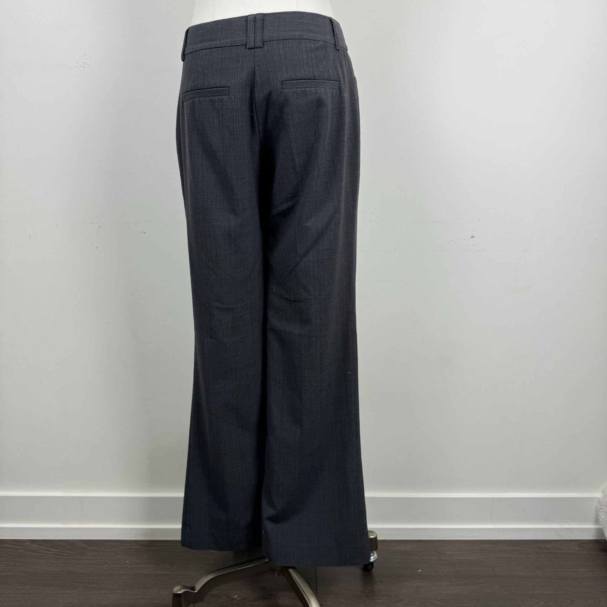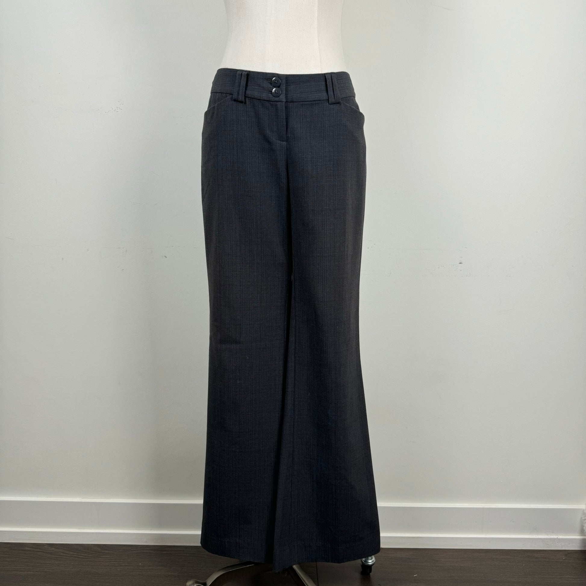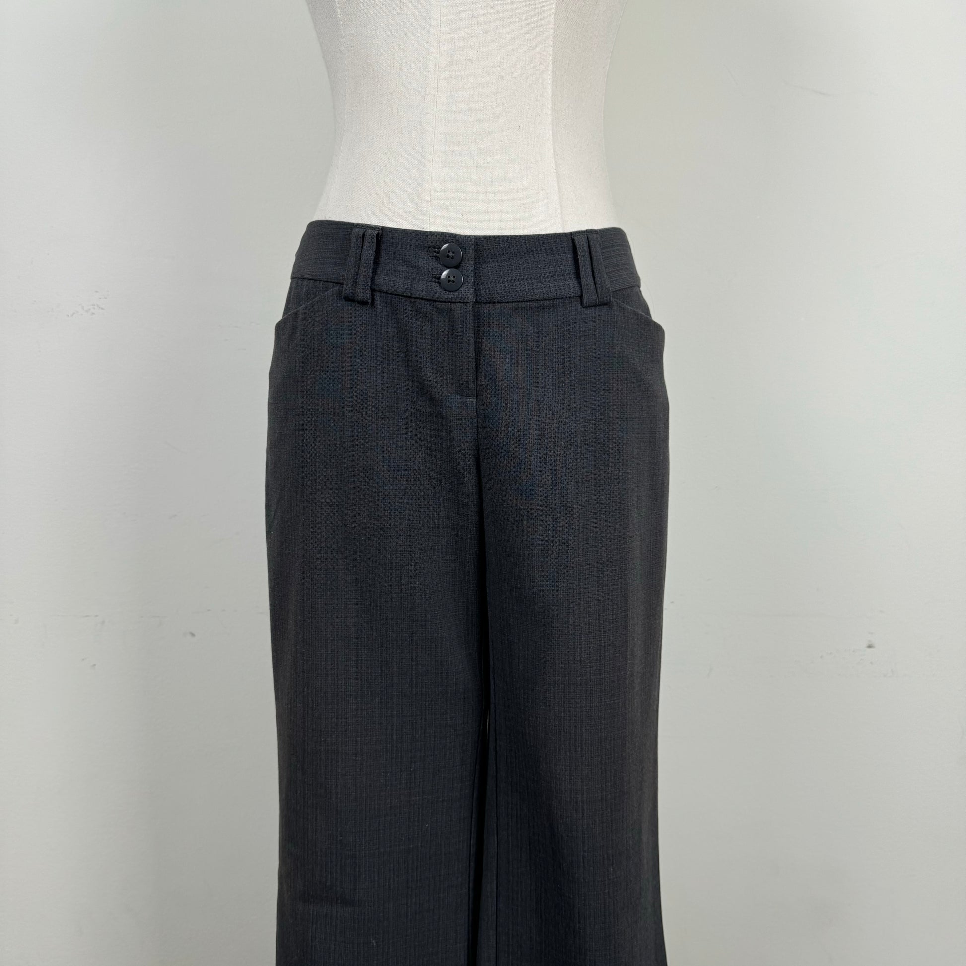 Details: Dark grey low rise flared office trousers with a siren style, featuring a waist of 28".