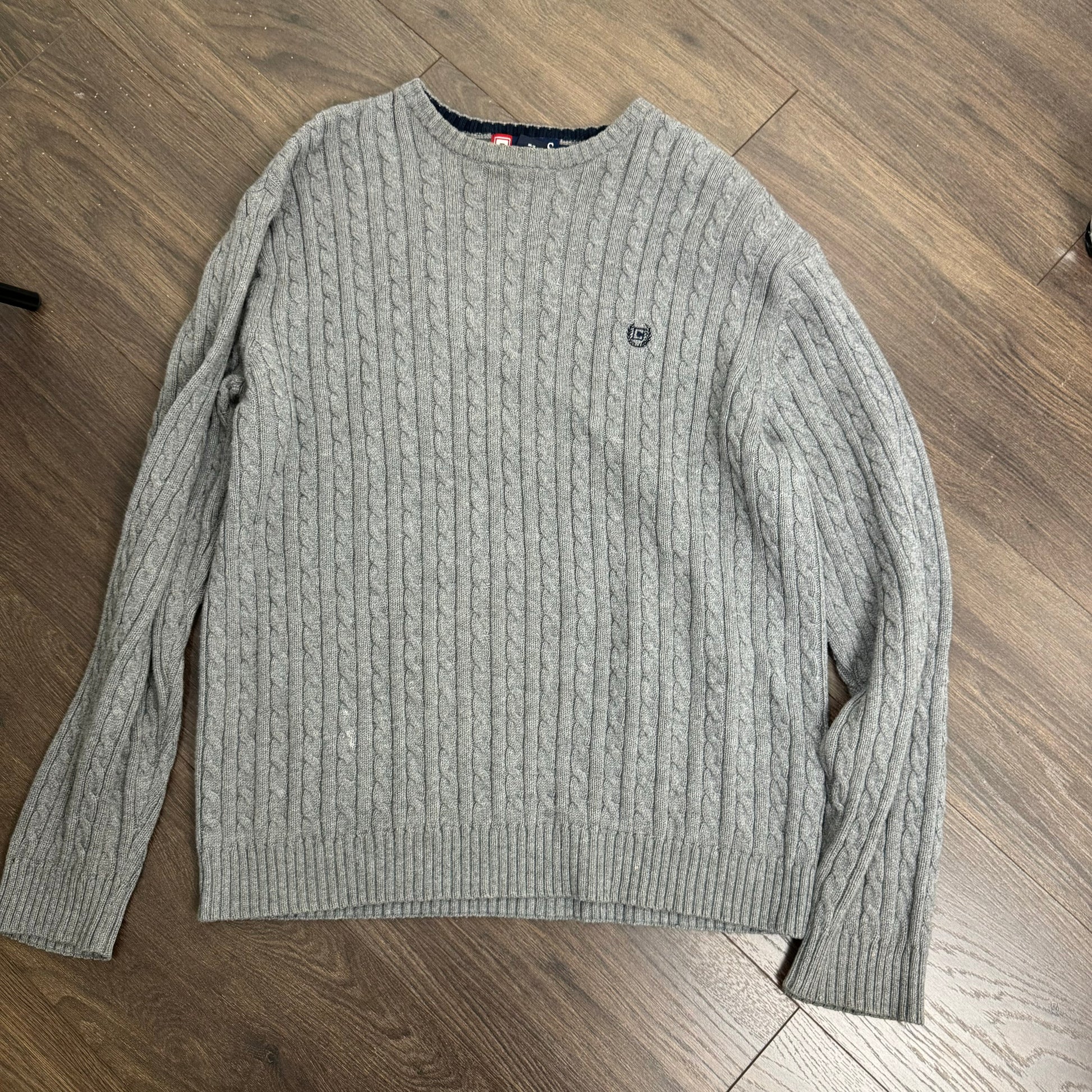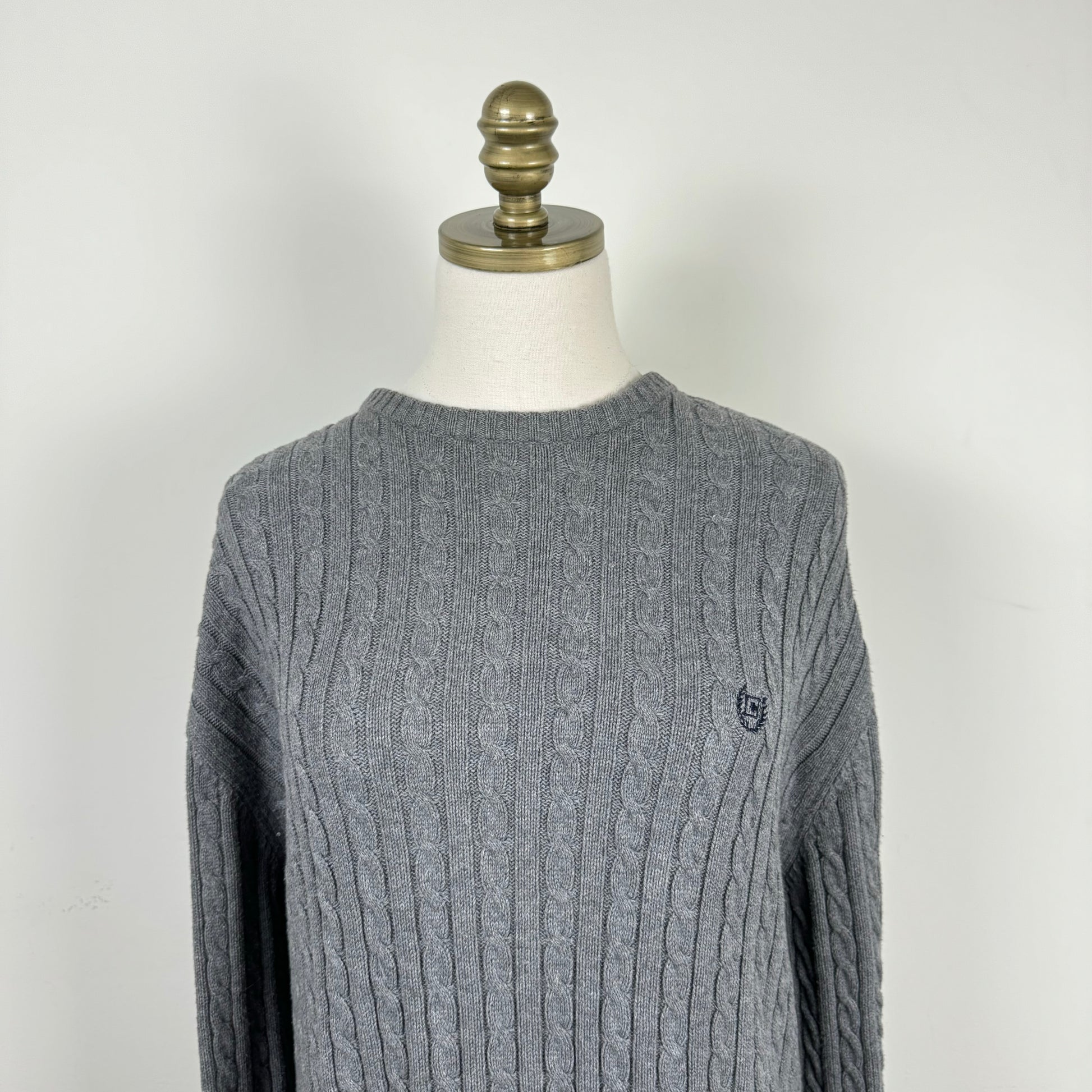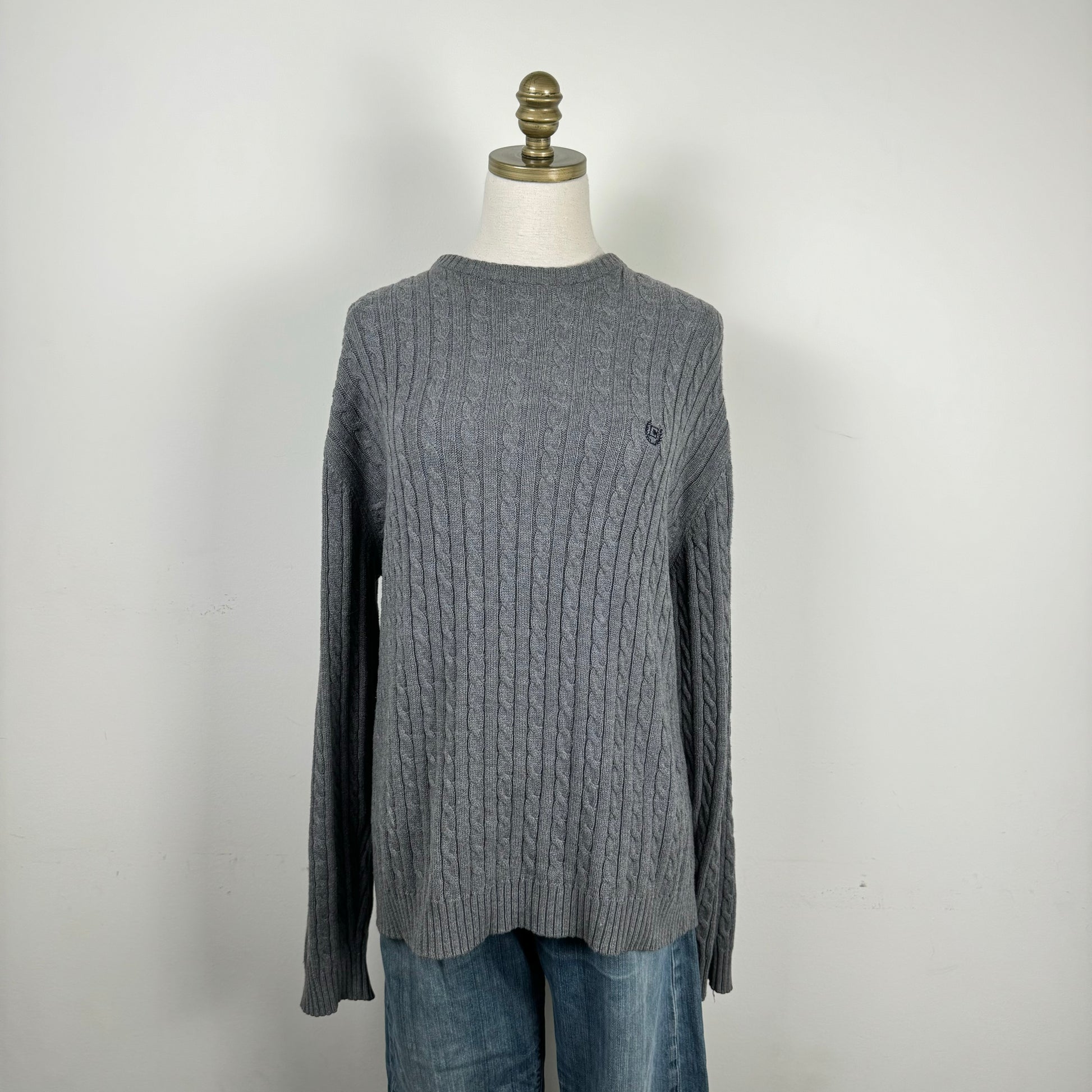 Details: Grey oversized cable knit sweater.