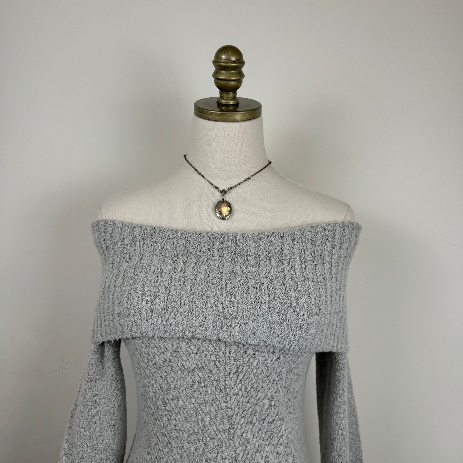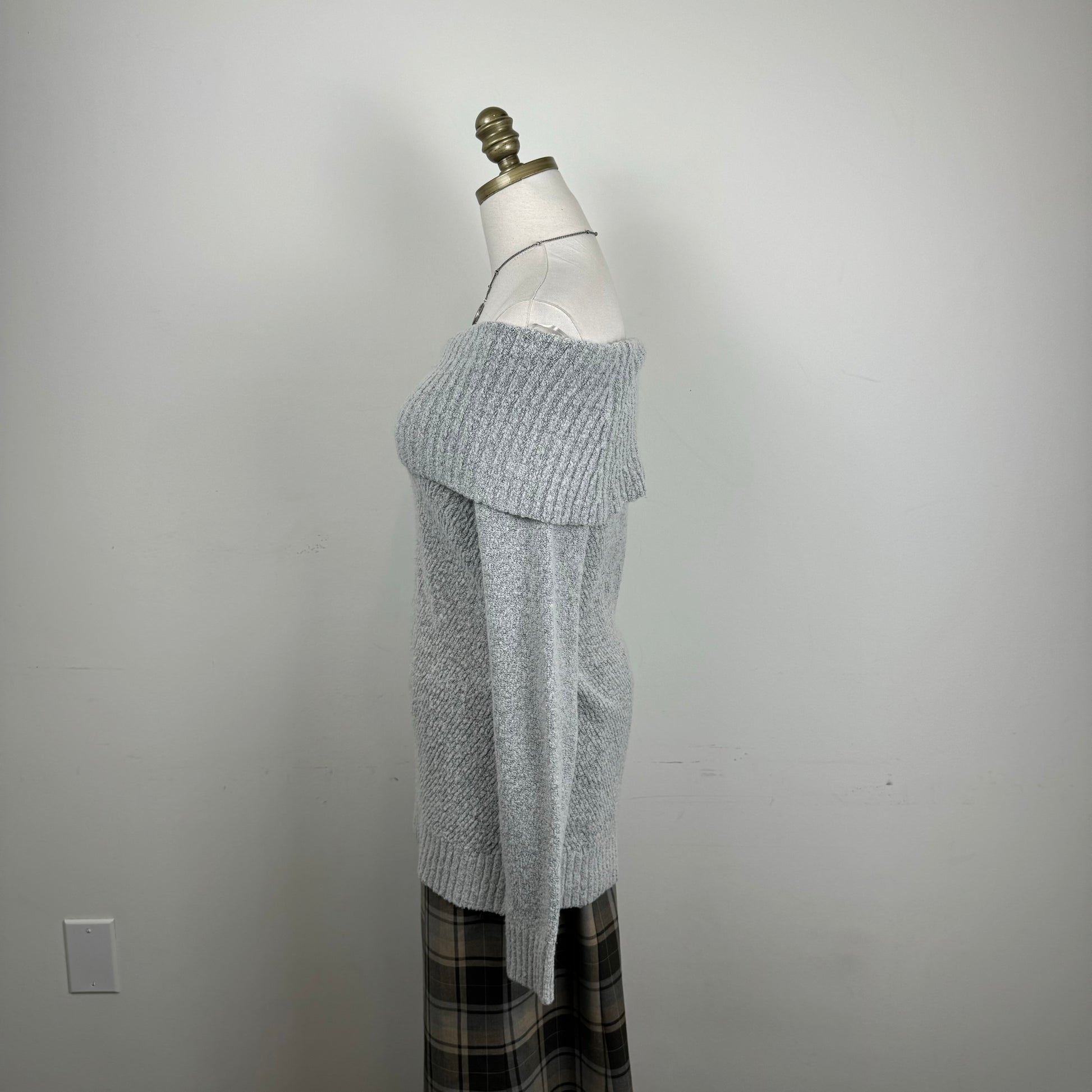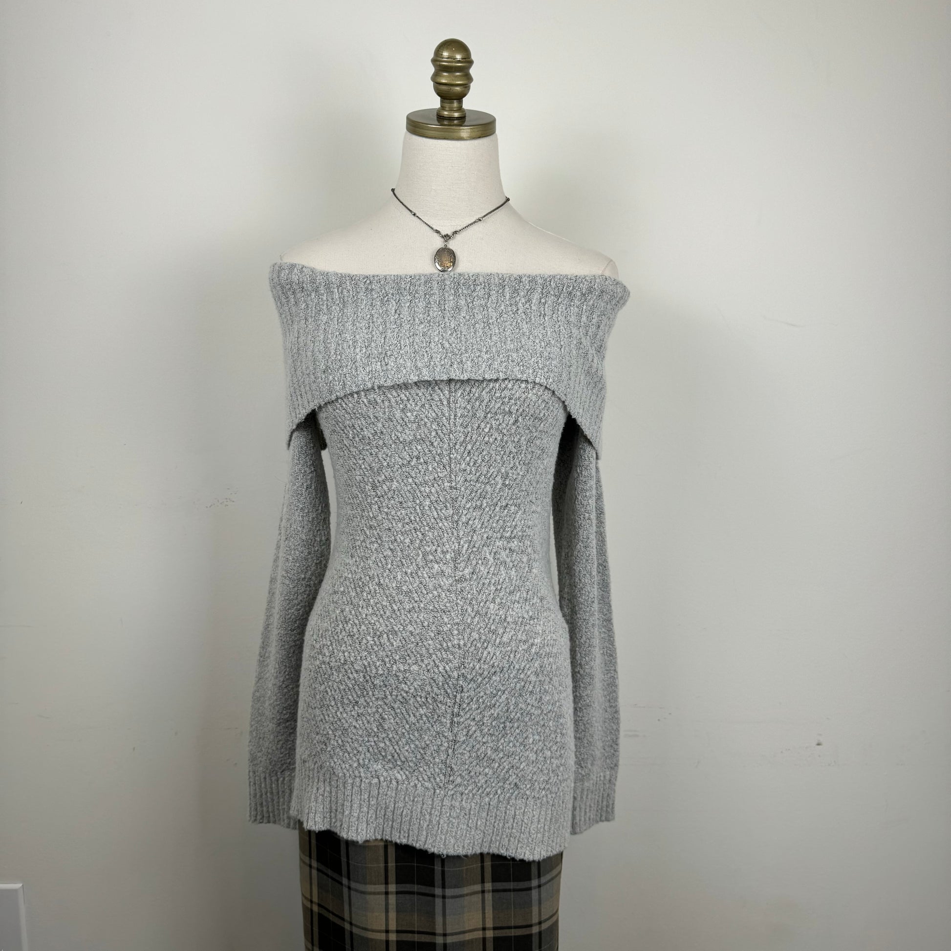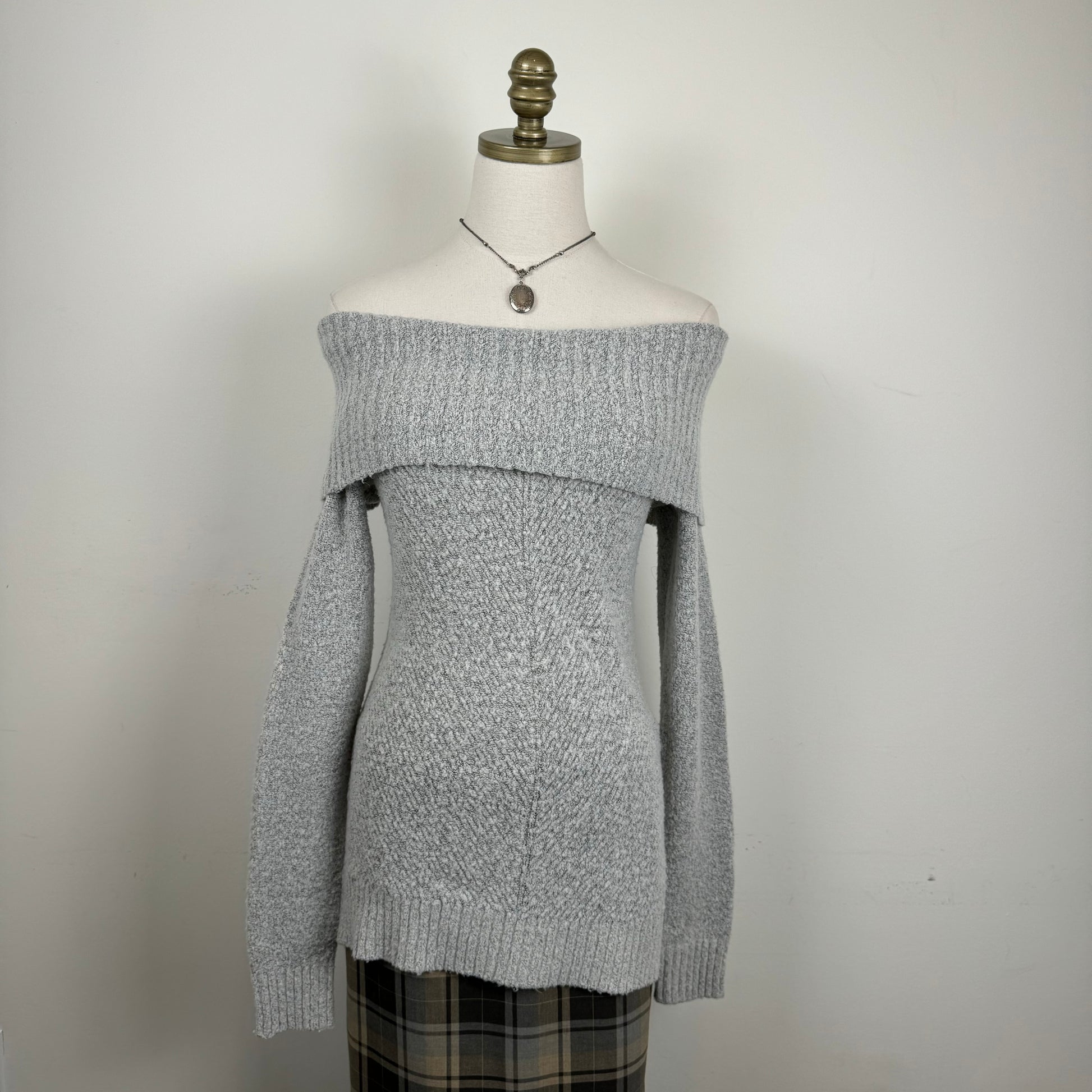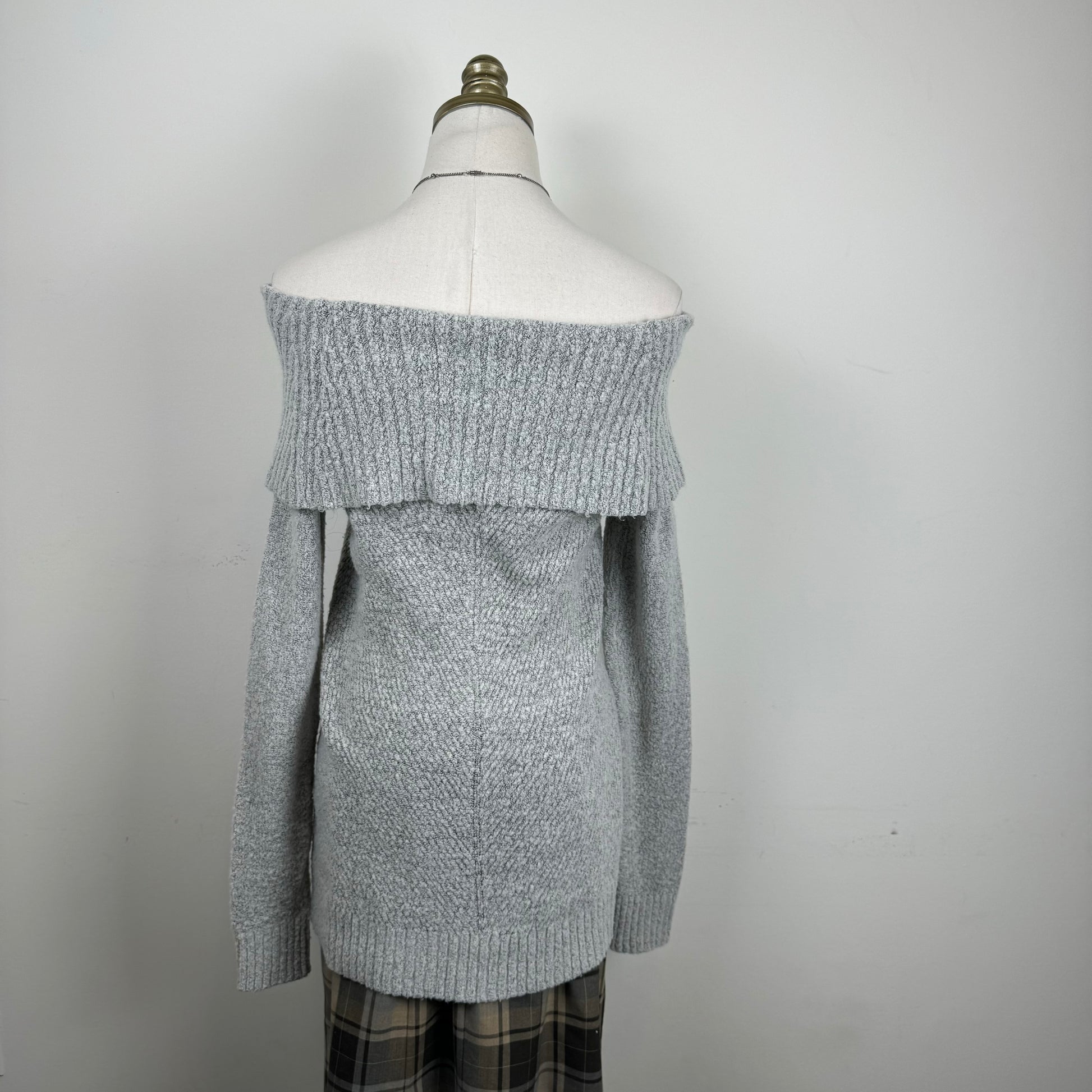 Details: White/grey off-shoulder soft knit fitted sweater.