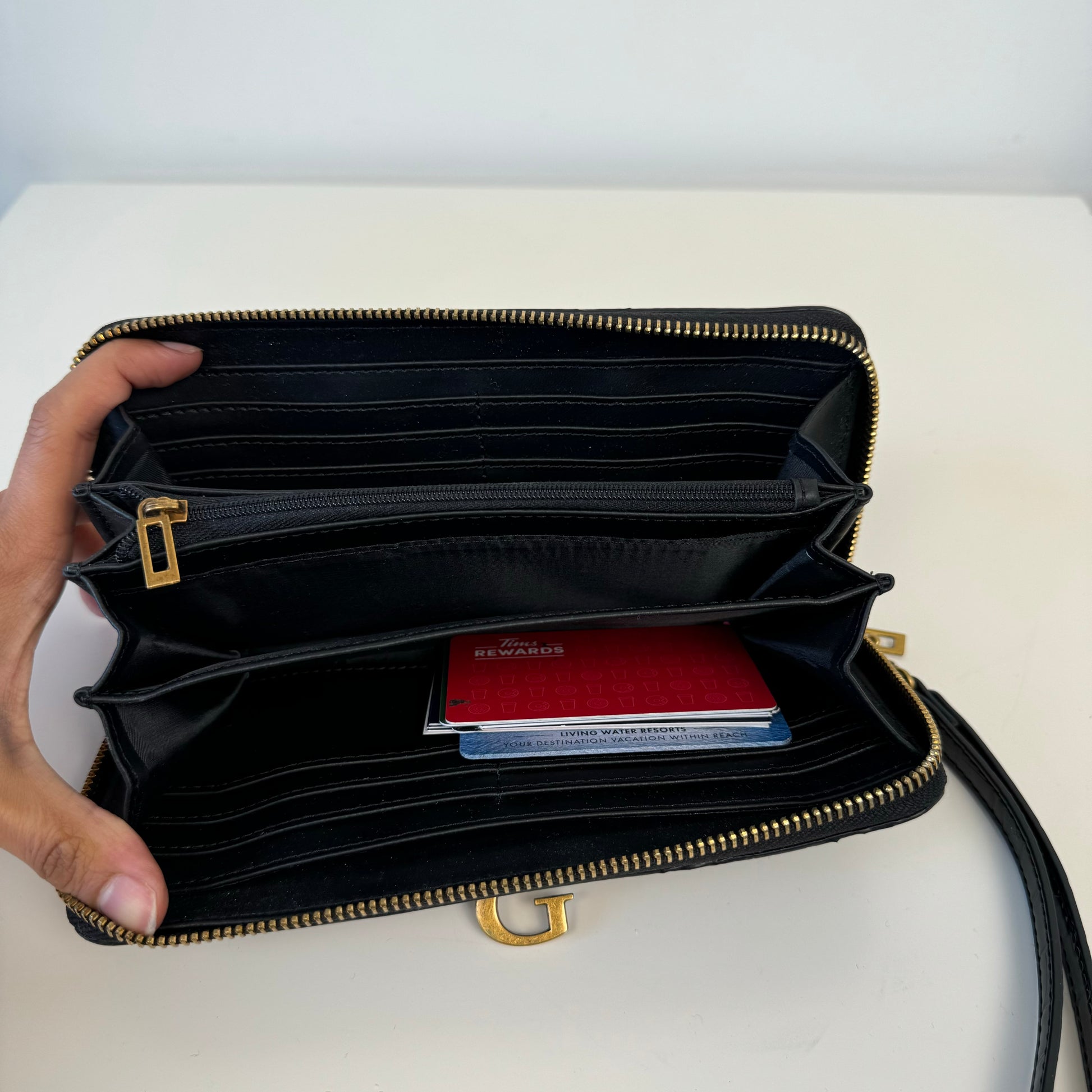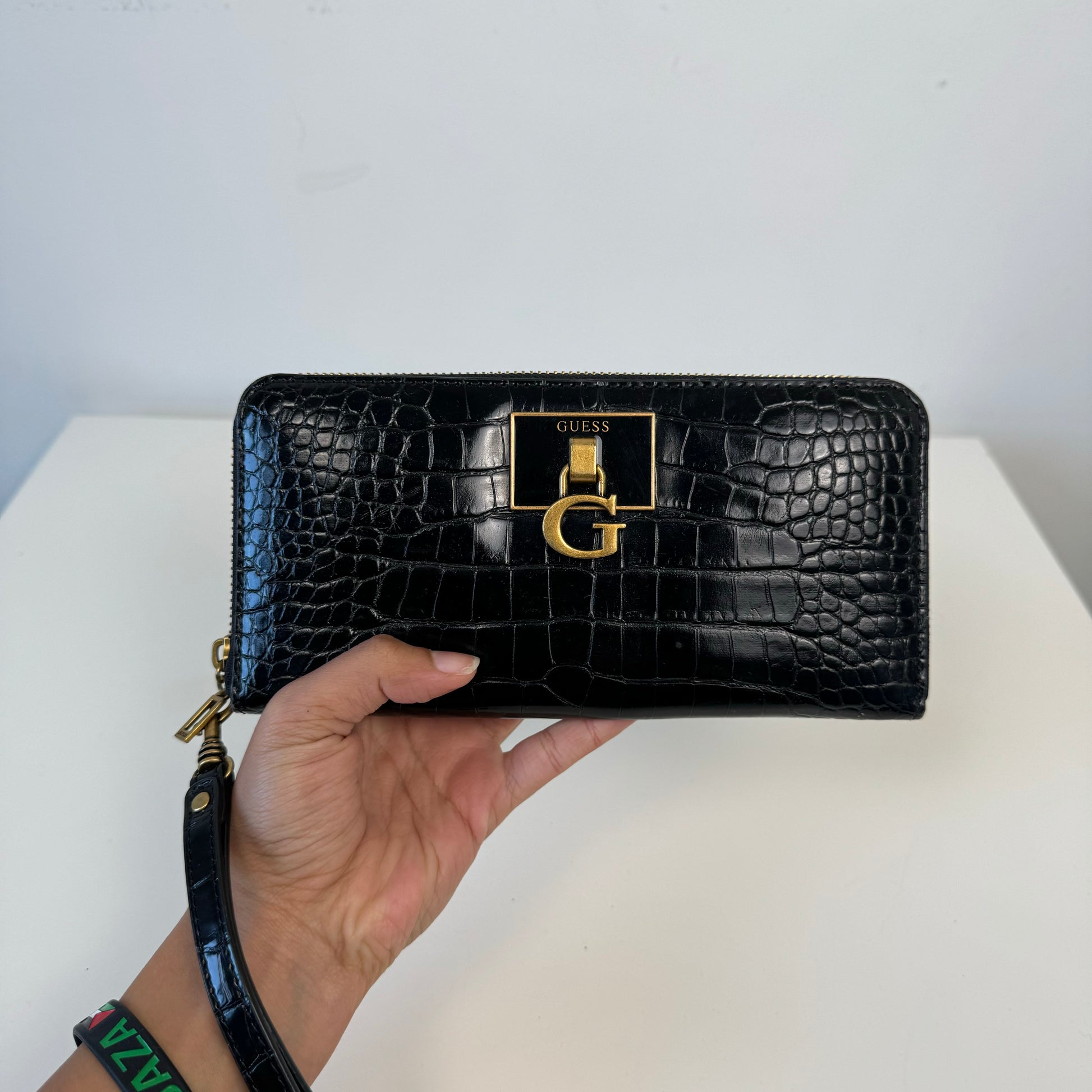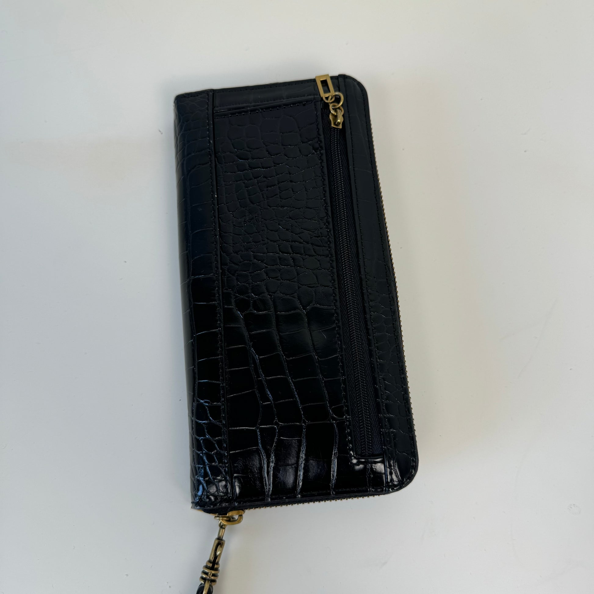 Details: Black faux crocodile faux leather wallet with gold hardware and wristlet holder.