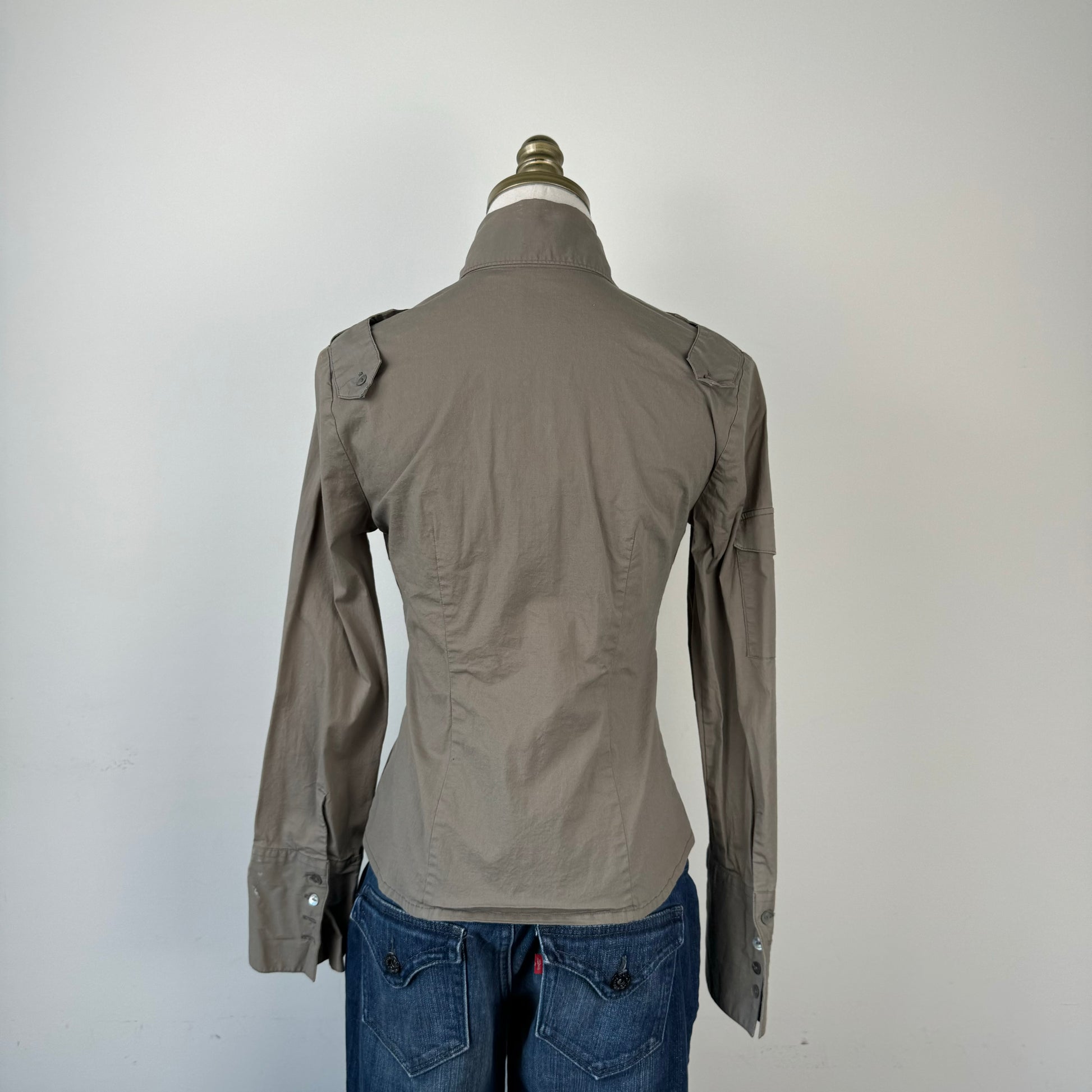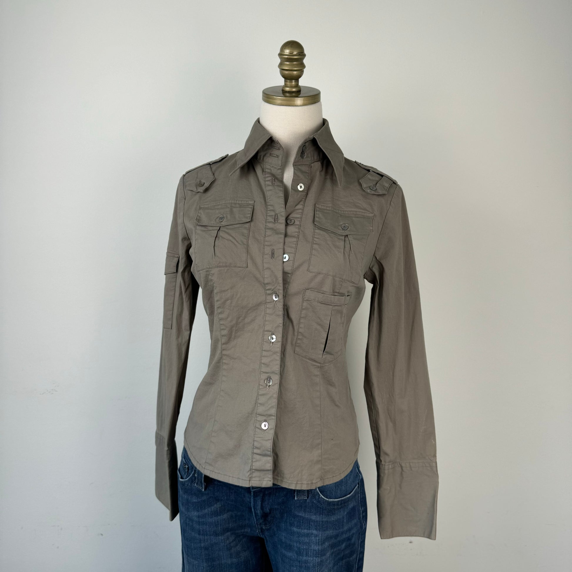 Details: Vintage fitted button-up shirt in khaki/olive green with utility style detailing.