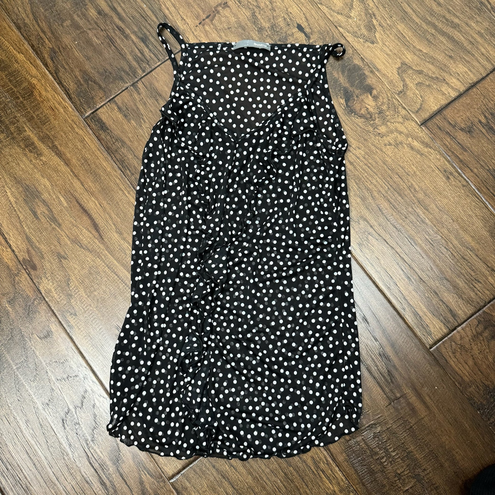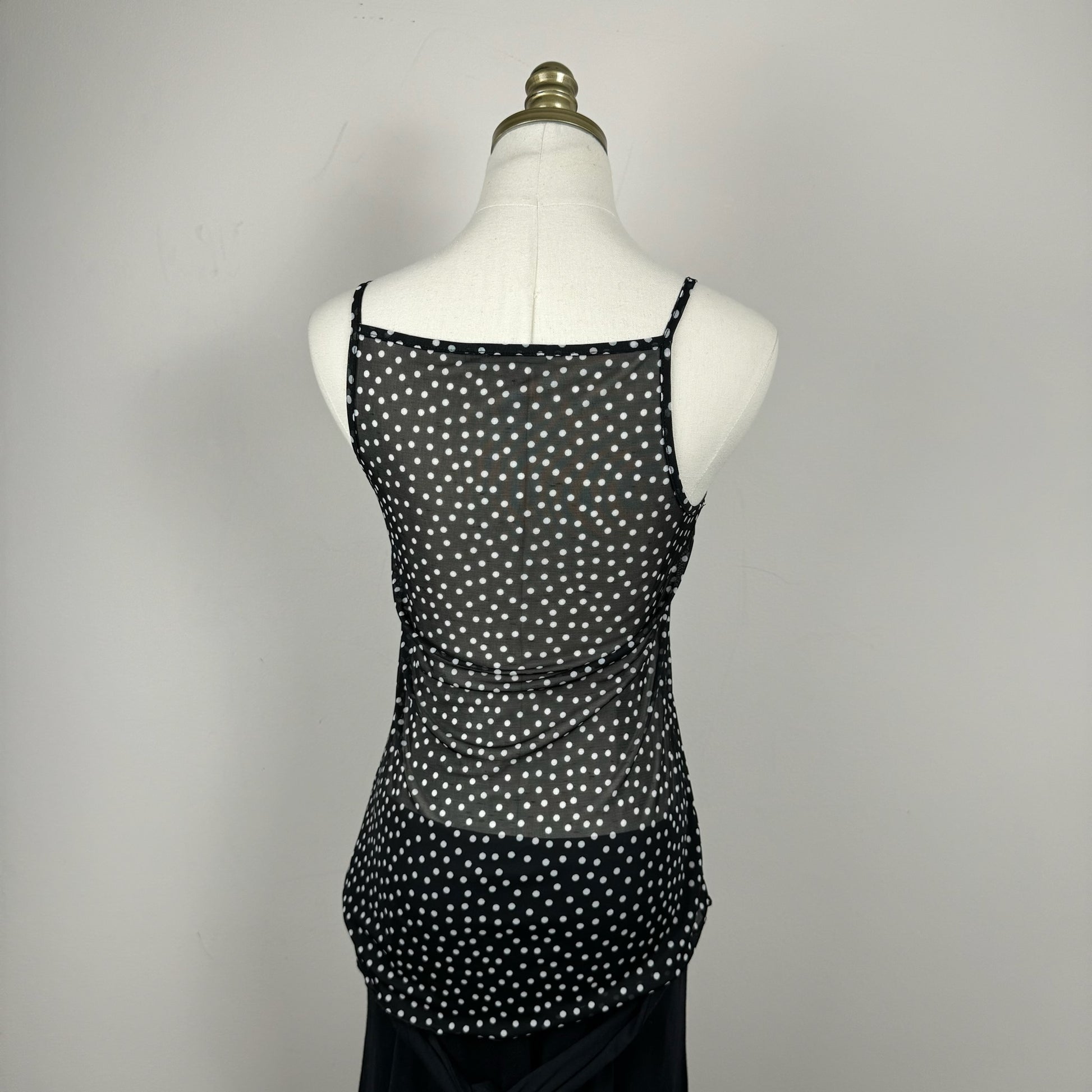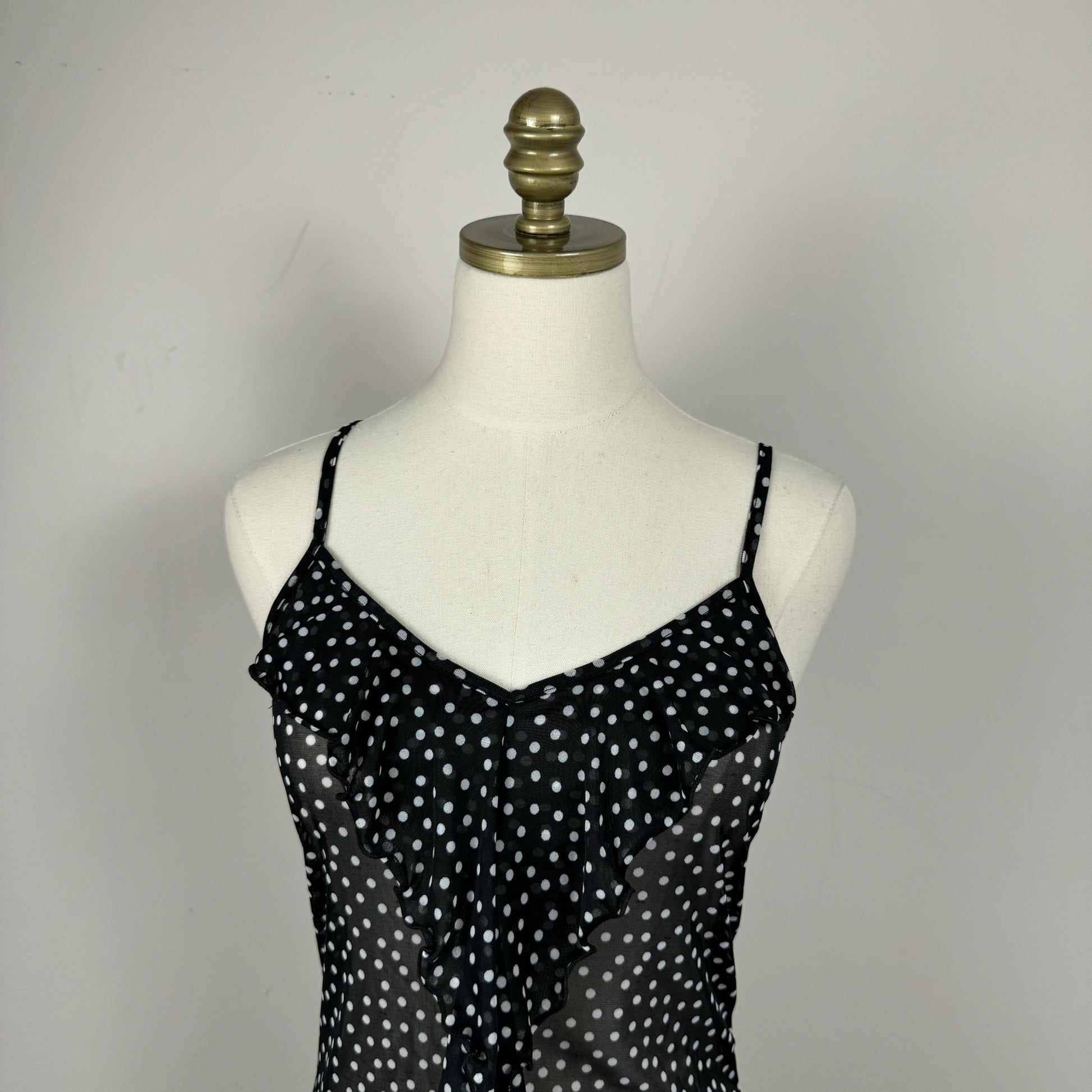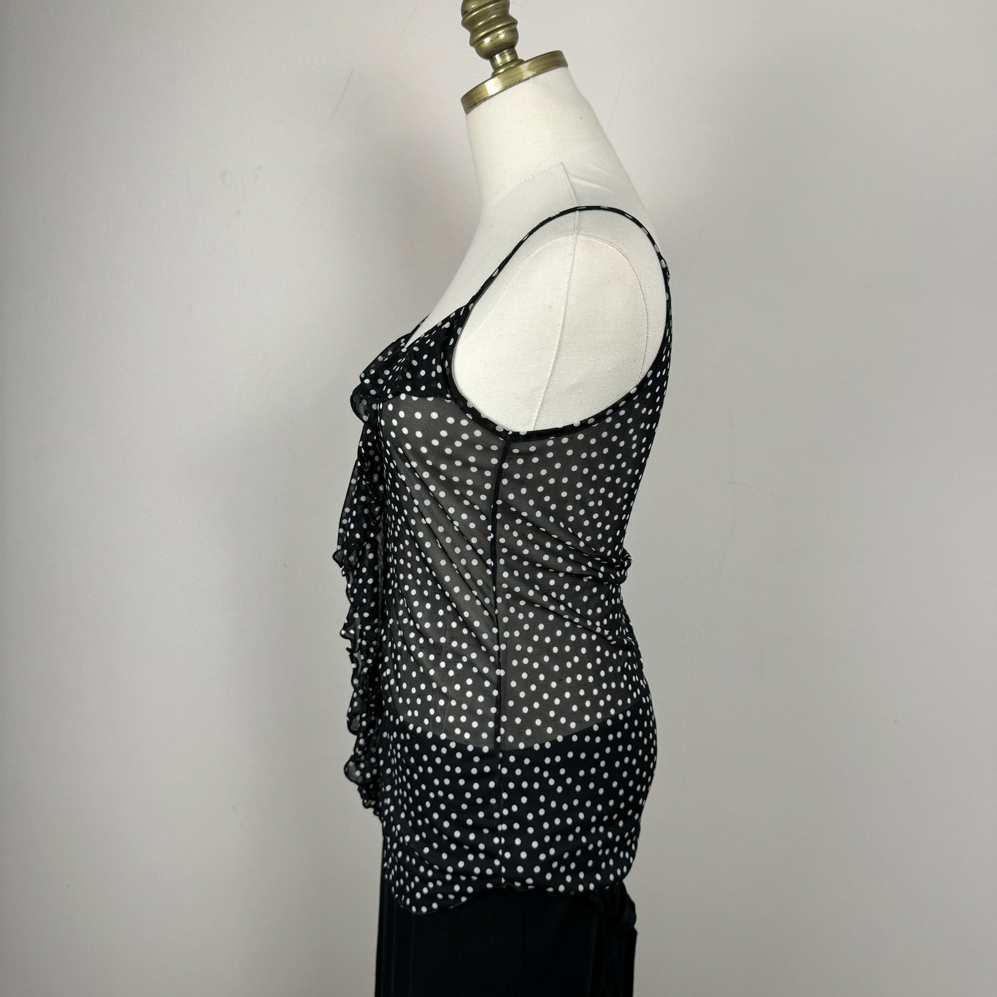 Details: Y2K semi-sheer black polka dot mesh top with ruffled details.