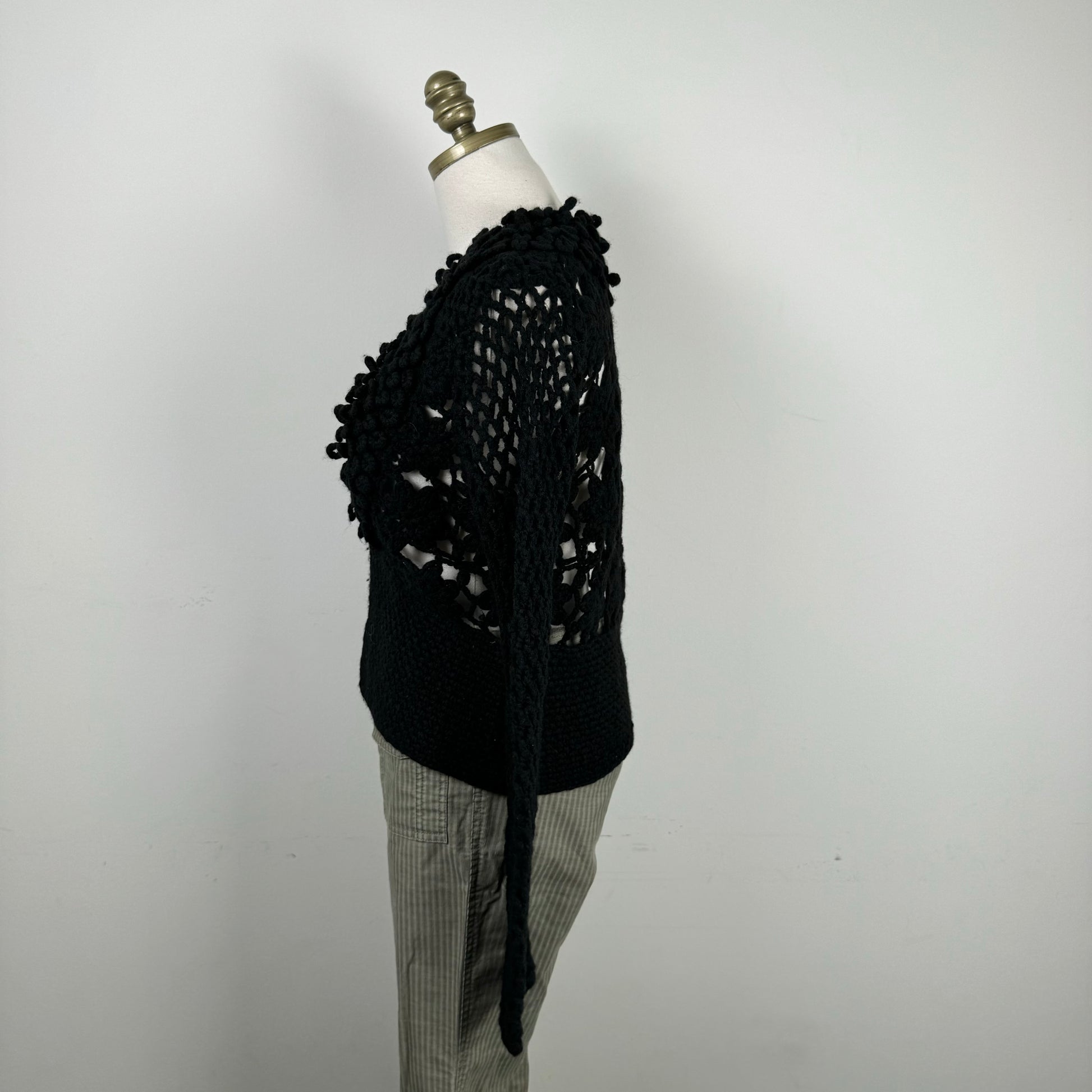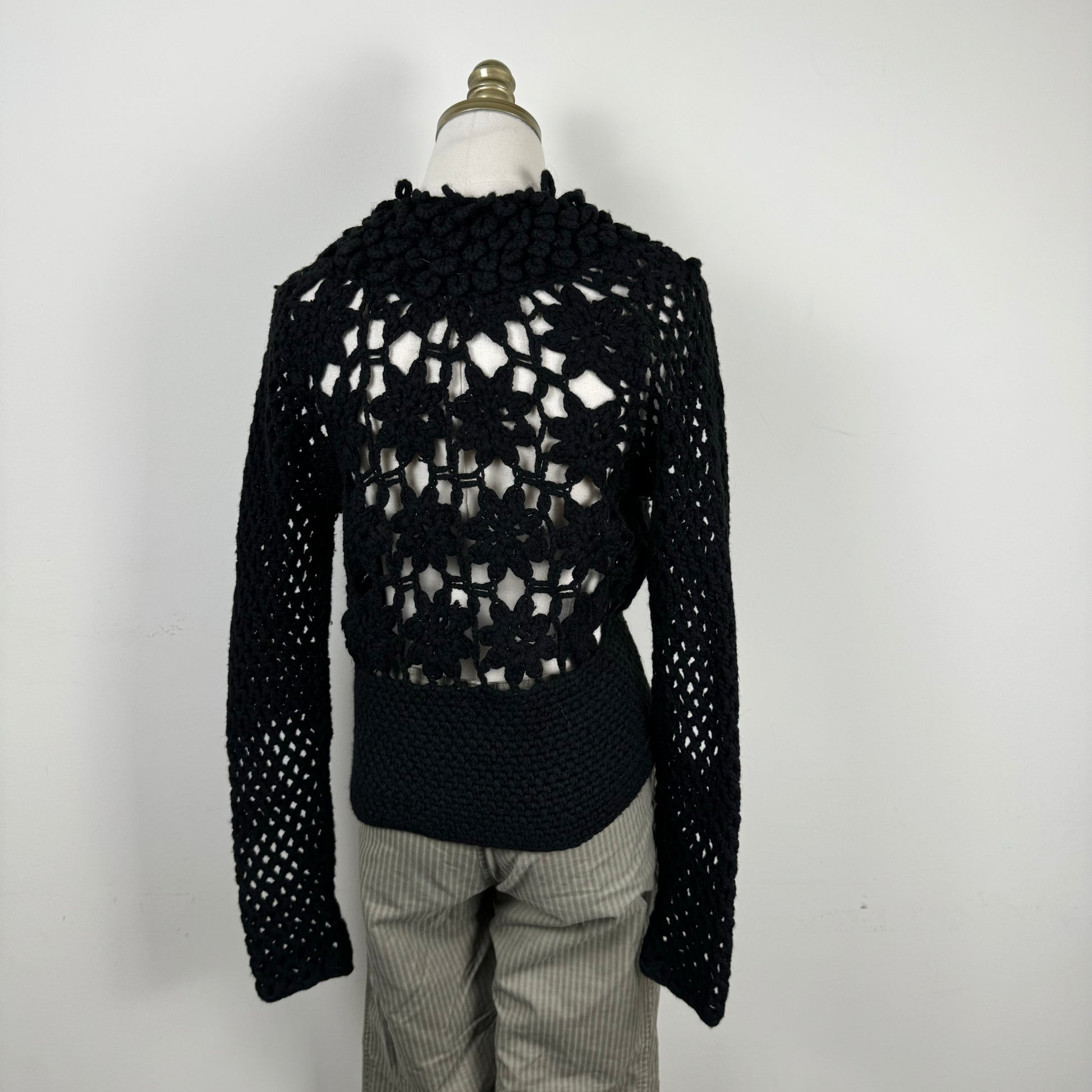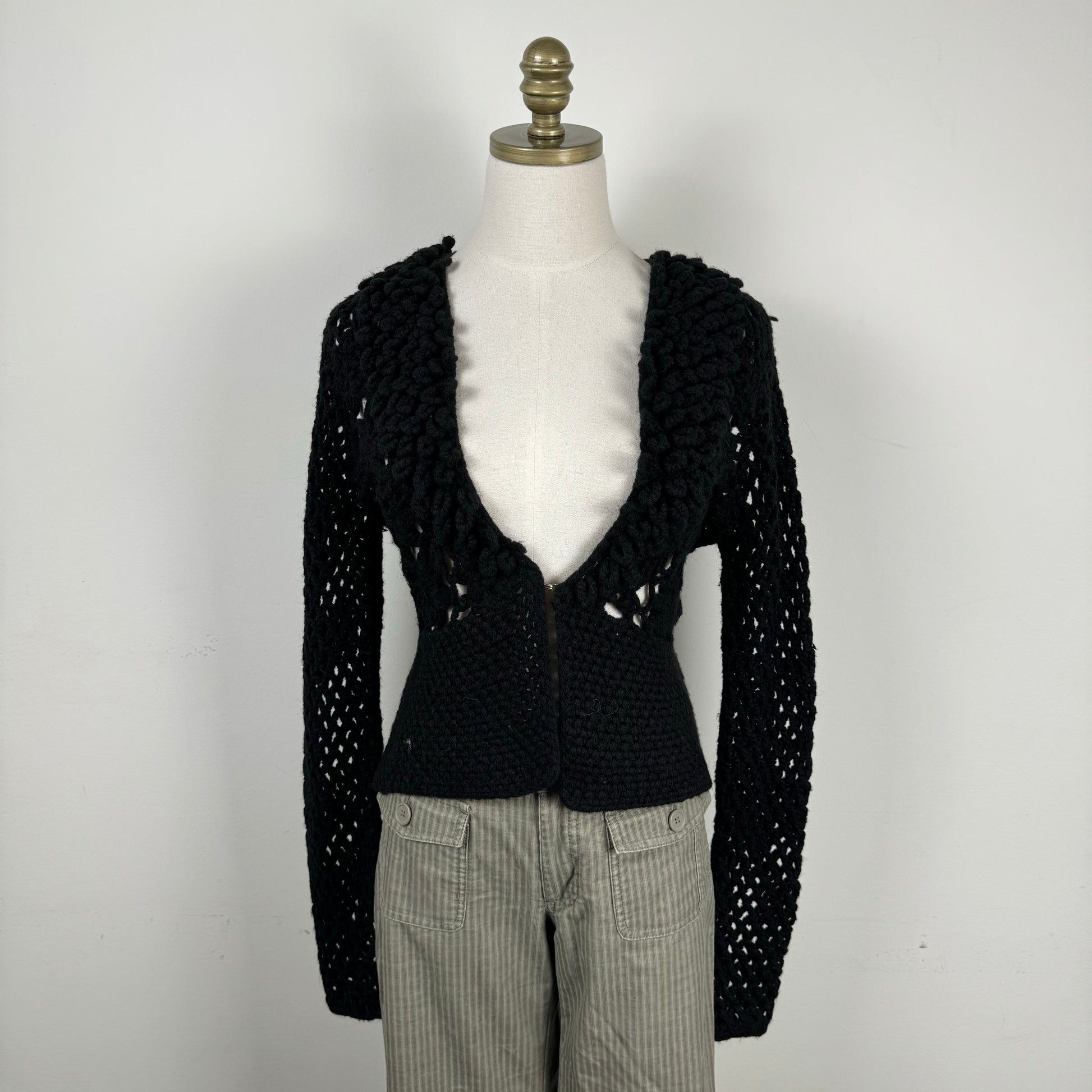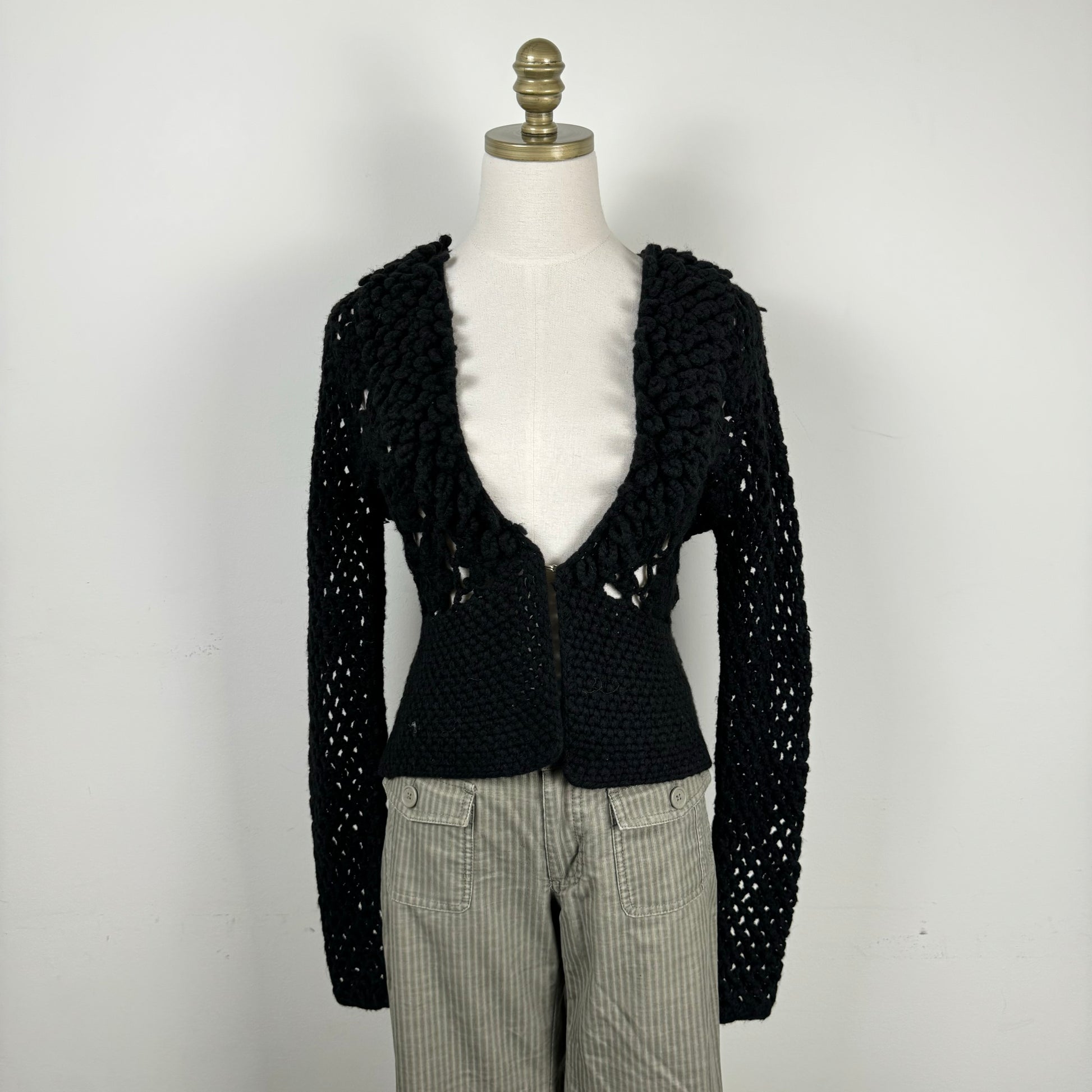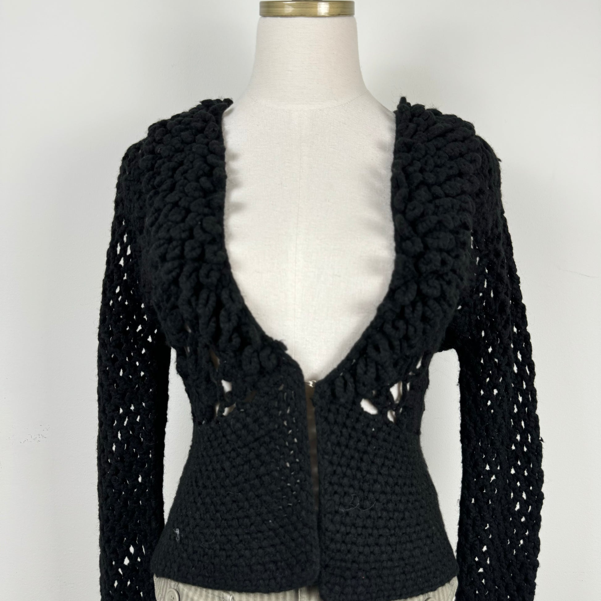 Details: Black open front crochet knit sweater with clasp detail.