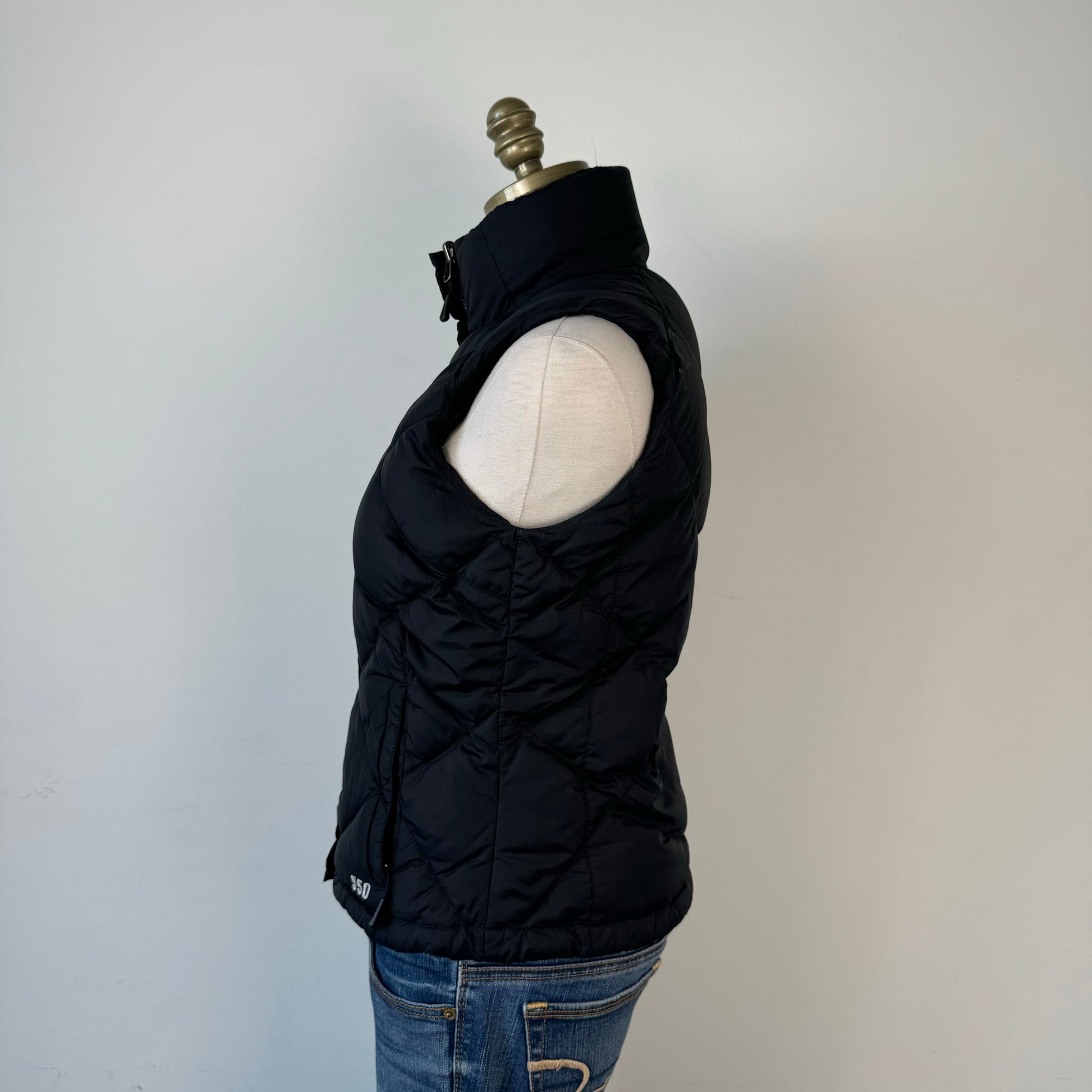 Details: Black puffer zip-up vest.