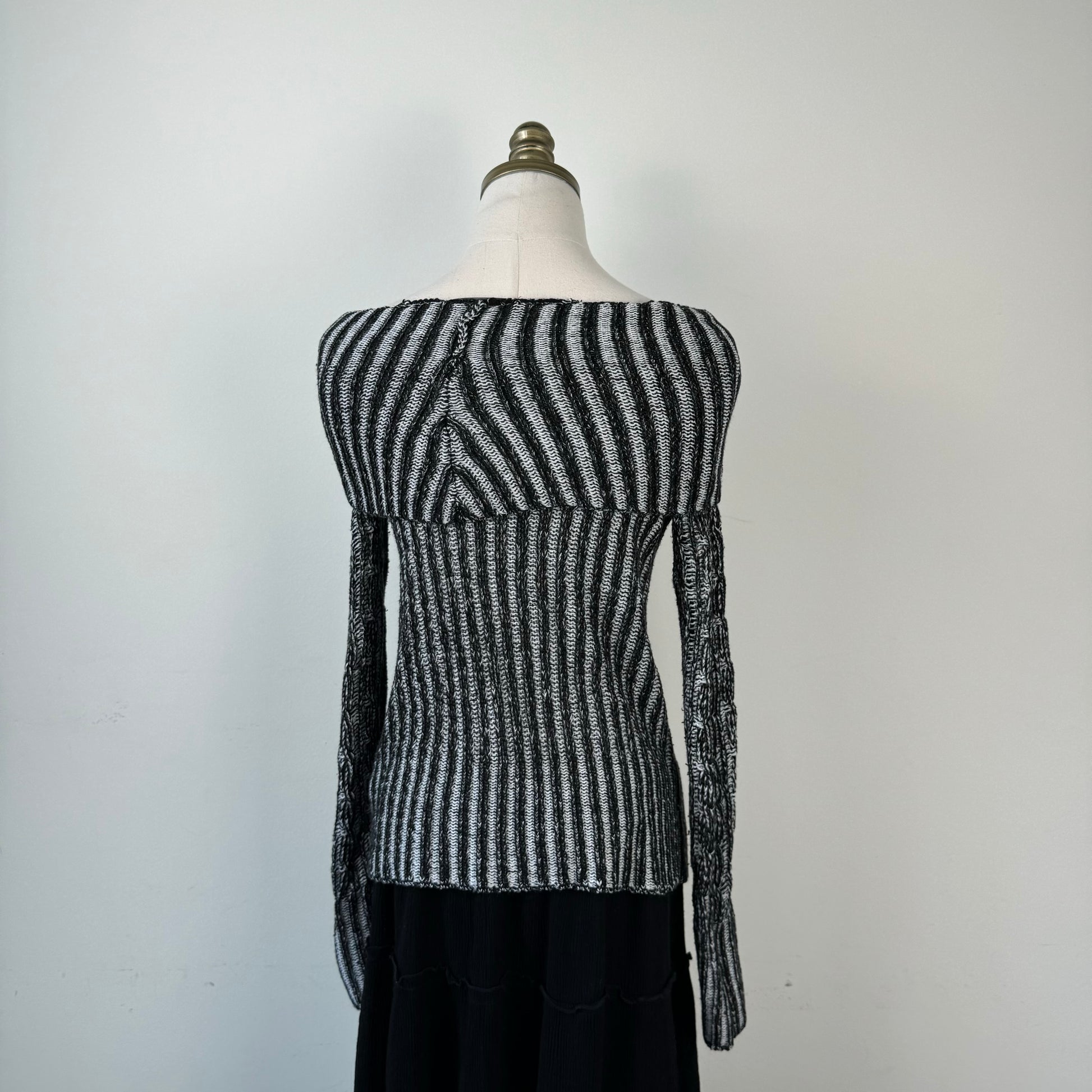 Details: Off-the-shoulder striped two-tone ribbed knit sweater in black and grey.
