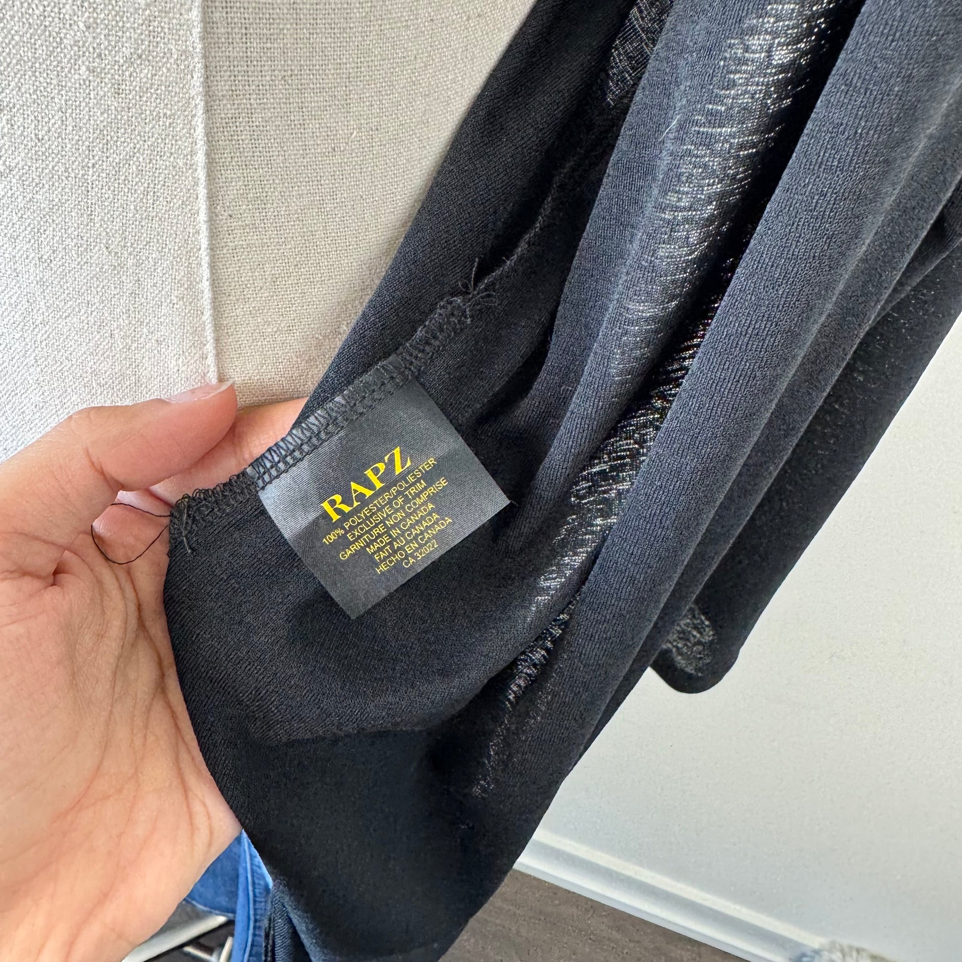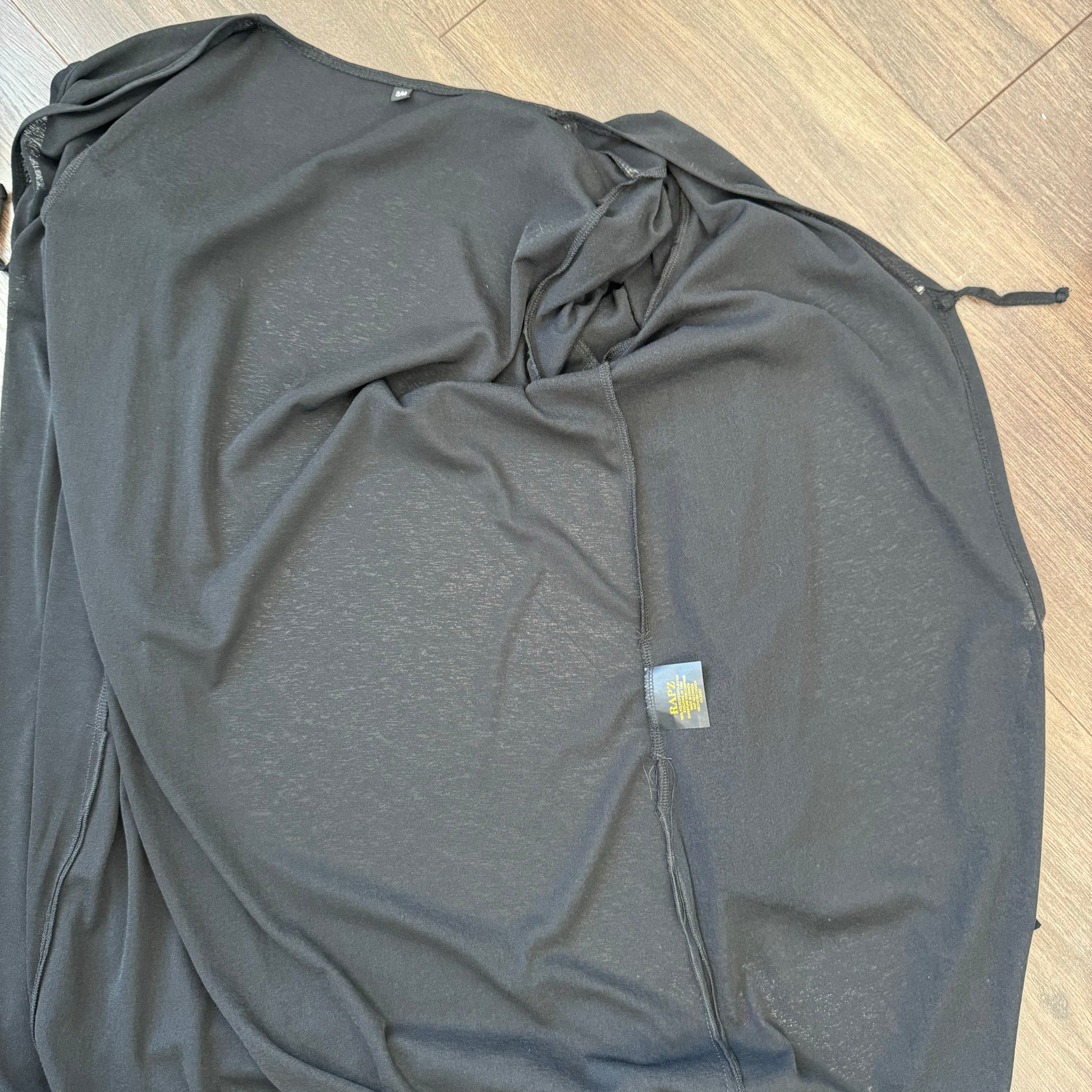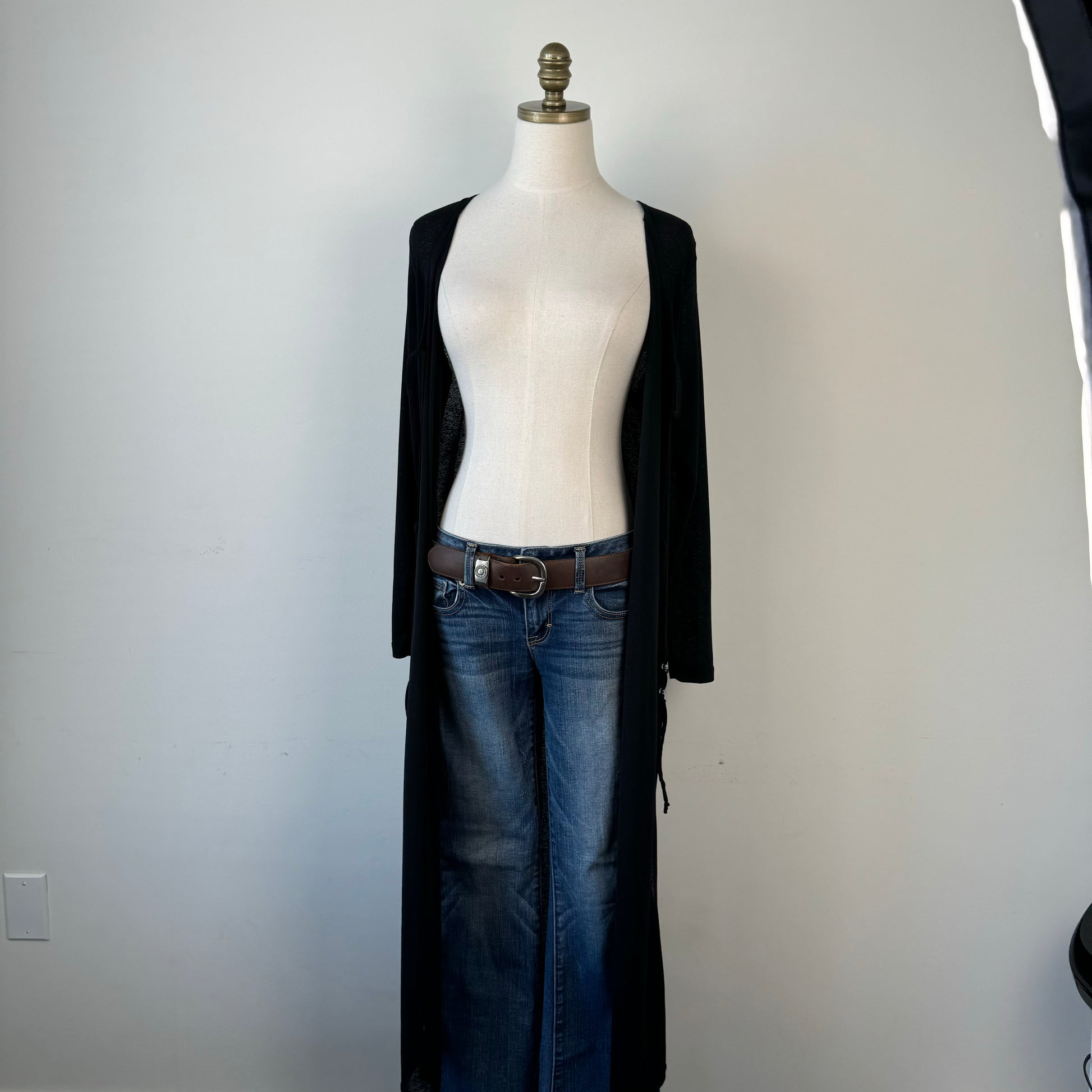 Details: Black semi-sheer mesh open front tie-up maxi cardigan.