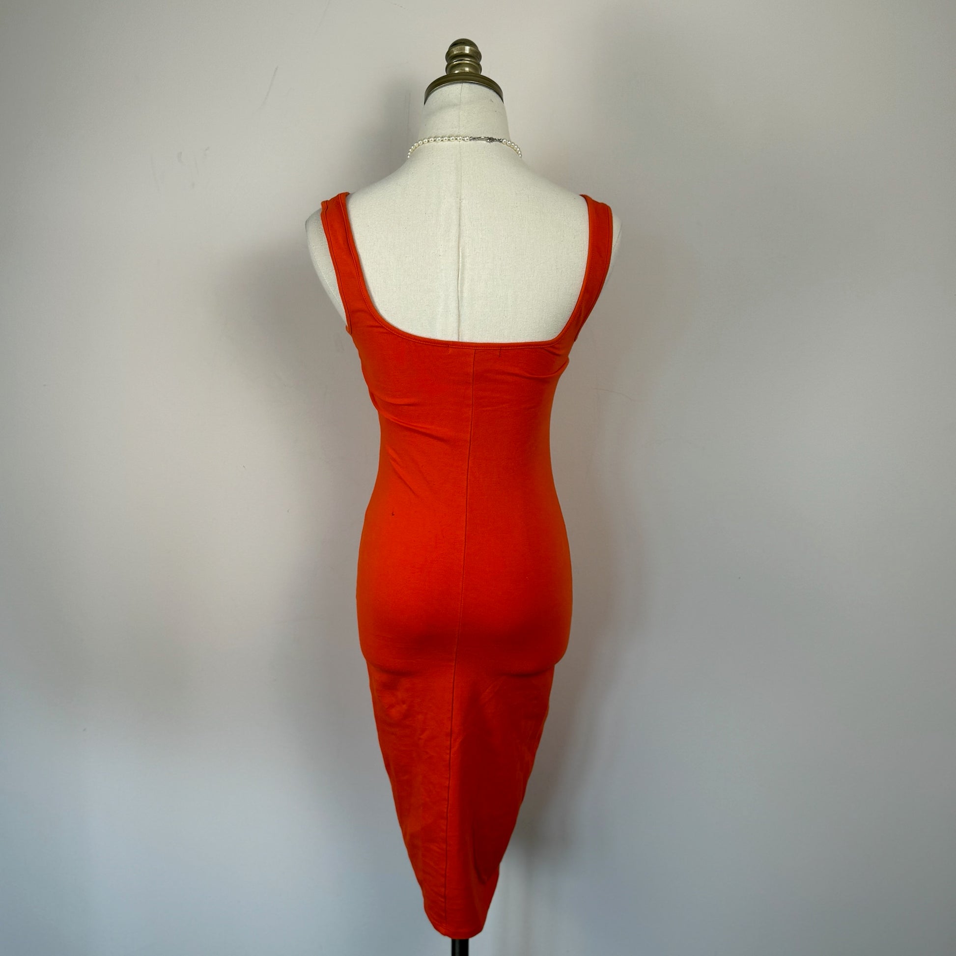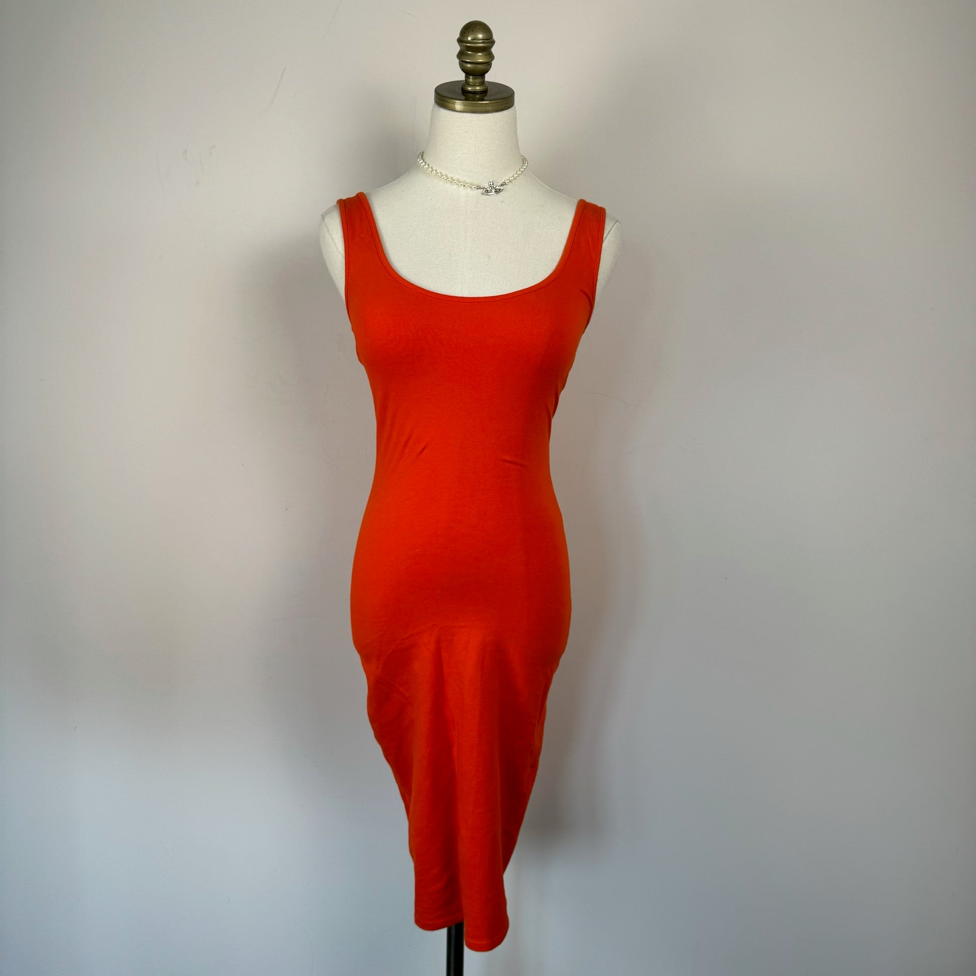 Details: Muted orange bodycon maxi dress, minimalist flattering design.
