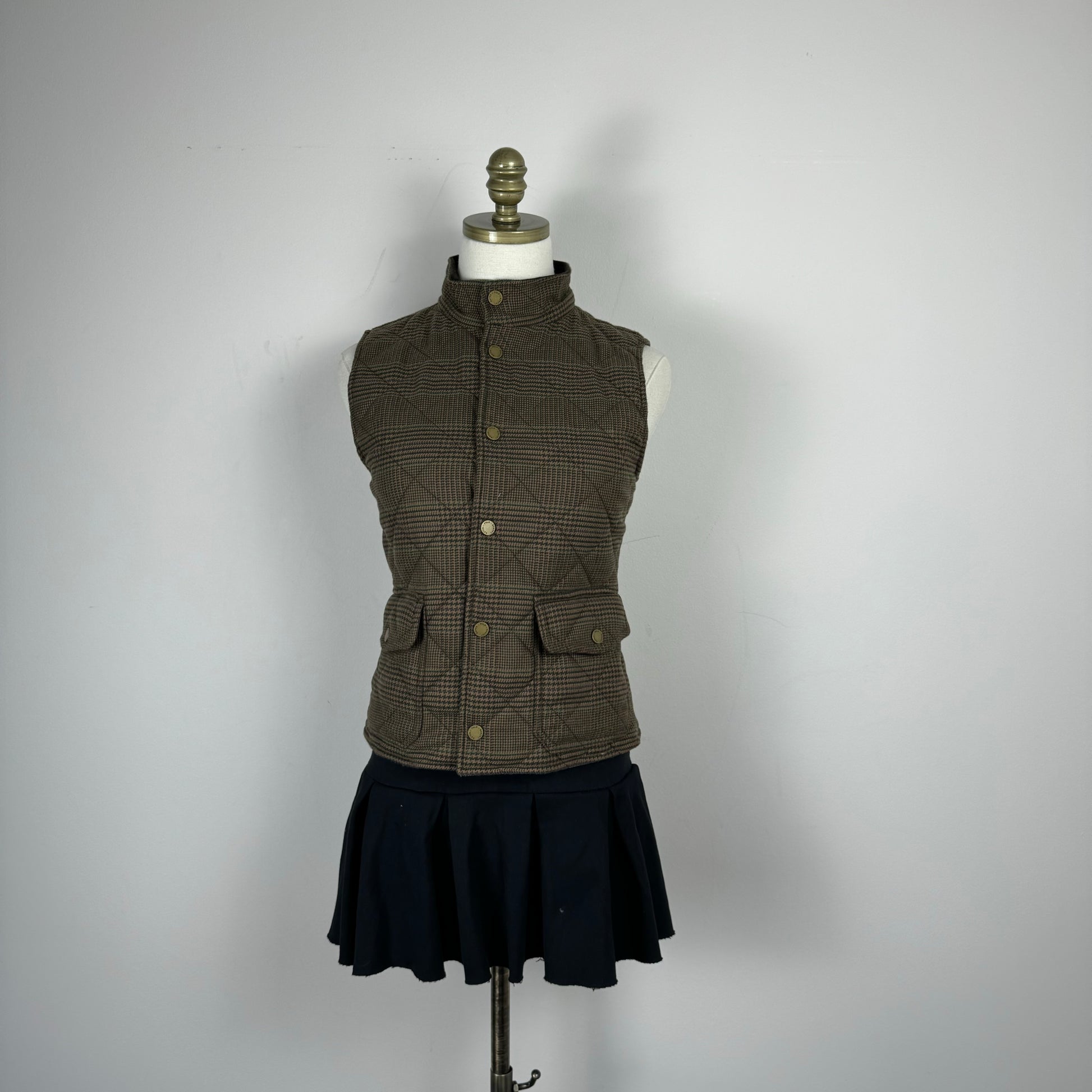 Details: Brown plaid vest with clip-up front, super flattering fit.