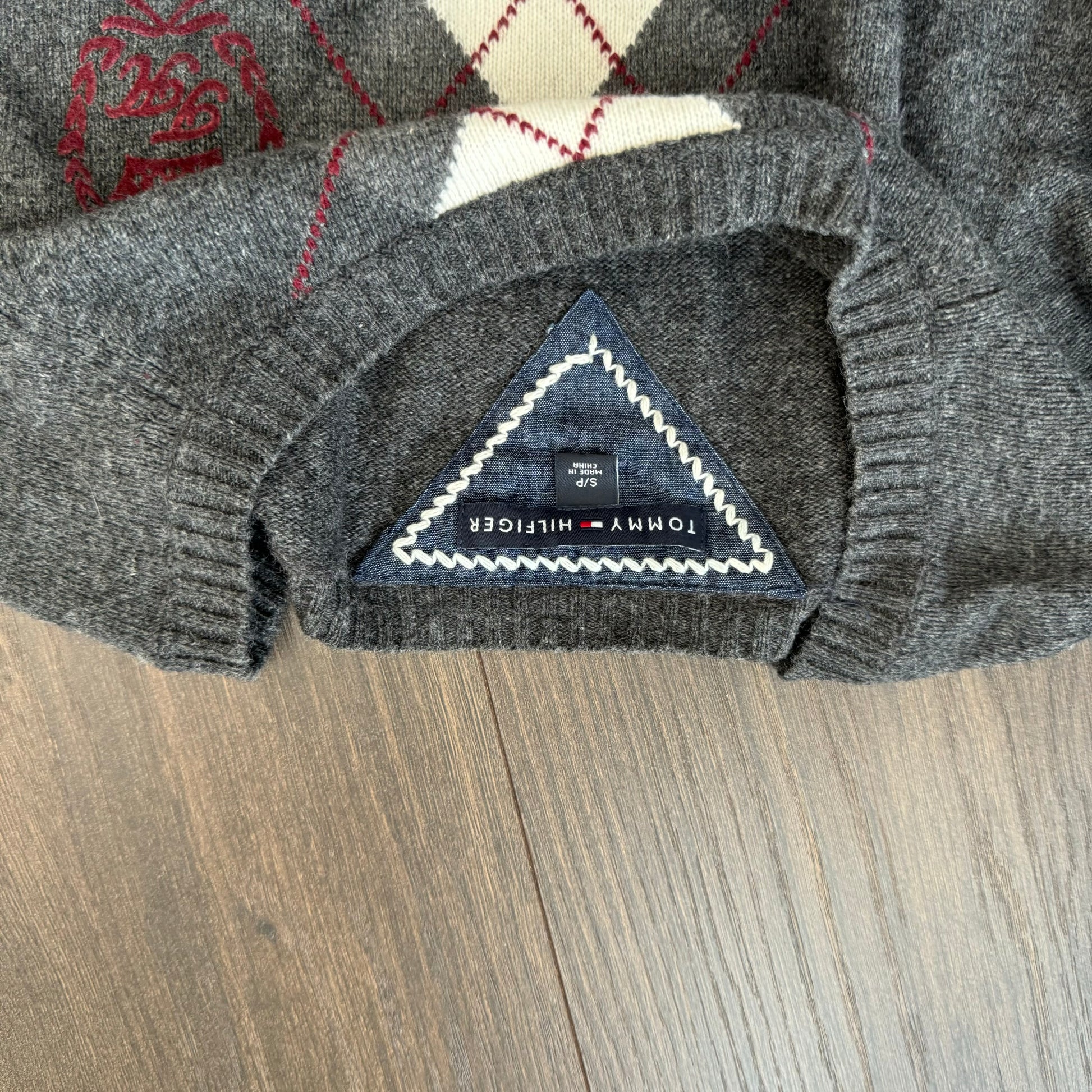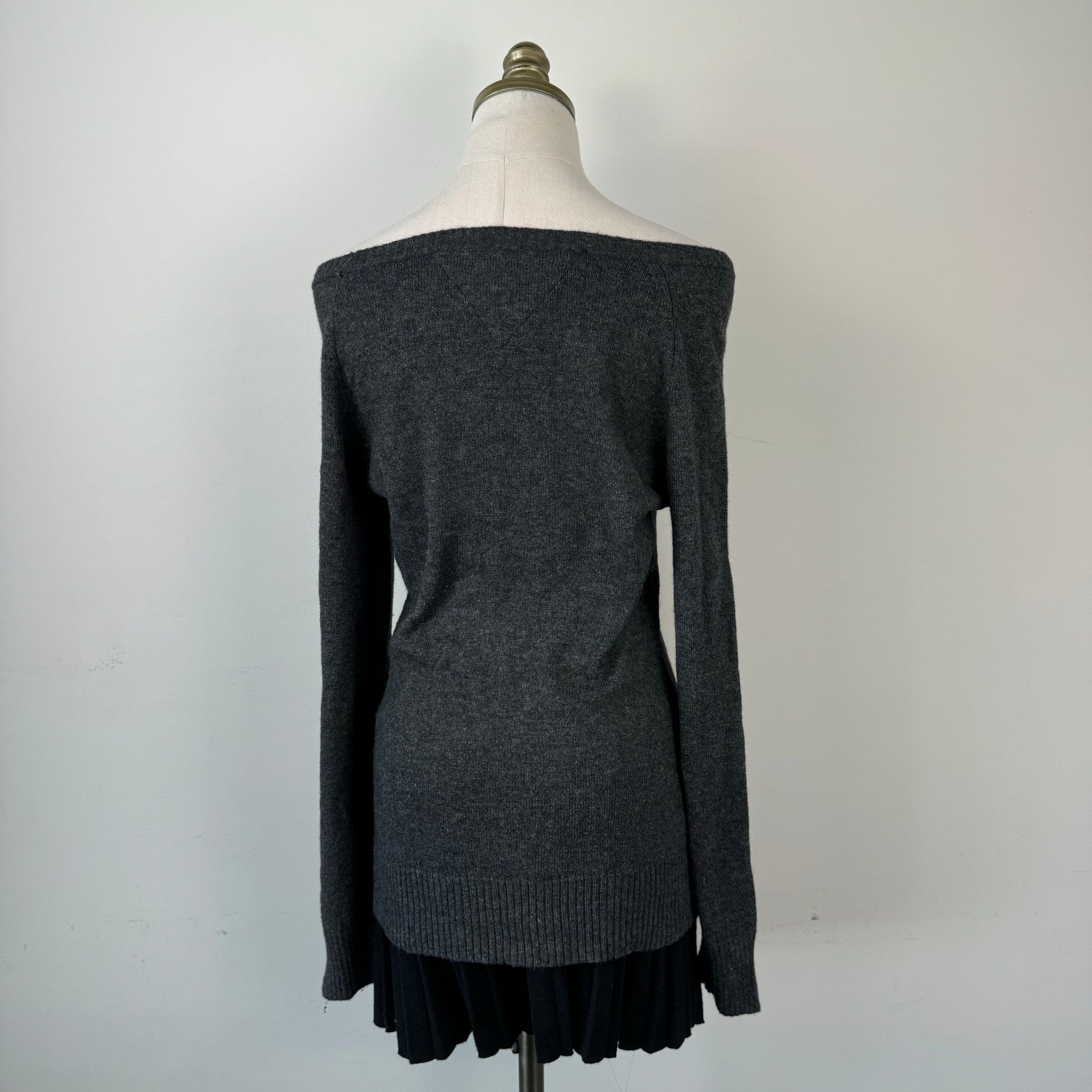 Details: Dark grey argyle sweater with an off-shoulder/boat neck design.