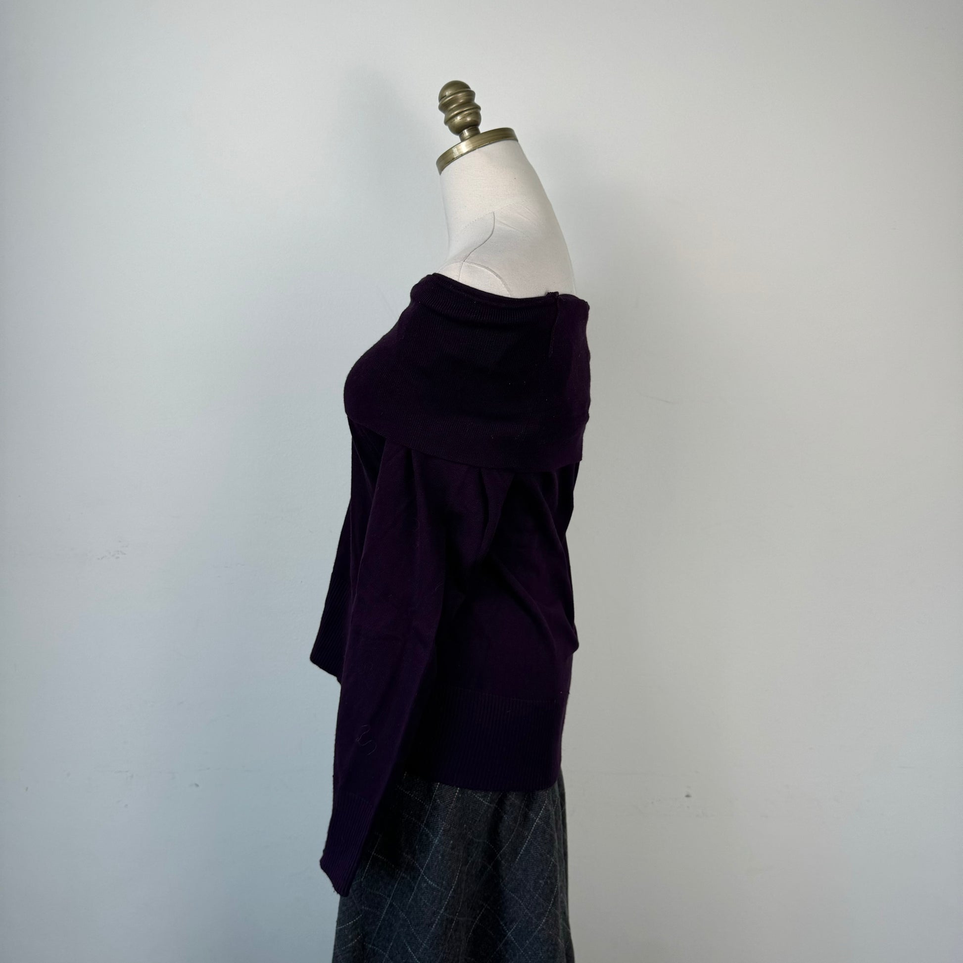 Details: Dark purple off the shoulder soft knit sweater.
