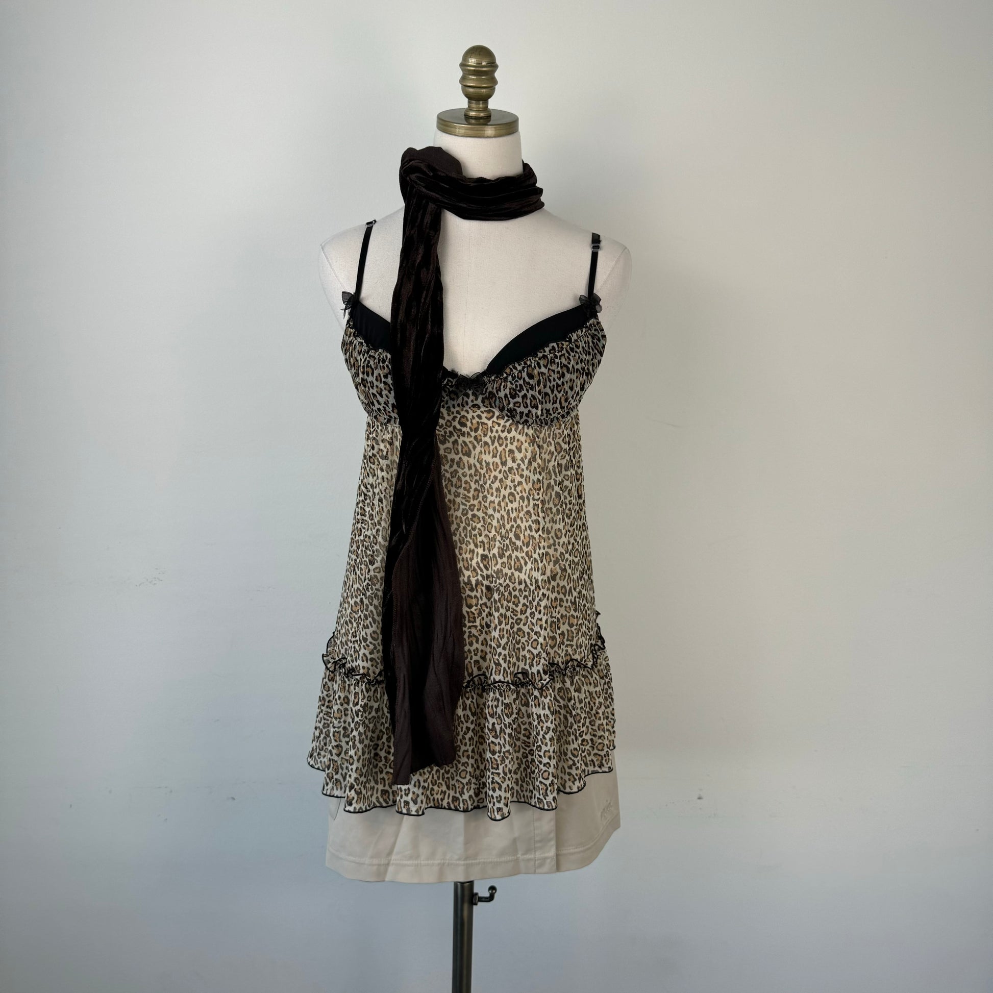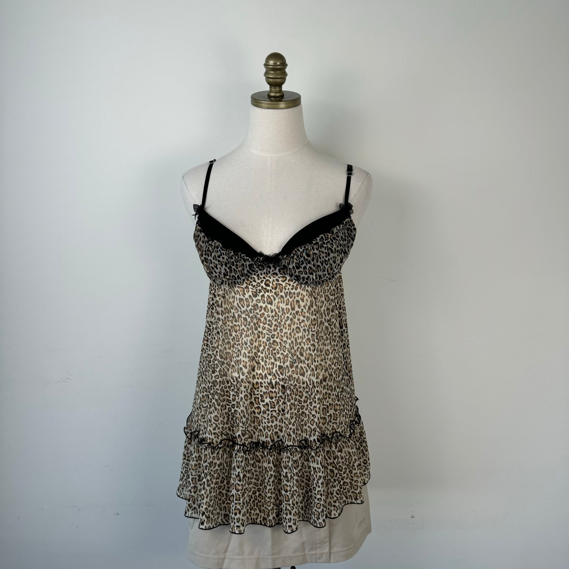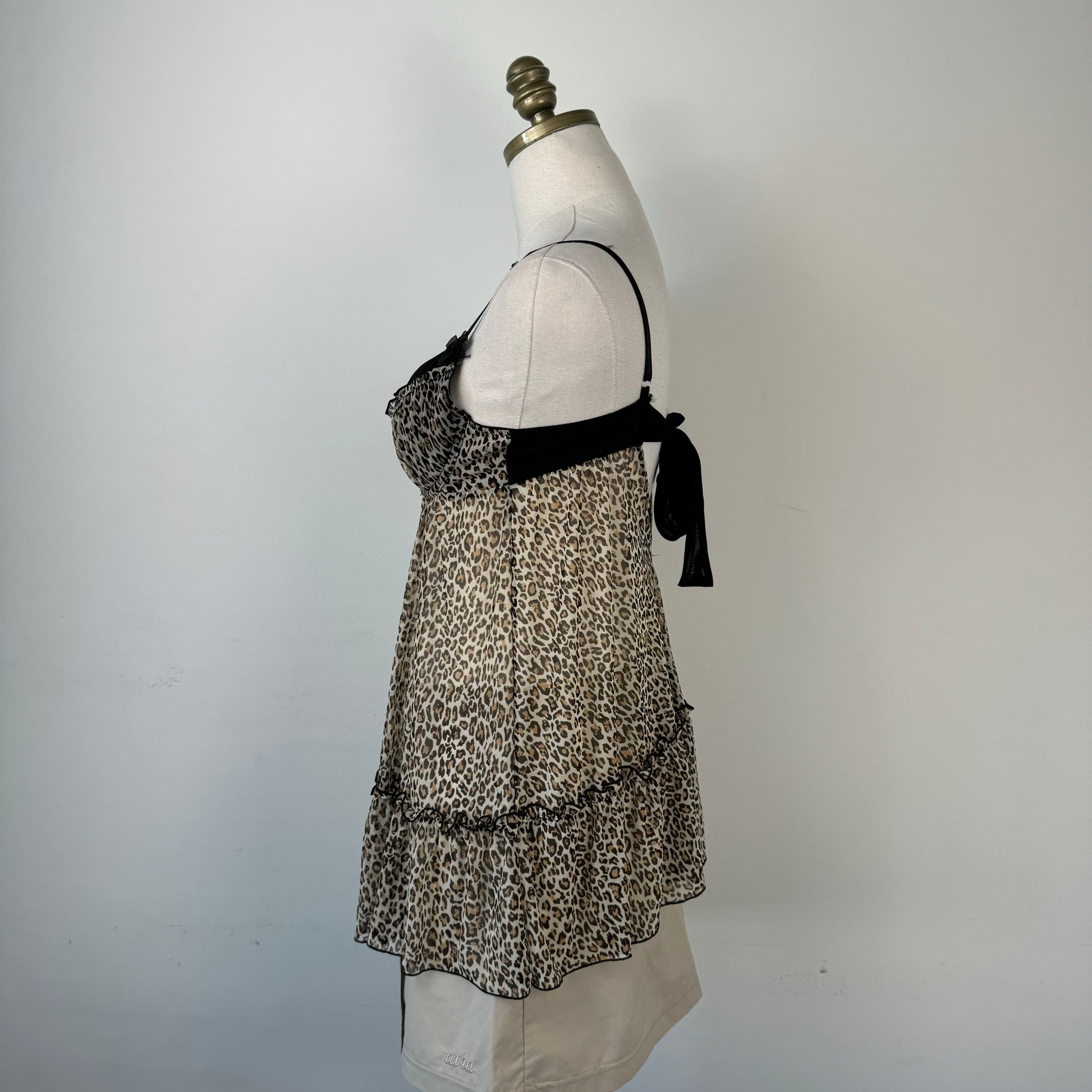 Details: Y2K babydoll leopard print micro mesh lingerie top with ruffle trim, bow details, and slight padding.