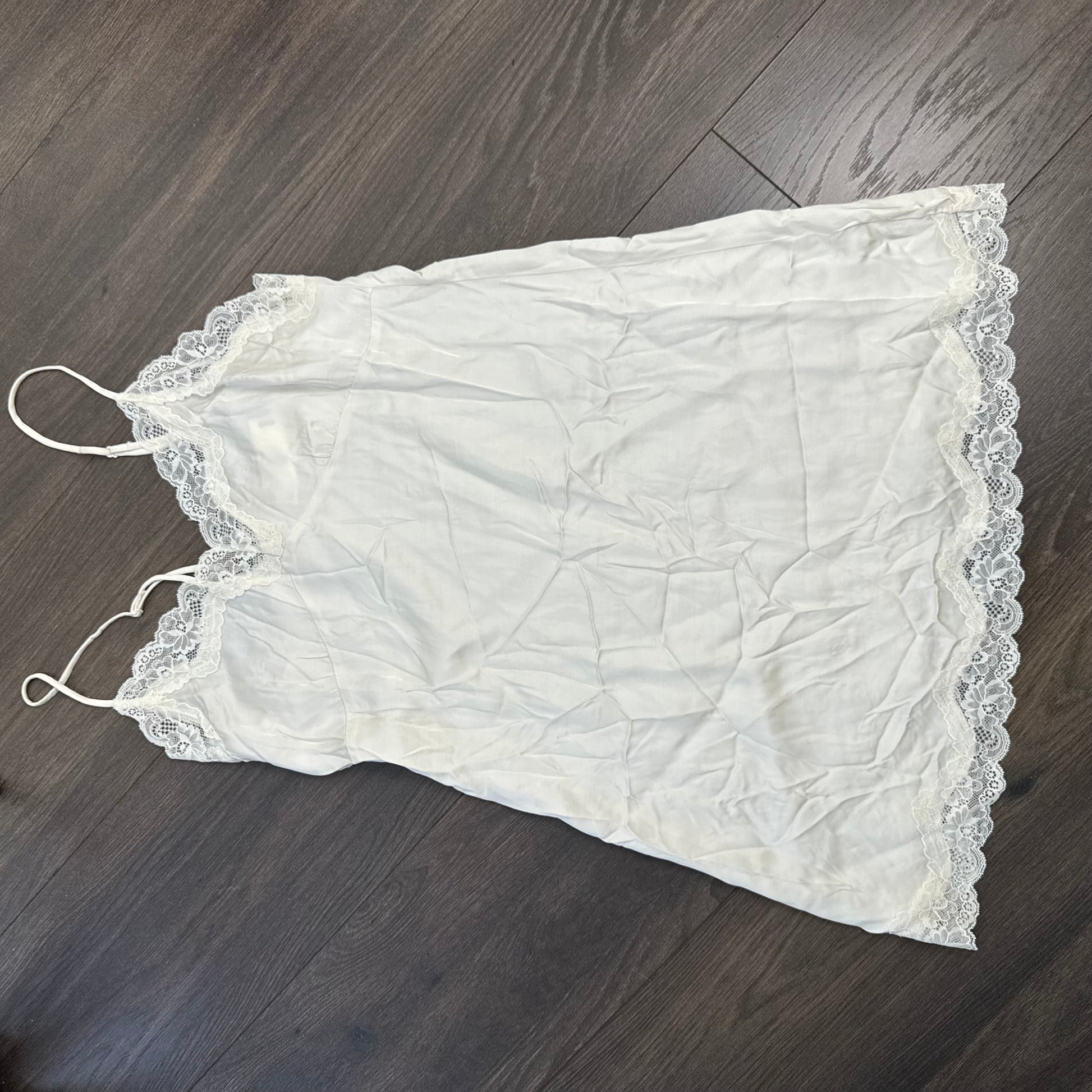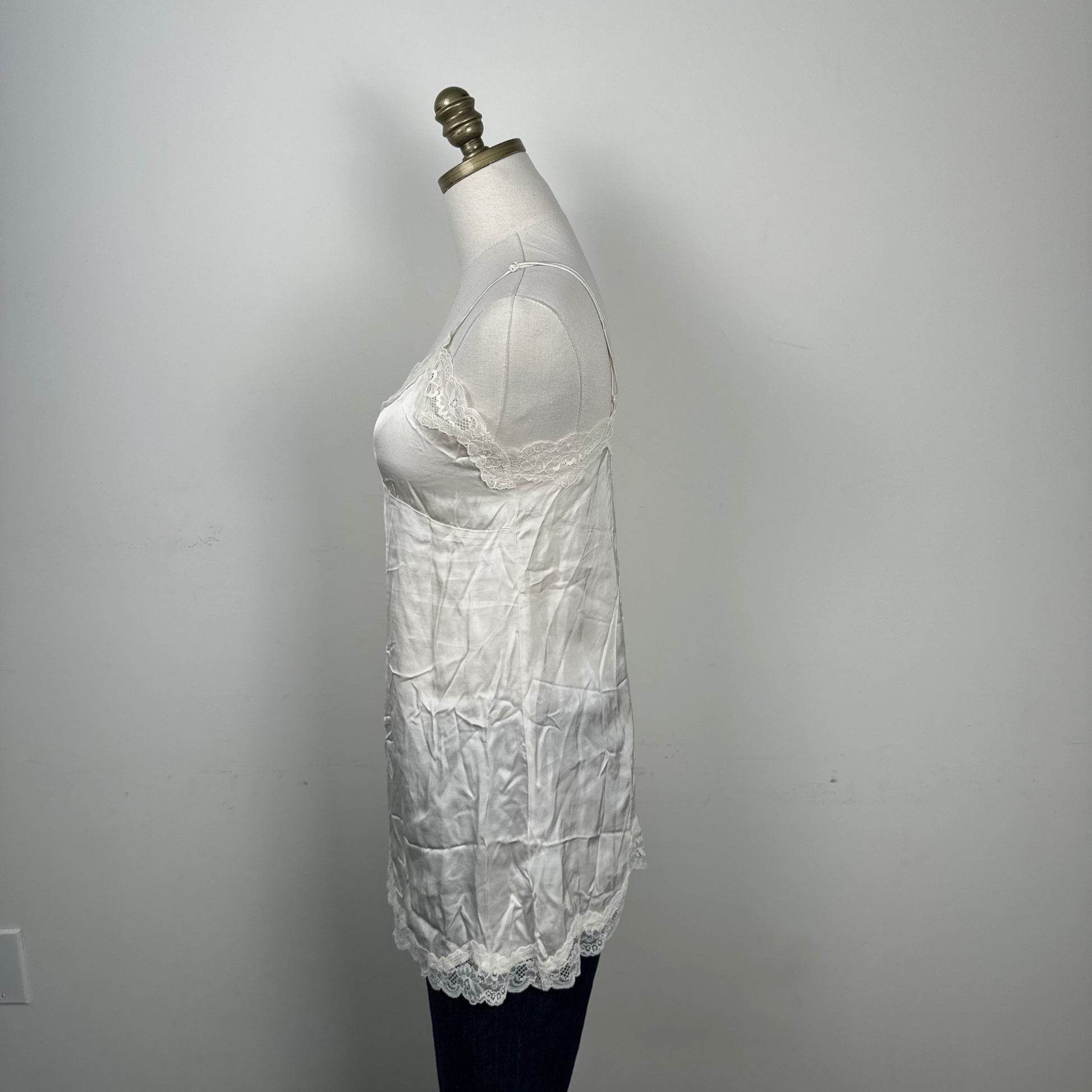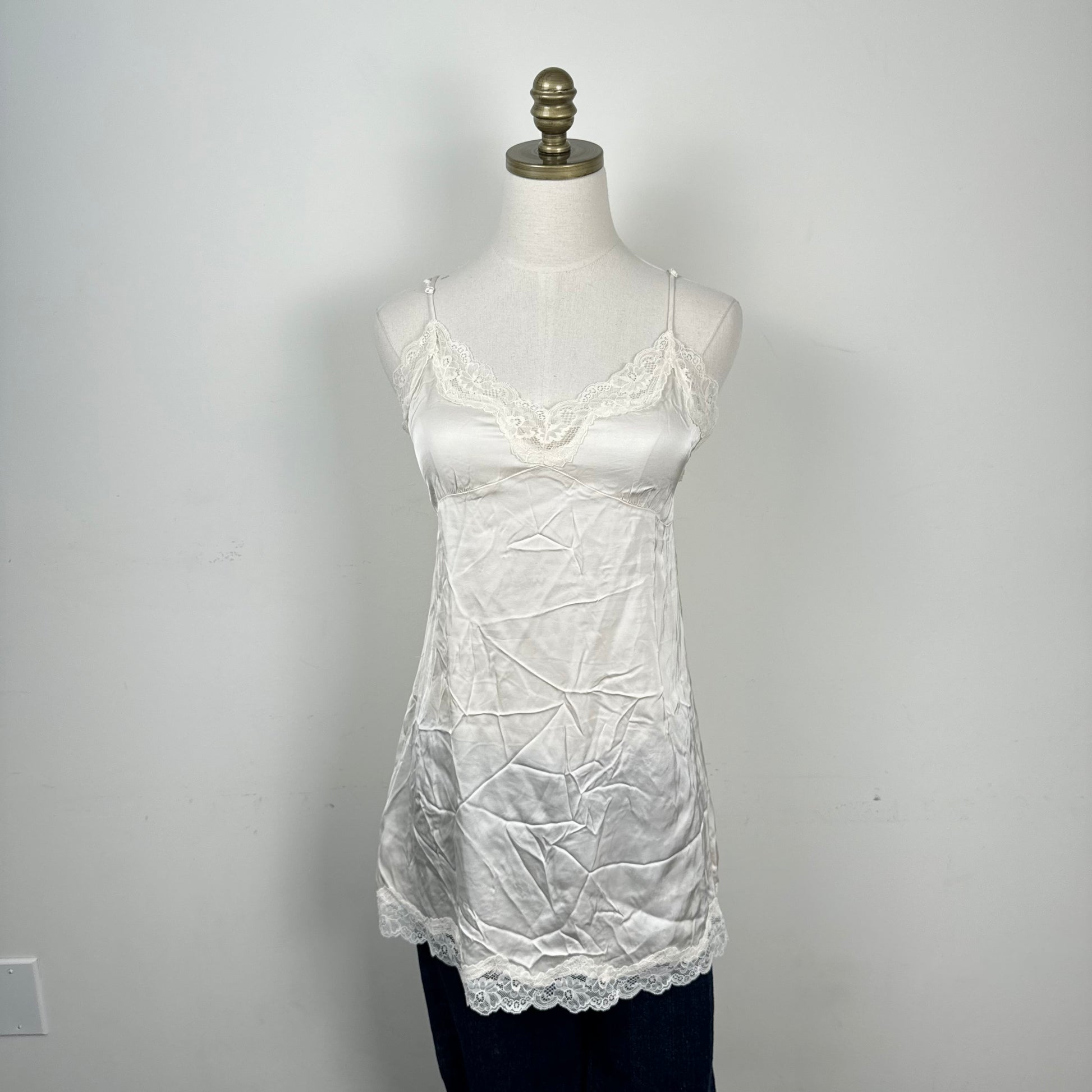 Details: Satin cream babydoll slip dress with lace trim, romantic aesthetic.