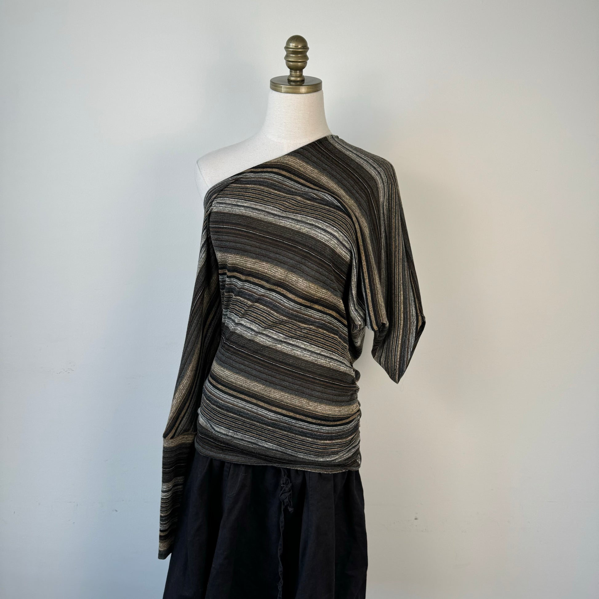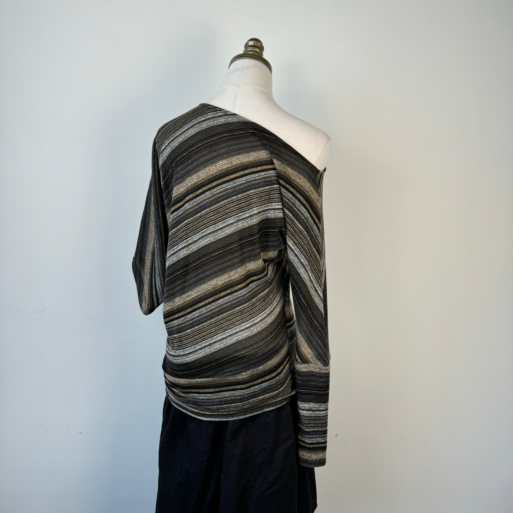 Details: Asymmetric brown knit sweater with stripes, featuring an off-shoulder design.