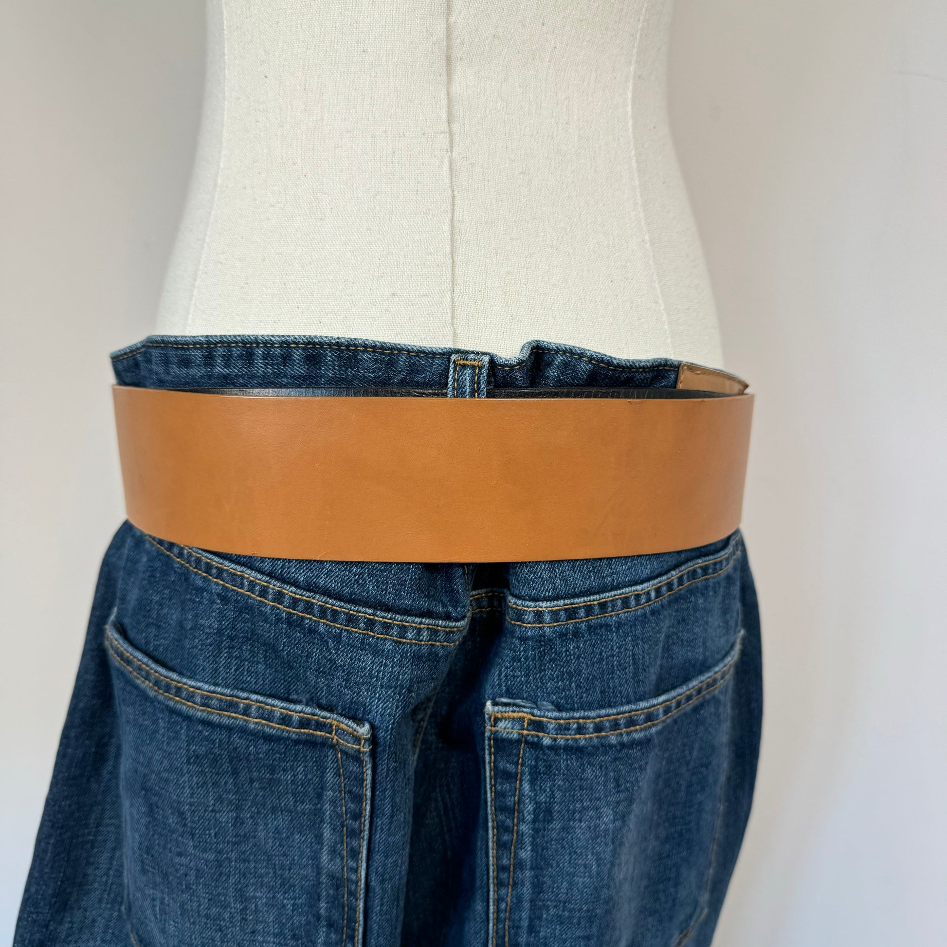 Details: Stunning tan chunky wide leather belt with a boho rectangular buckle that clasps into the holes.