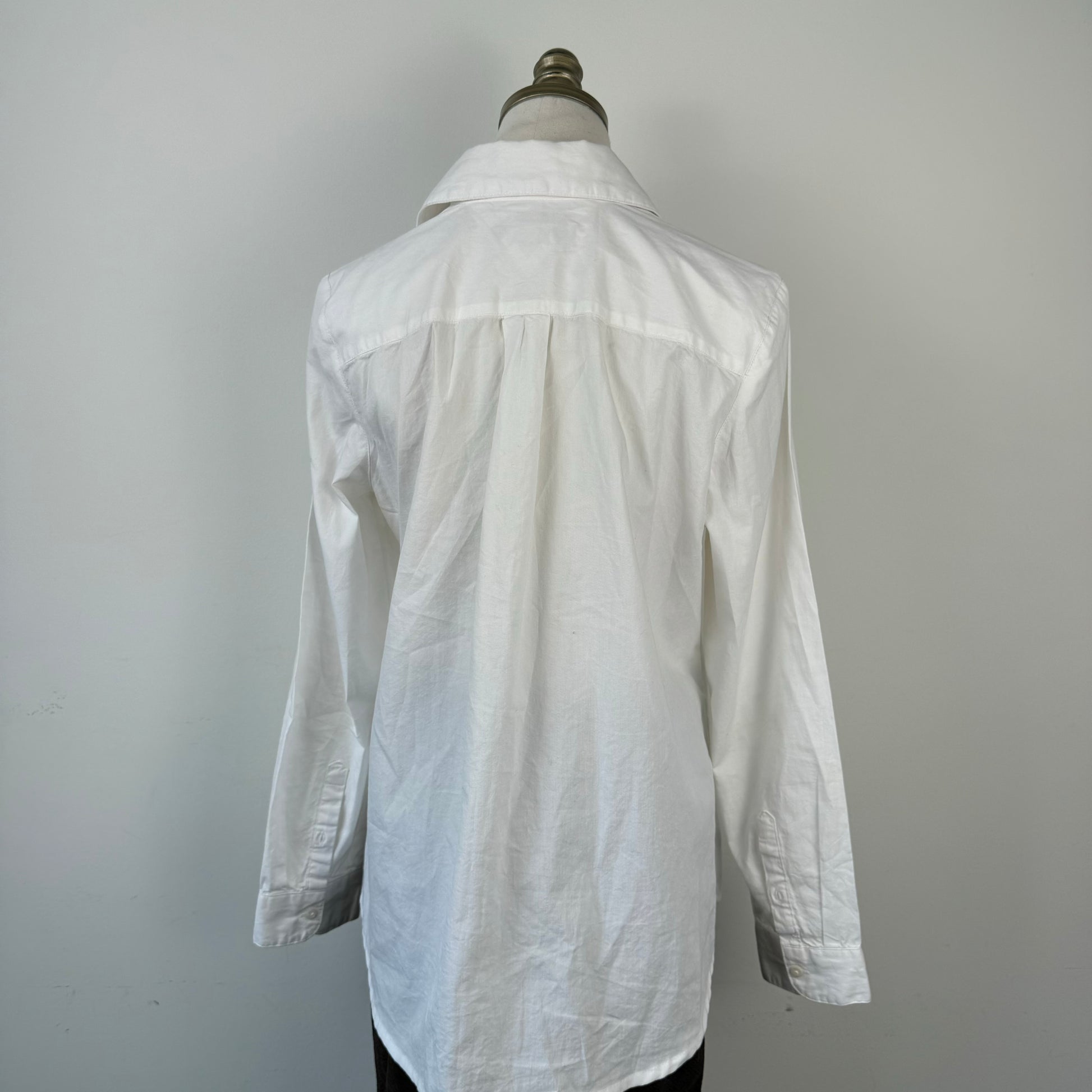 Details: White button-up shirt.