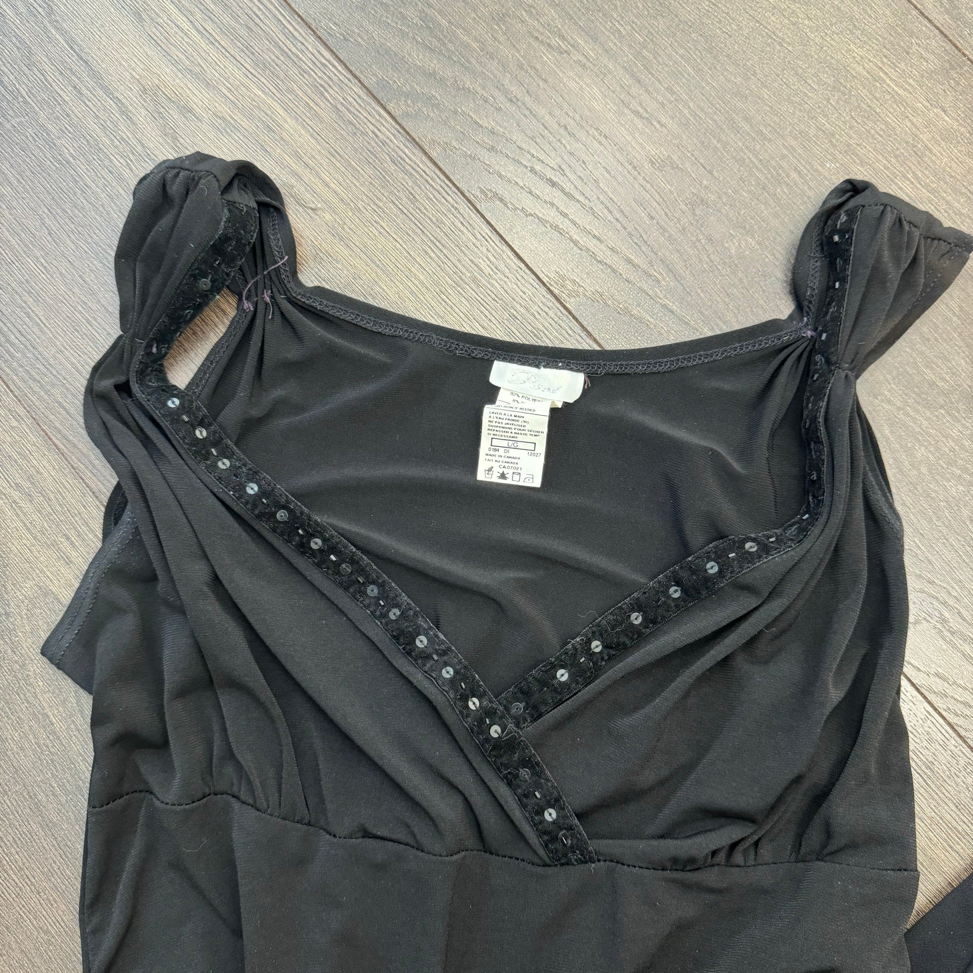 Details: Vintage black midi dress with a babydoll silhouette, ruffled hem, and drop waist.