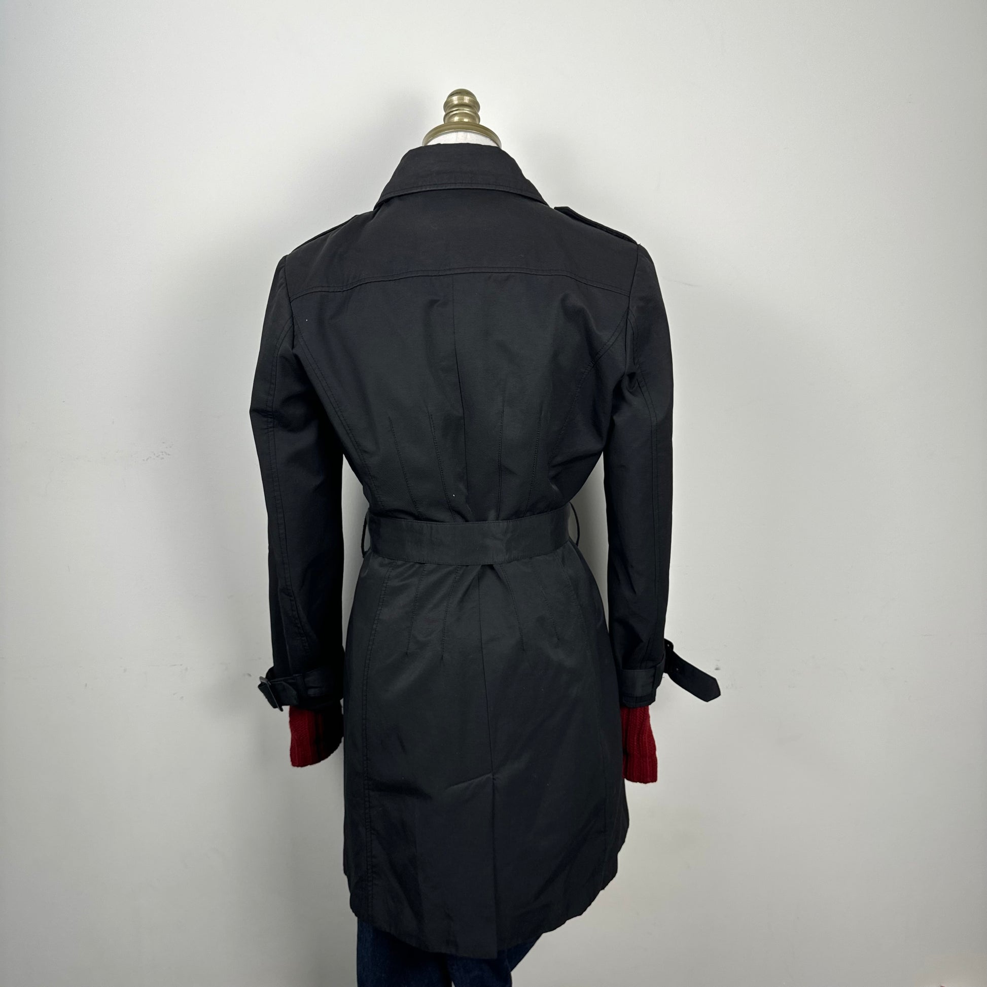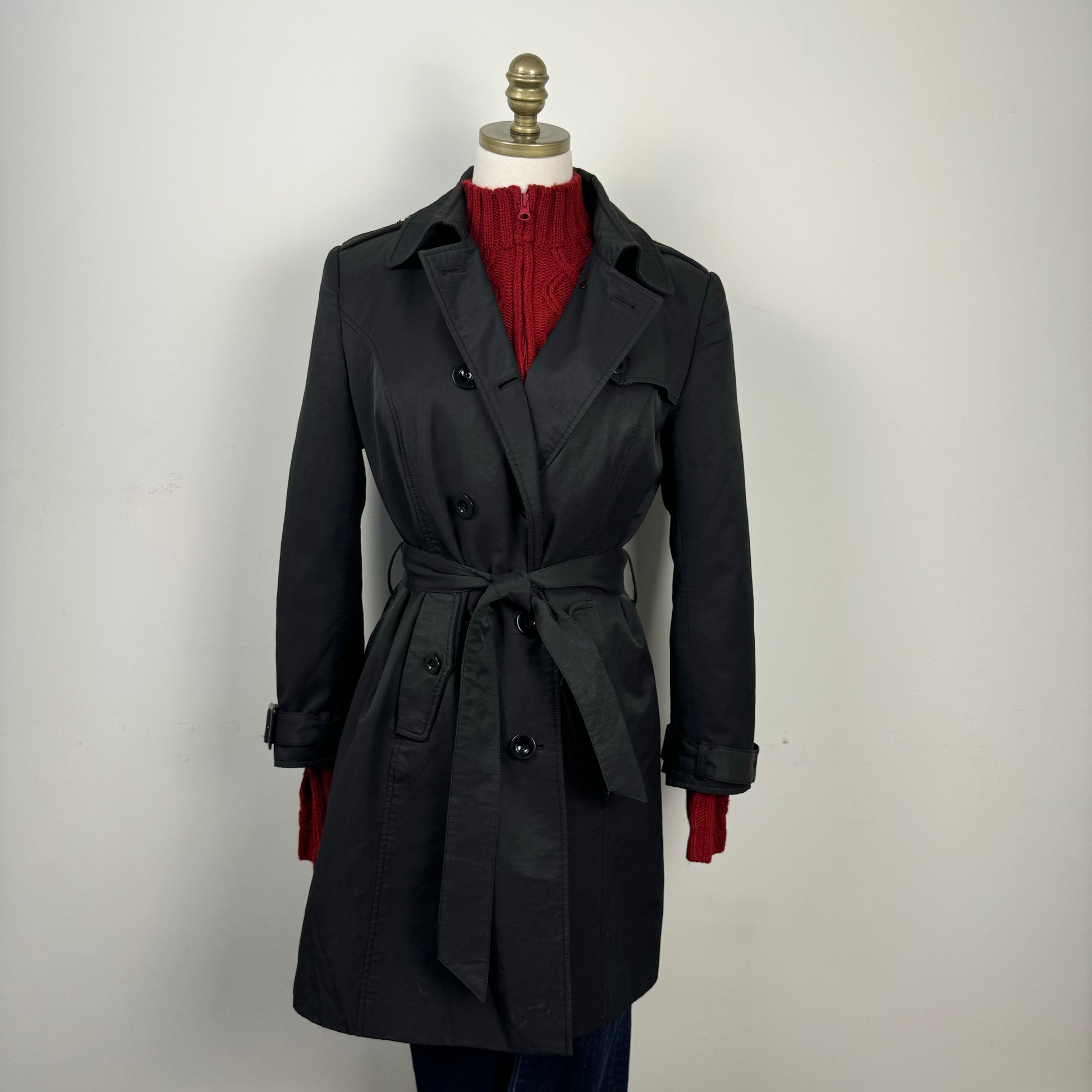 Details: Vintage double-breasted trench coat in black, buttoned to the top, with an attached waistbelt, made of a cotton and nylon blend.