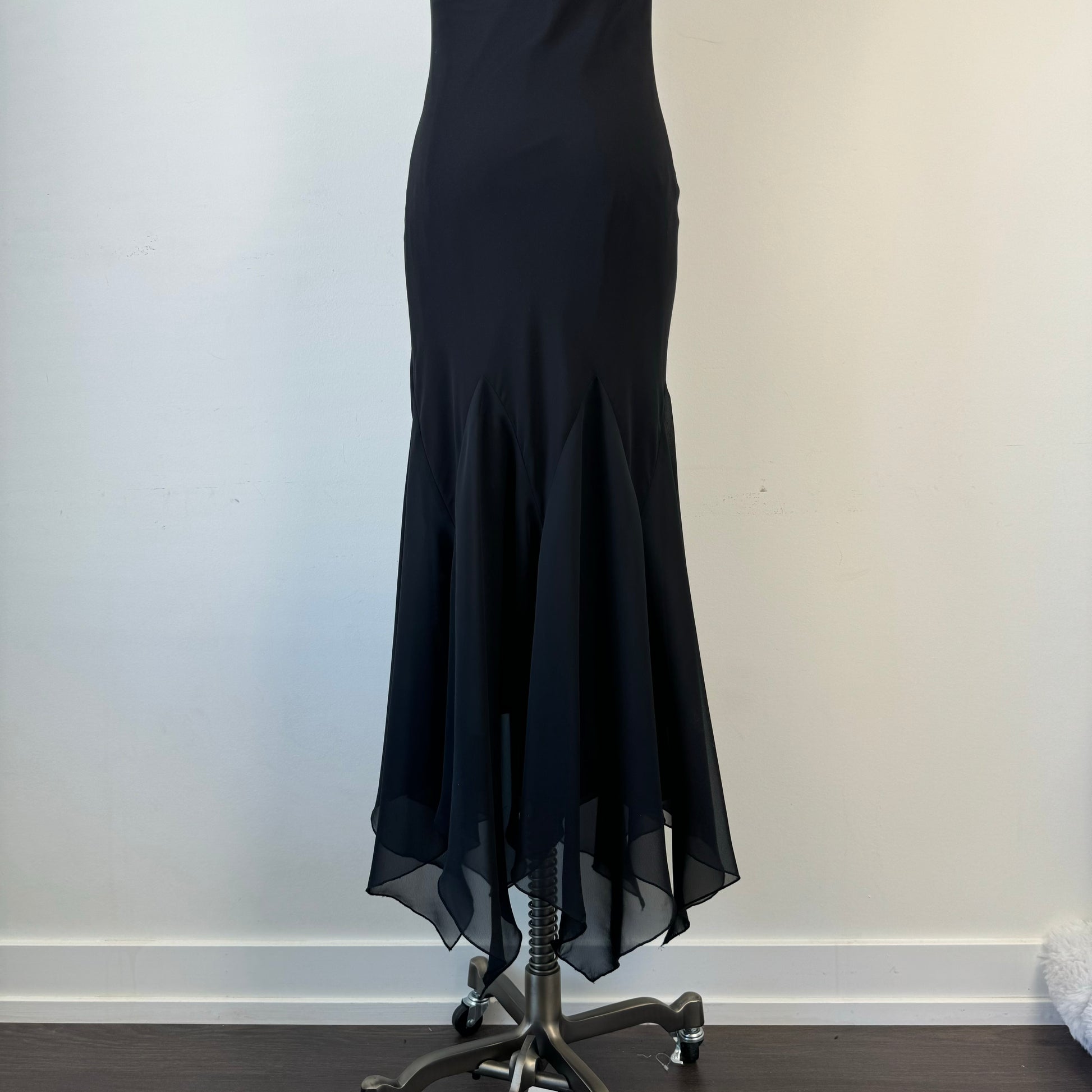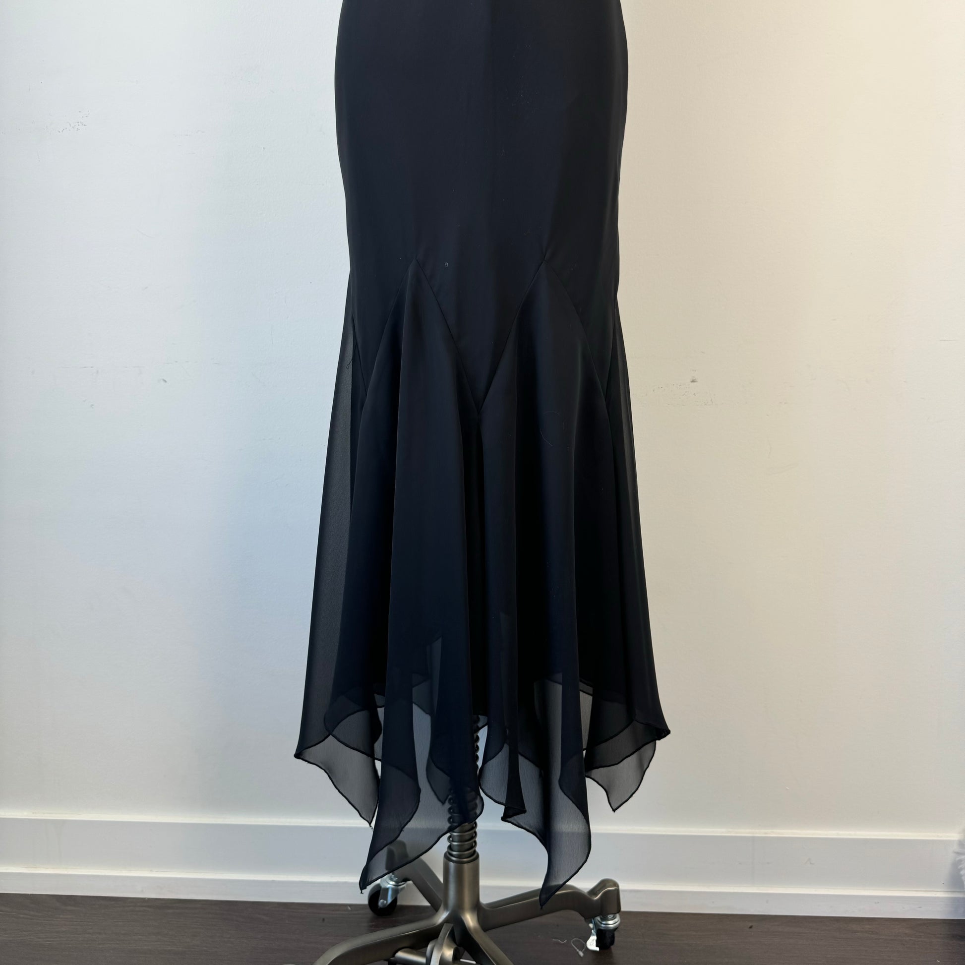 Details: Vintage fairy dress in black with chiffon overlay, featuring ruffled pixie hem.