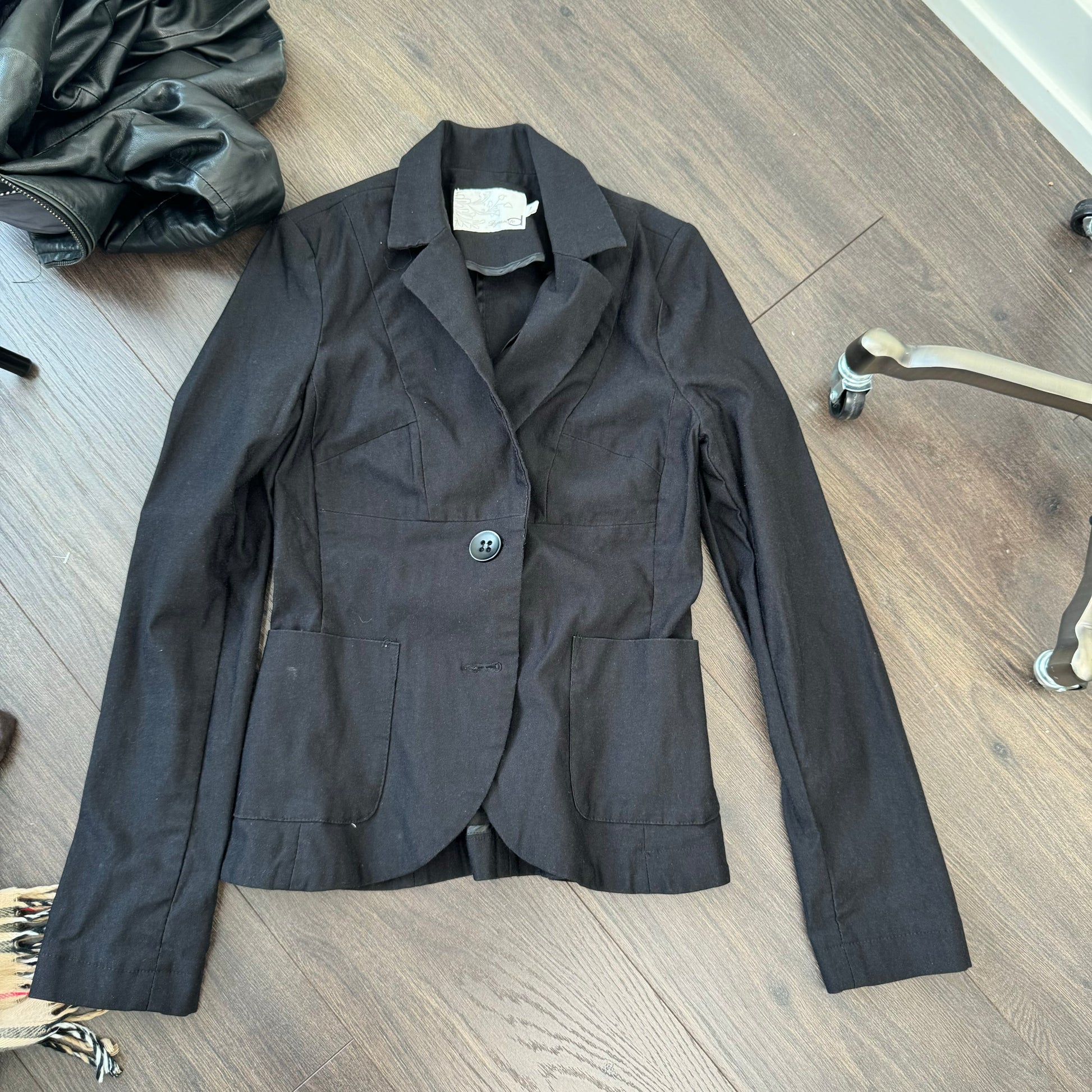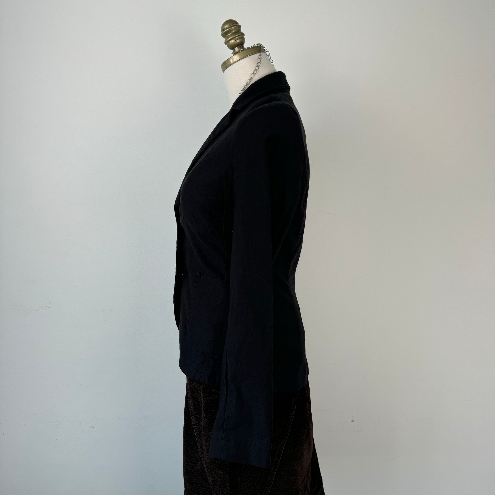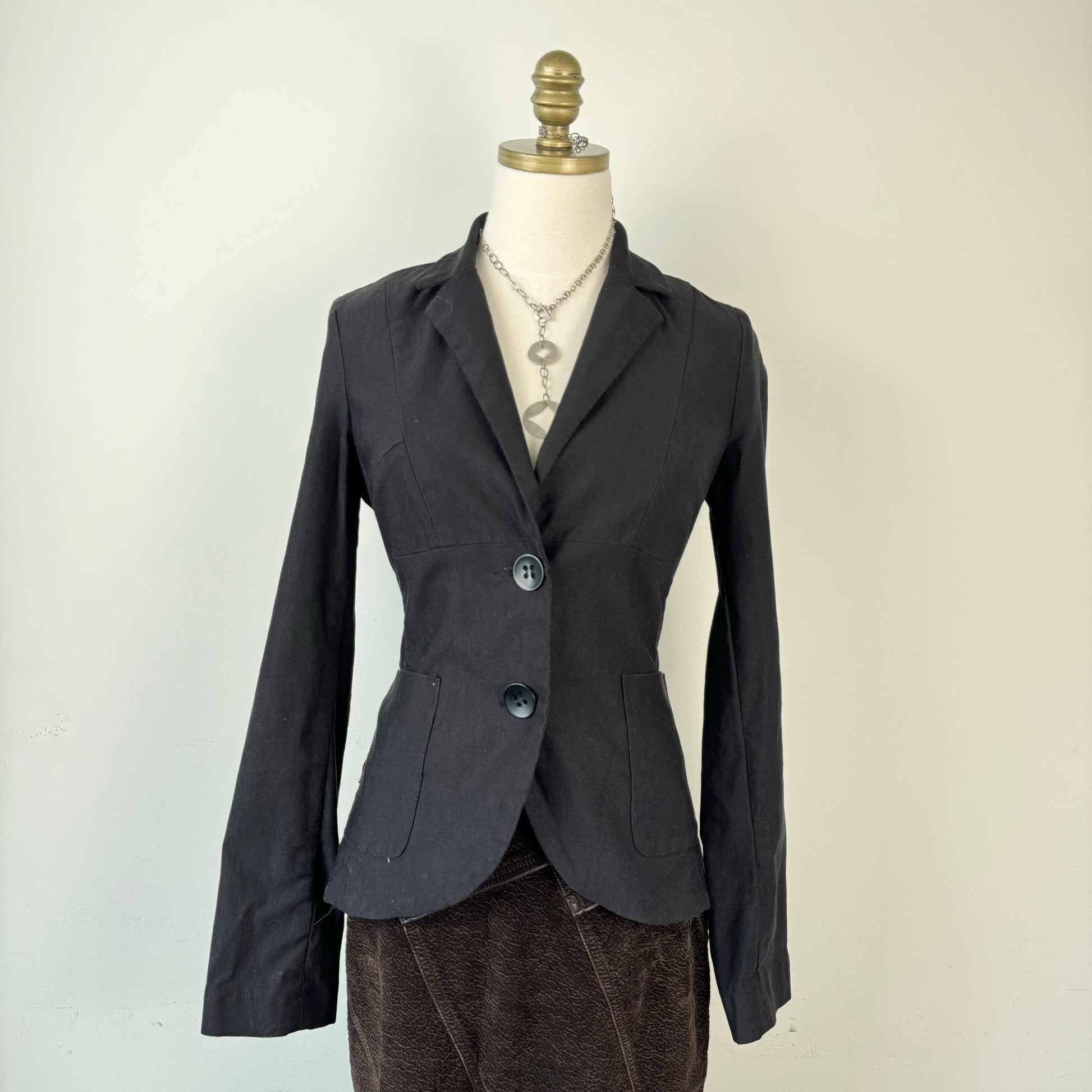 Details: Vintage black fitted button-up blazer with a cinched waist.