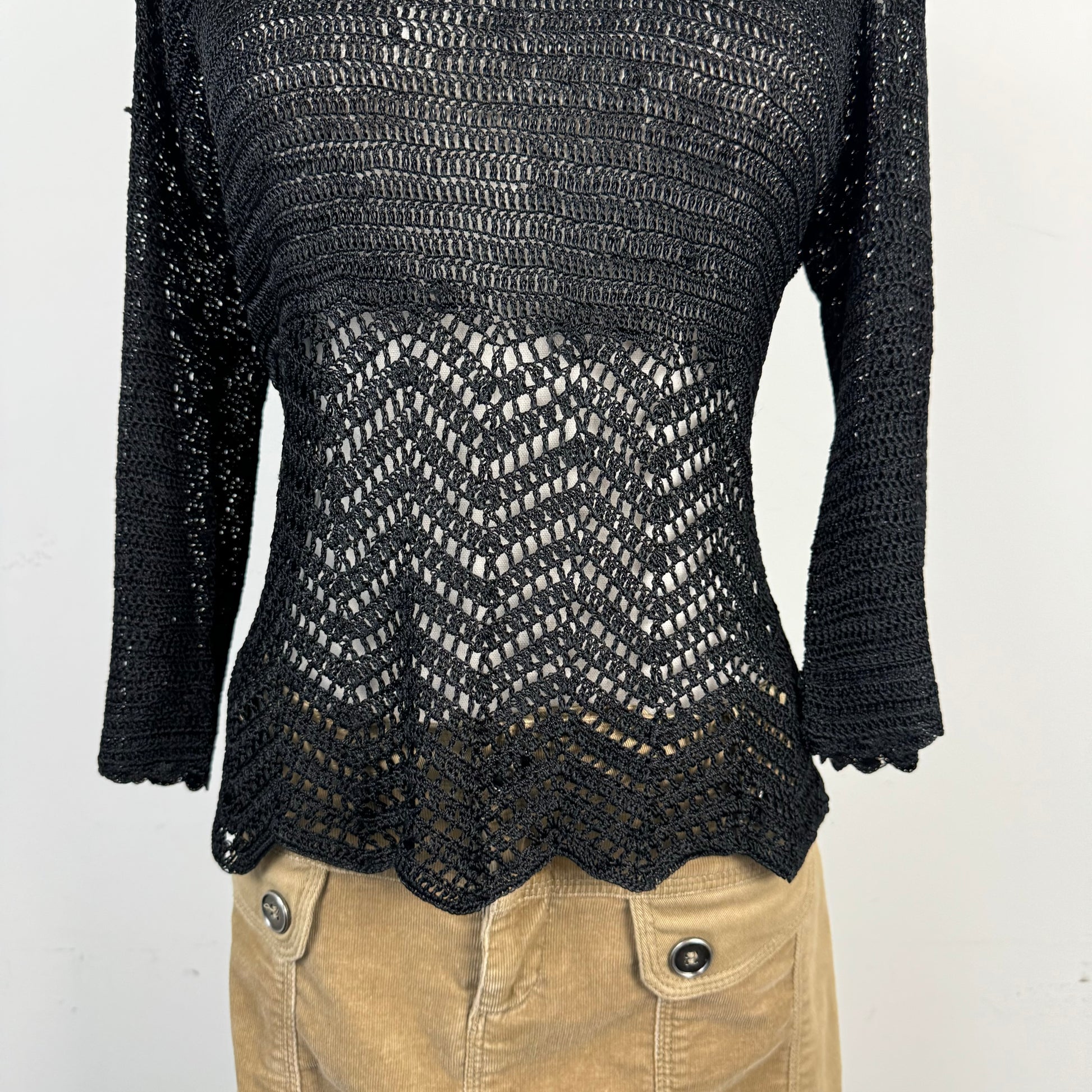 Details: Vintage off-shoulder top in black crochet mesh knit with a unique design, featuring 3/4 sleeves.