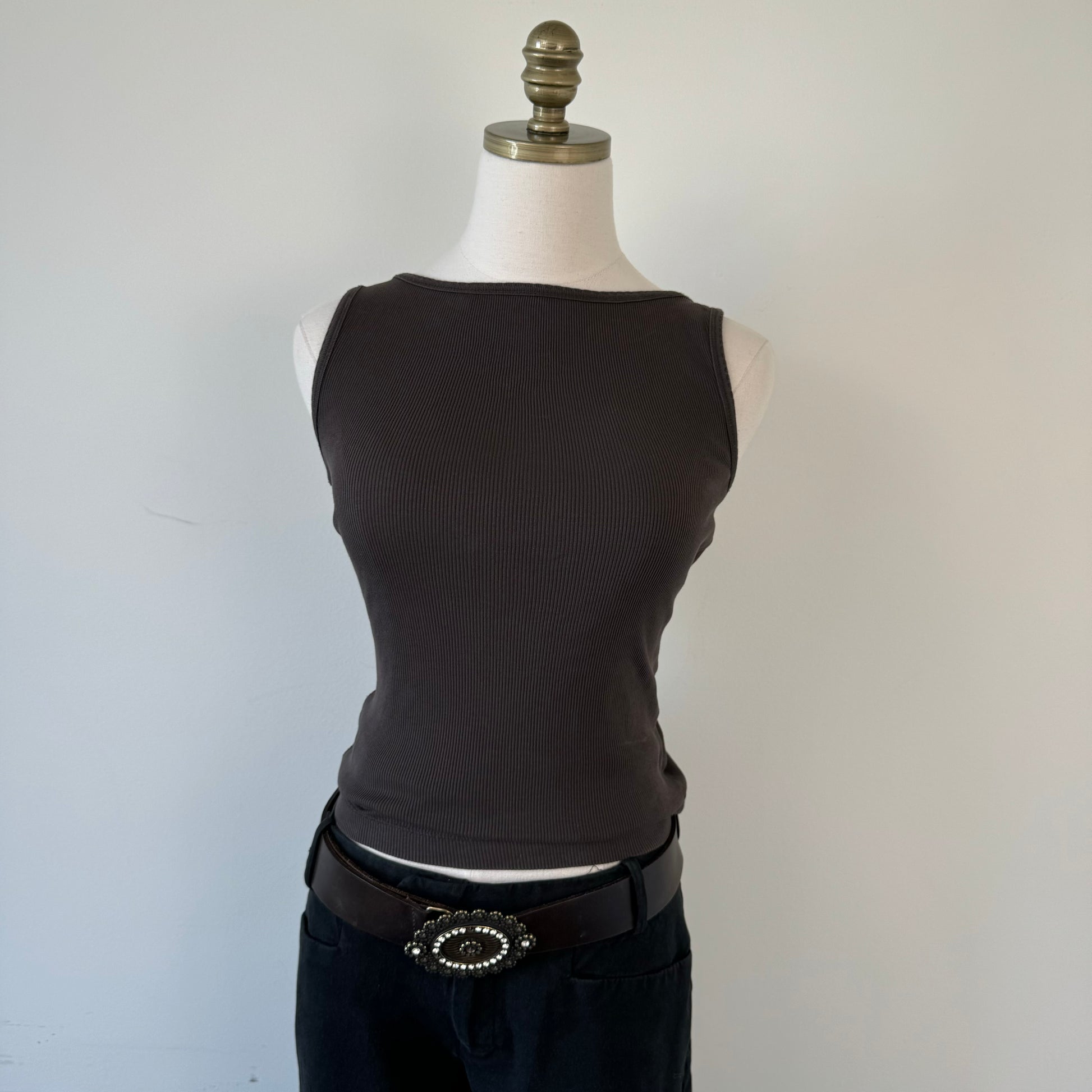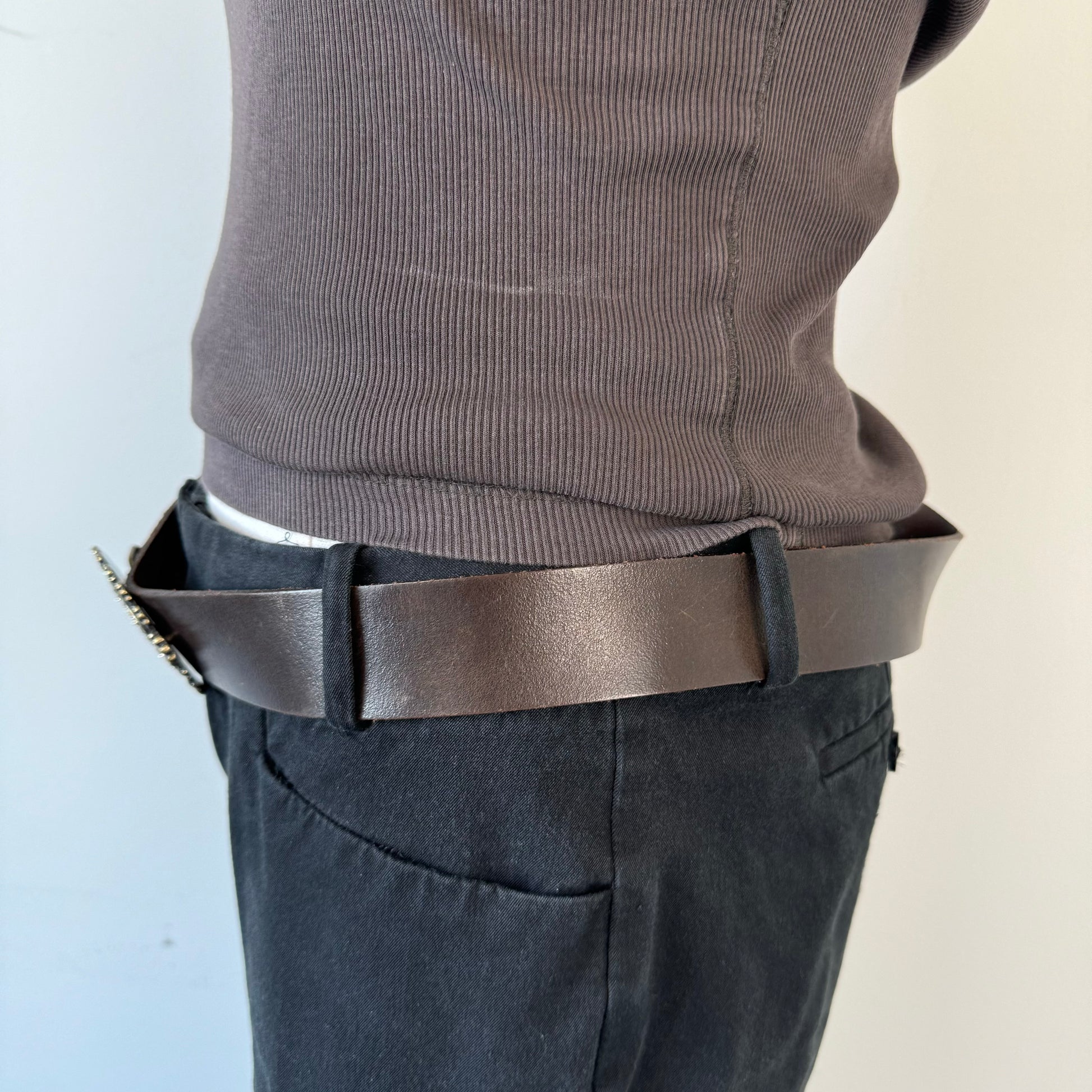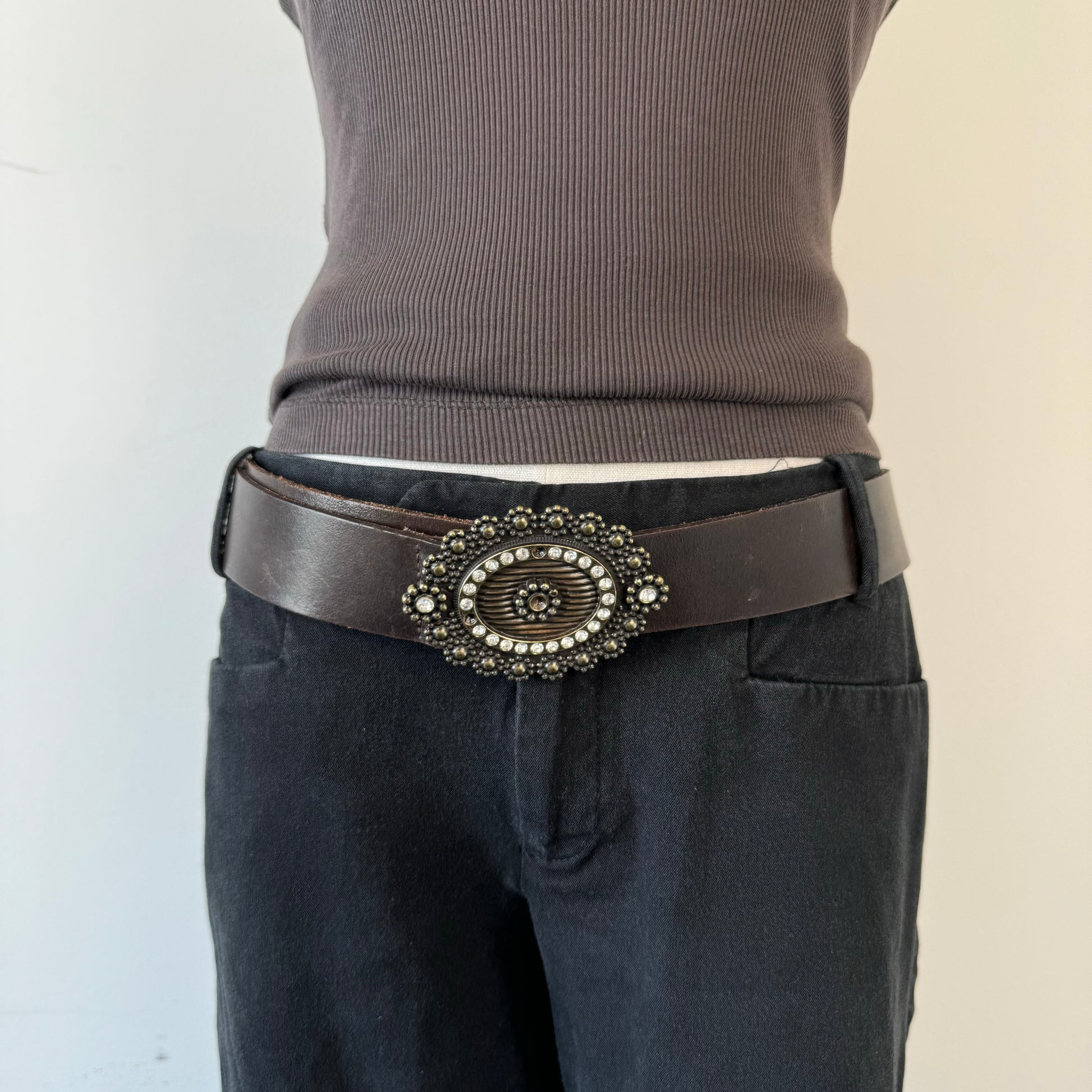 Details: Vintage brown boho belt with antique style rusted buckle adorned with rhinestones.