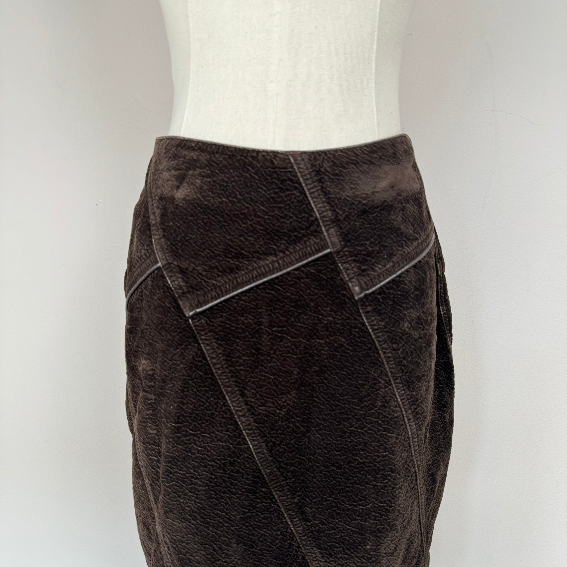 Details: Vintage brown suede midi skirt with a gorgeous and unique design.
