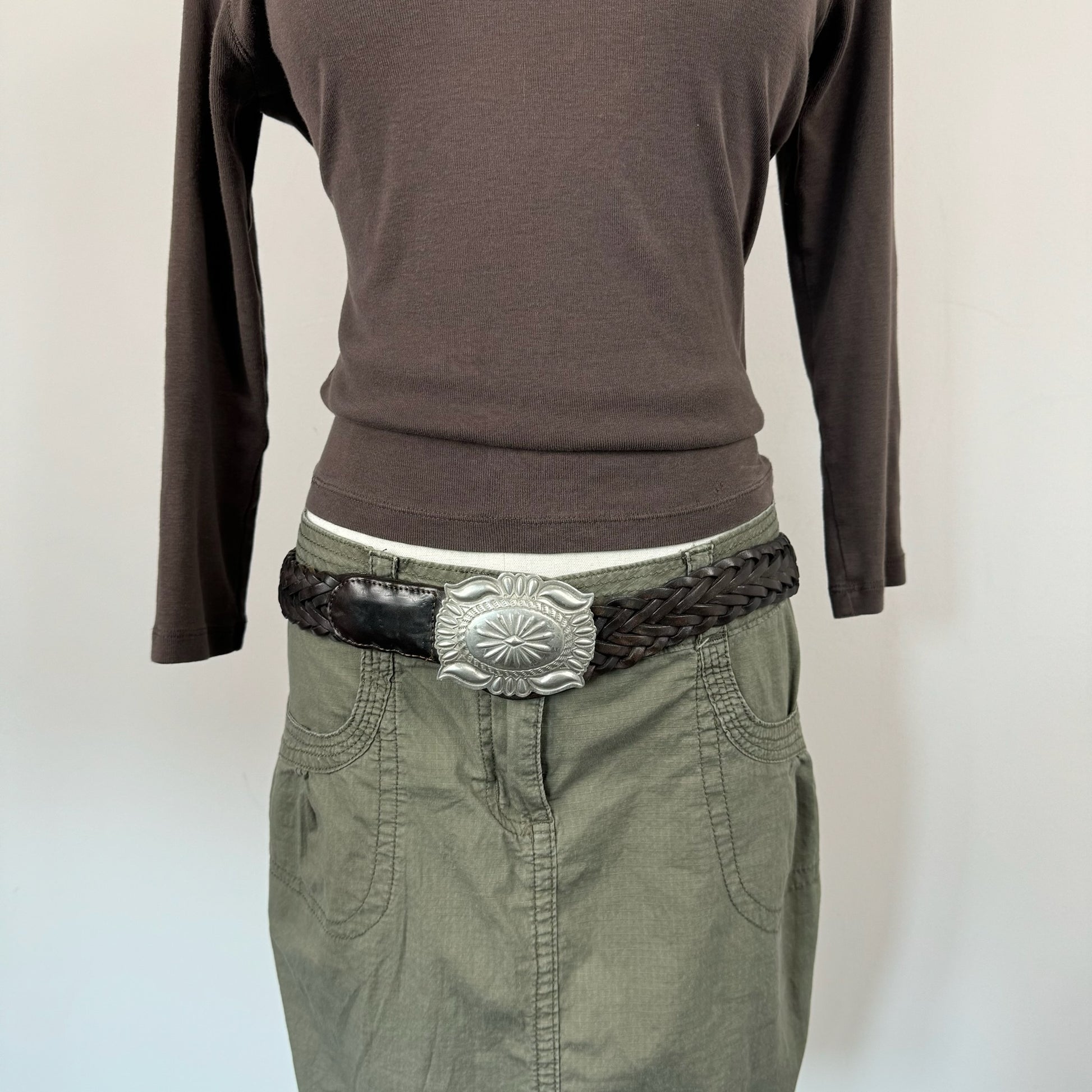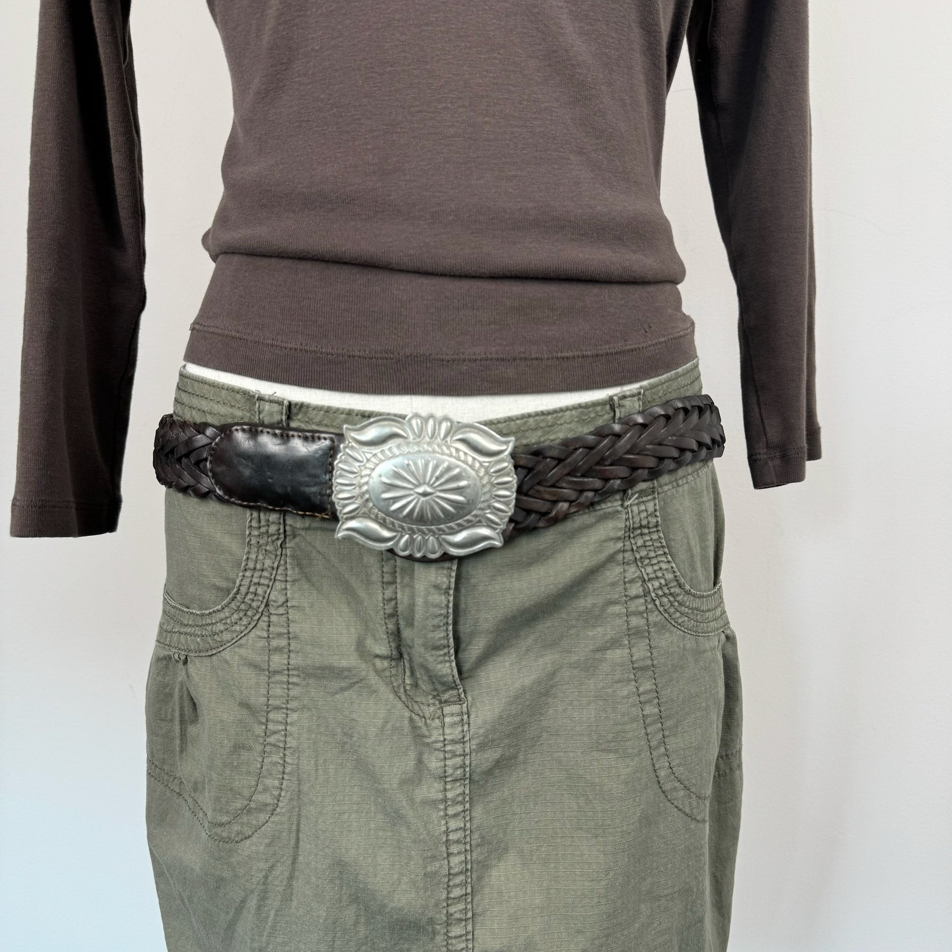 Details: Dark brown woven braided leather belt with cowboy style silver buckle.