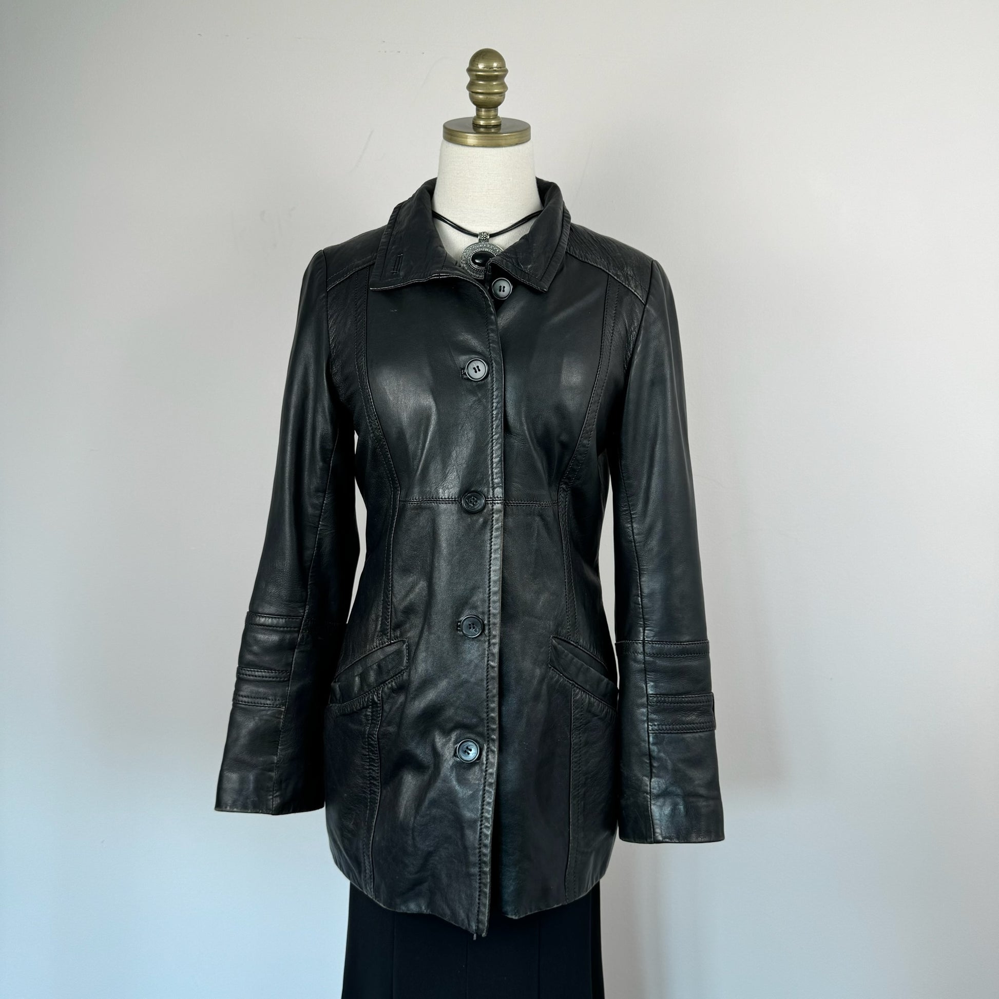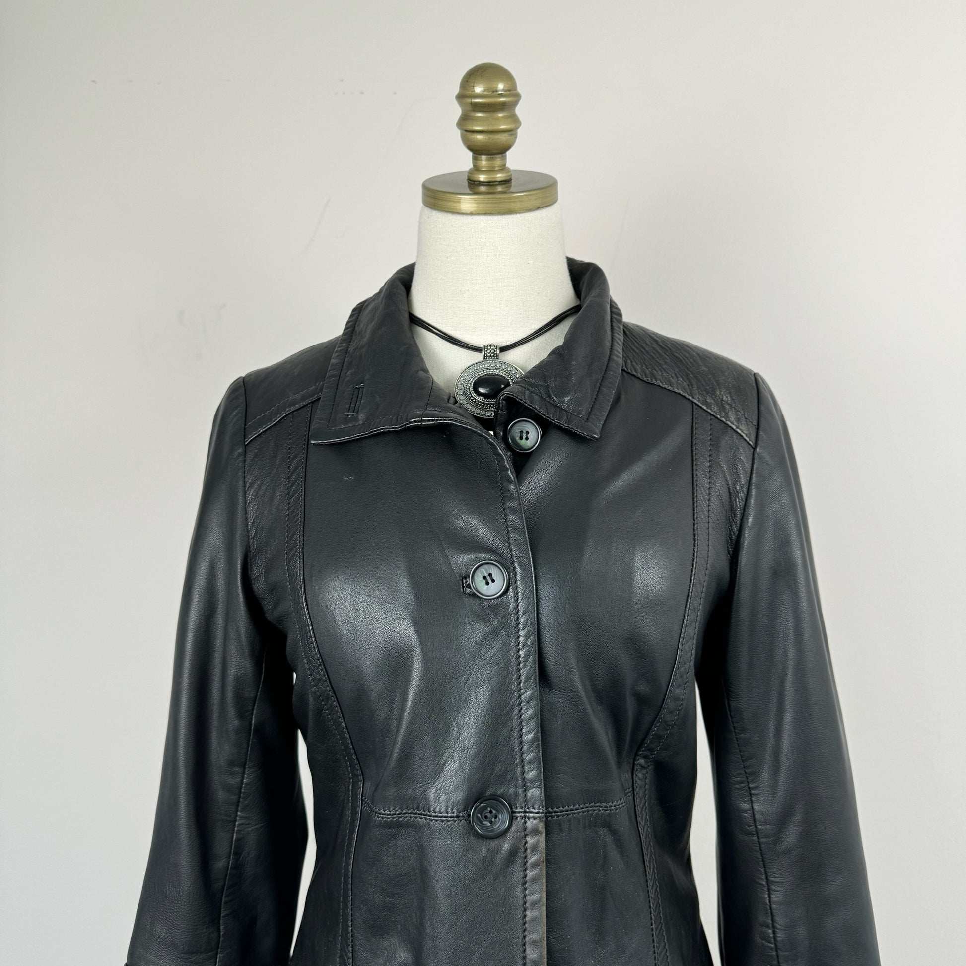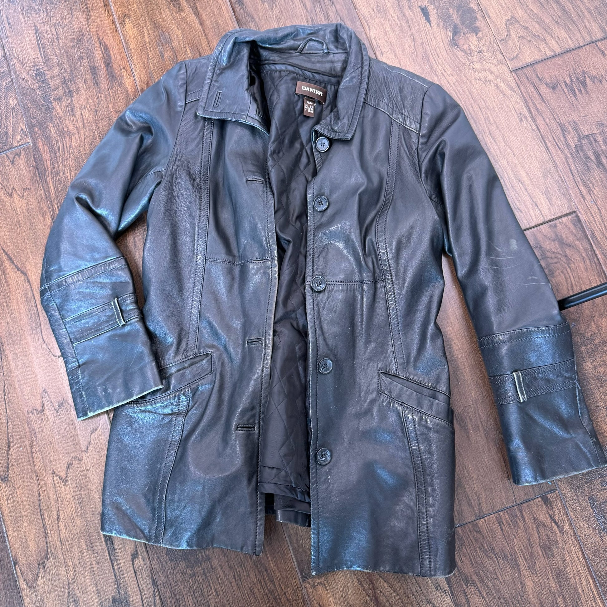 Details: Black vintage leather trench coat with stunning design, button-up front, and lightly quilted lining.