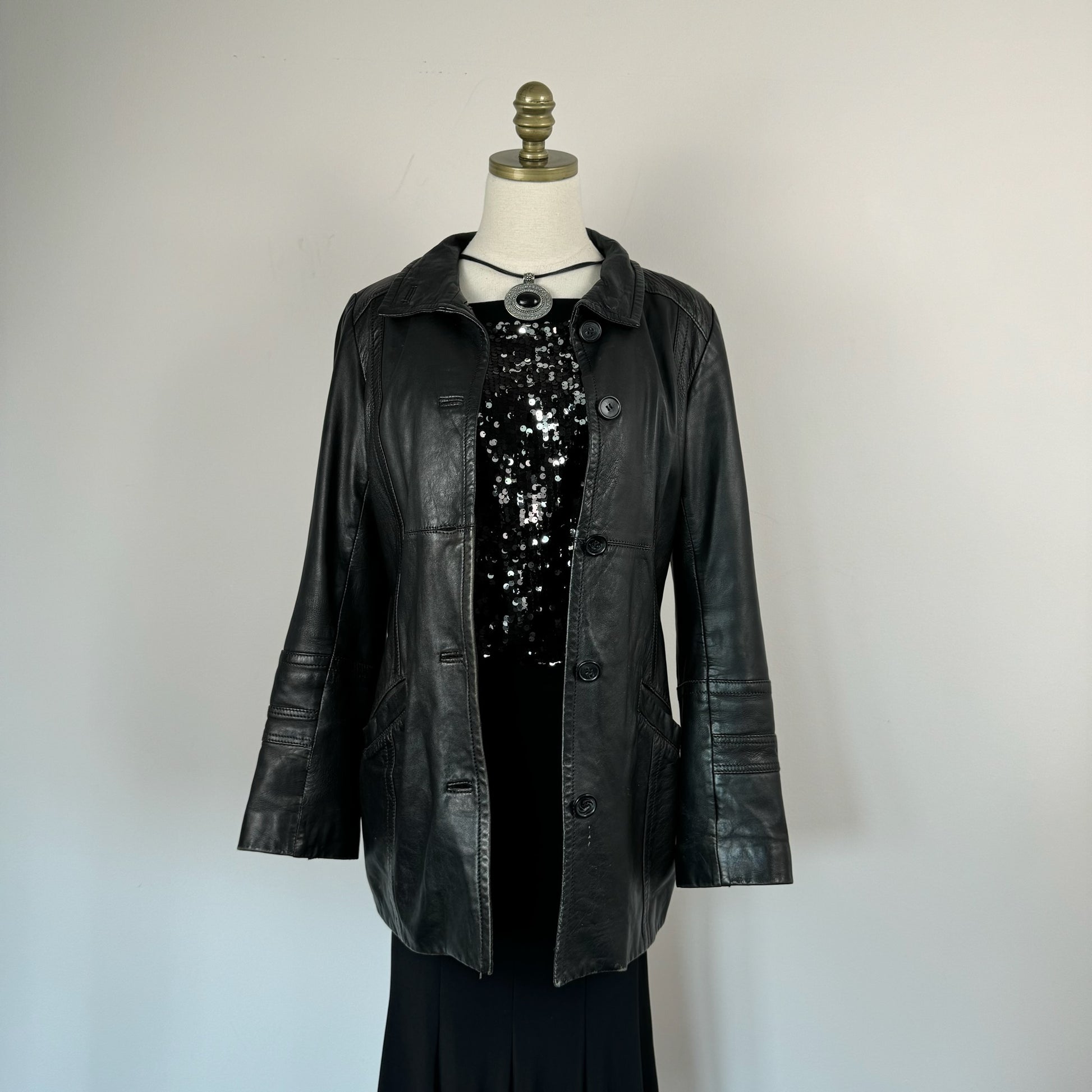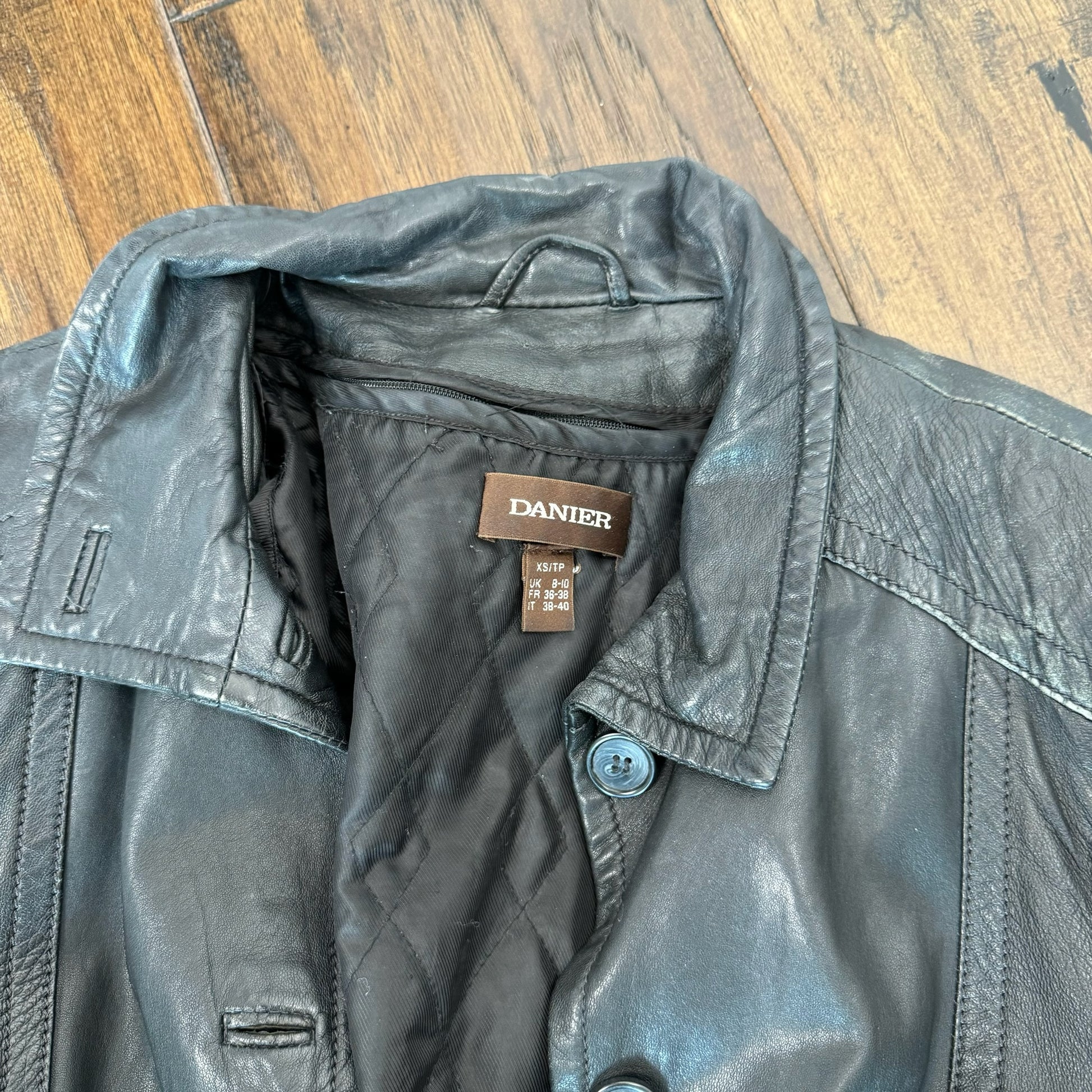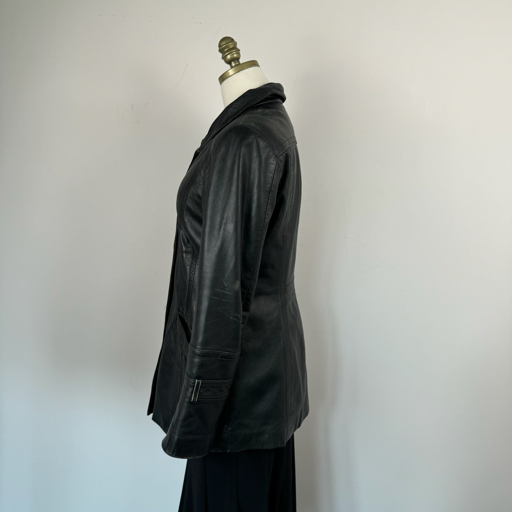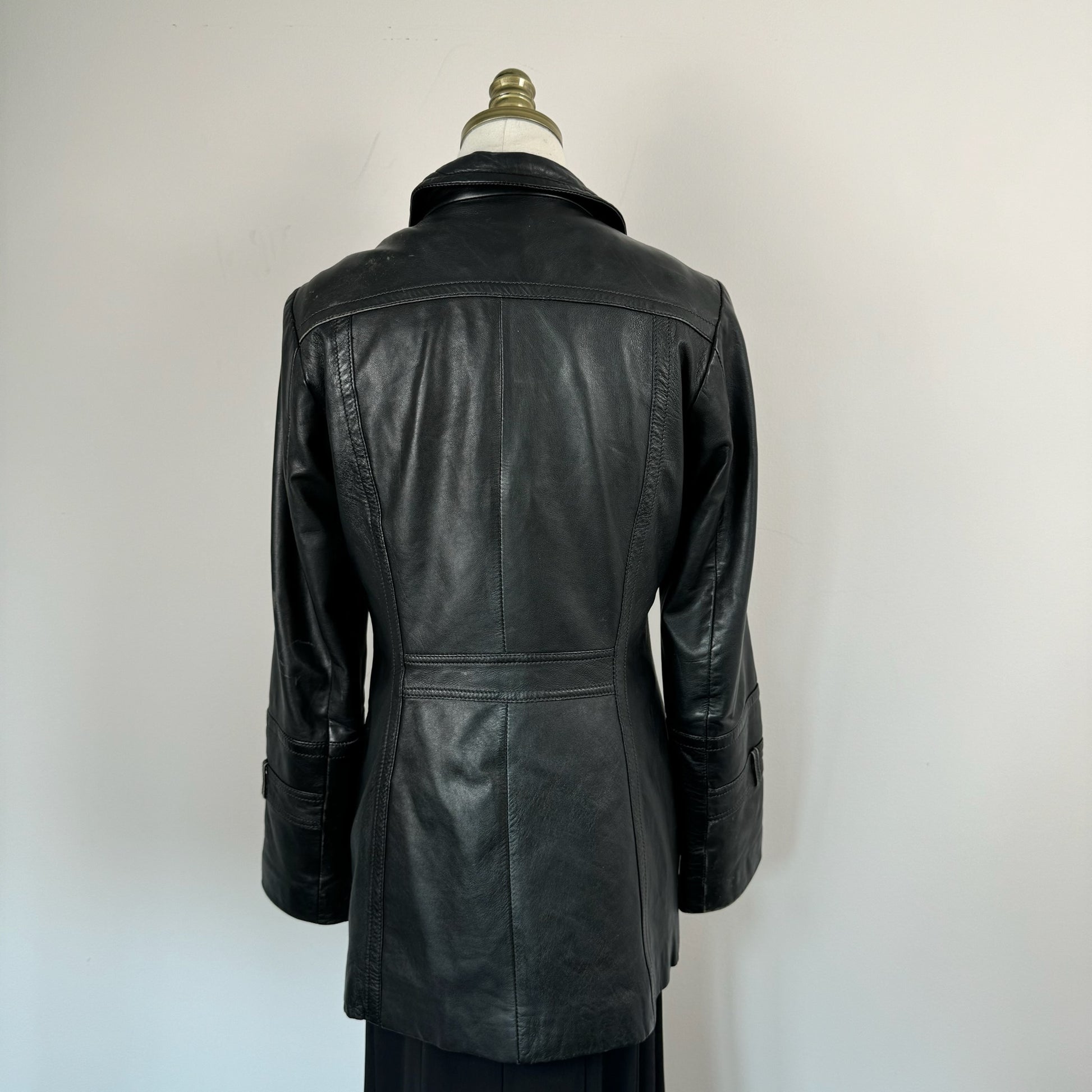Details: Black vintage leather trench coat with stunning design, button-up front, and lightly quilted lining.