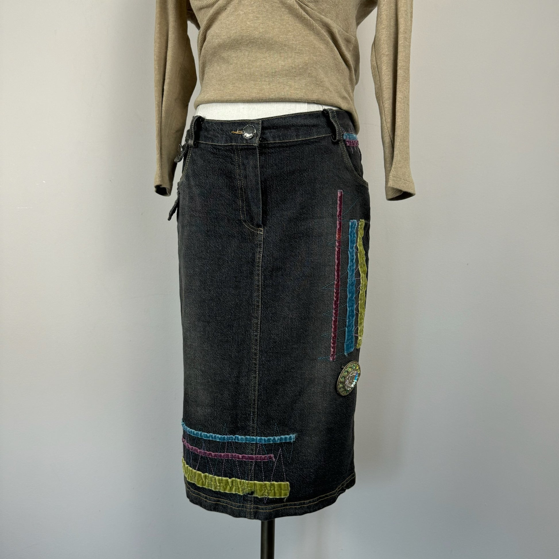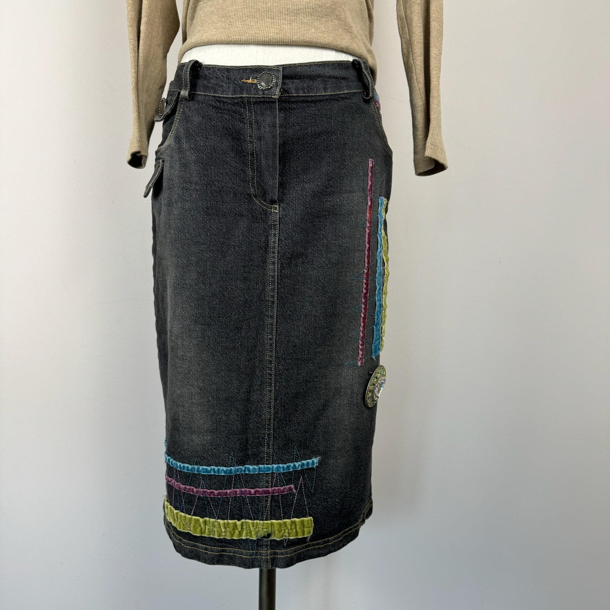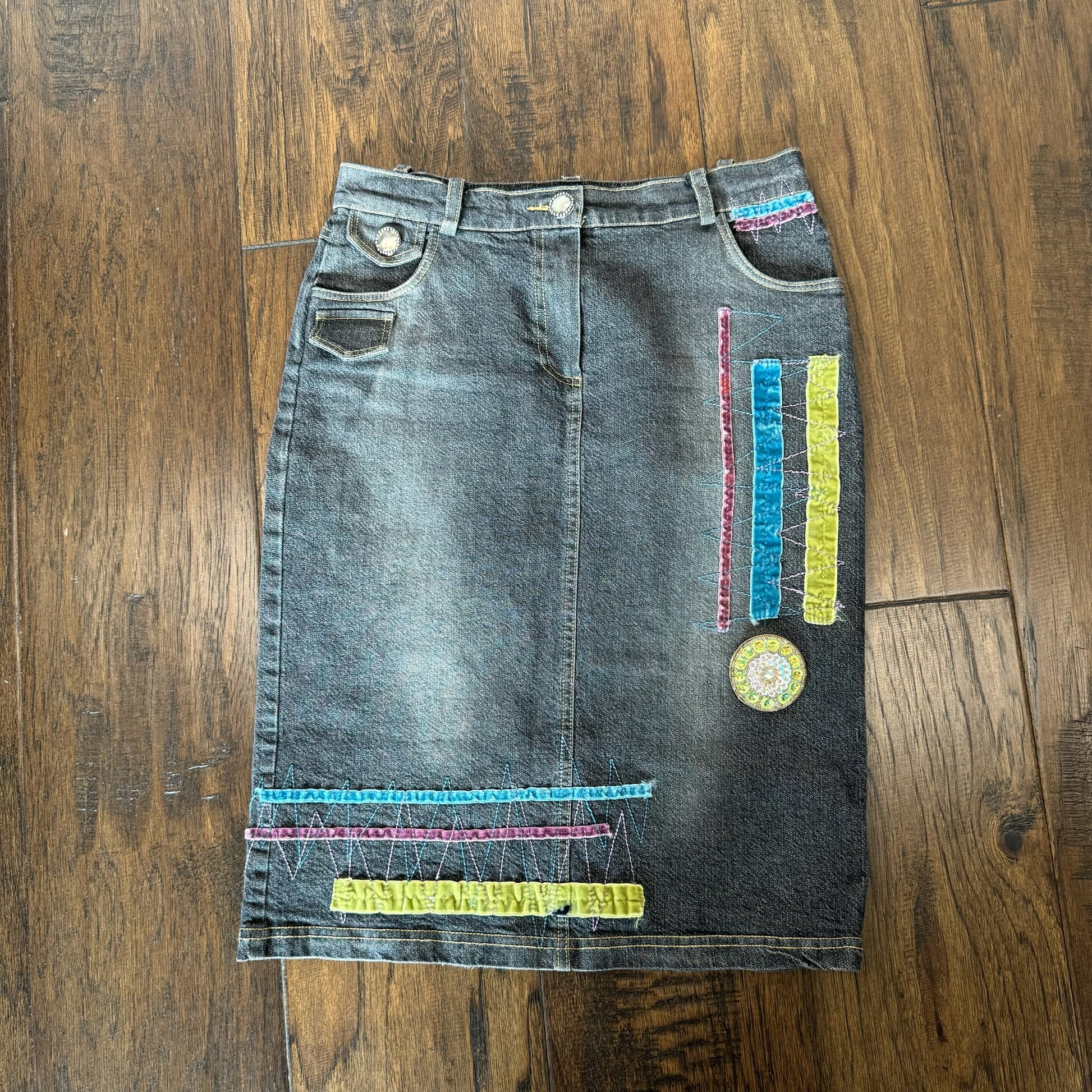 Details: Vintage faded dark wash denim midi skirt with retro style details, including velvet patches, contrast stitching, and a pinned brooch for a unique design.