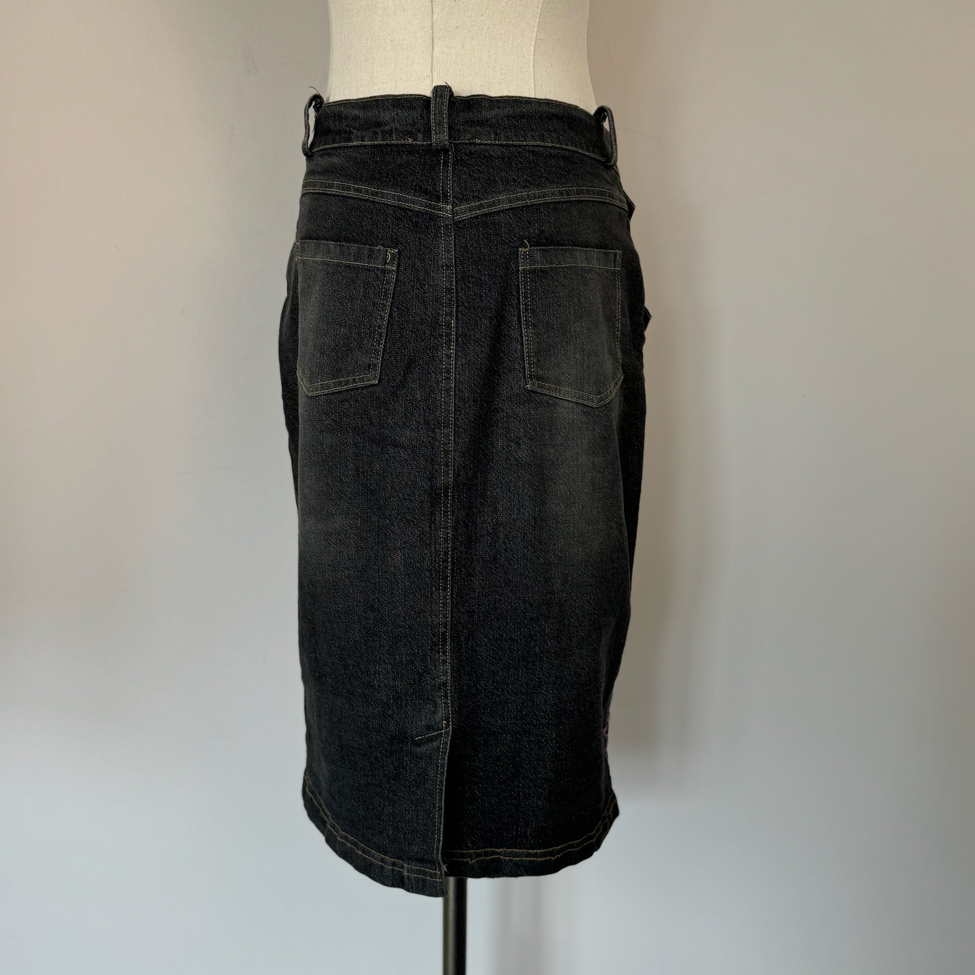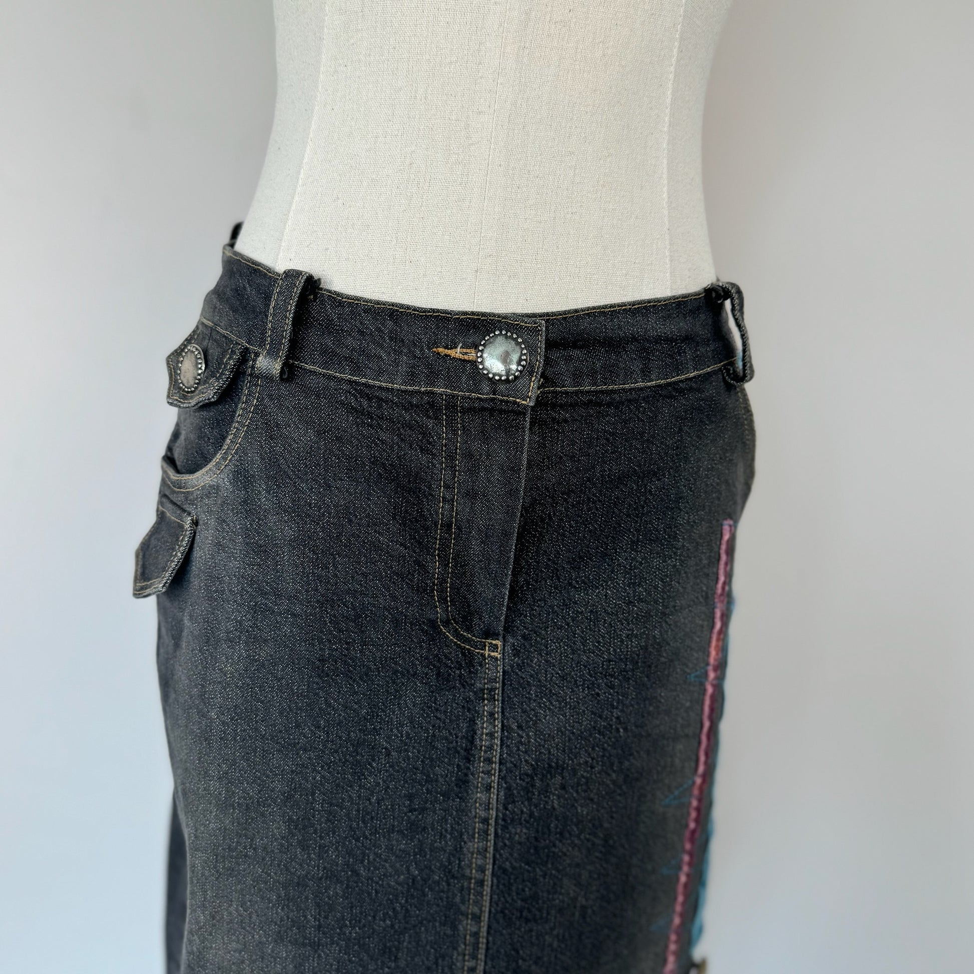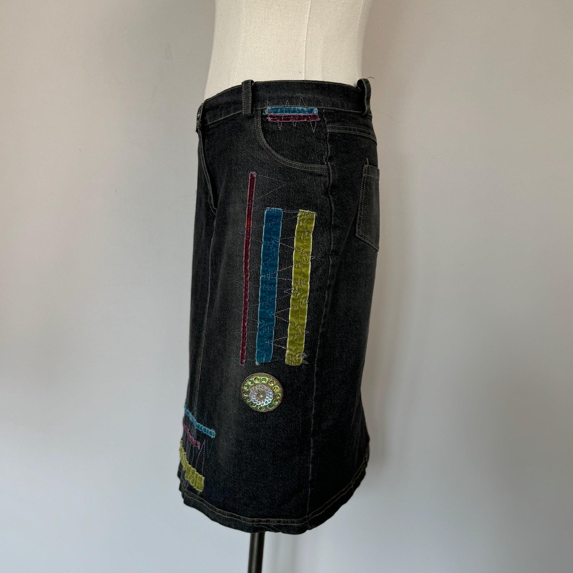 Details: Vintage faded dark wash denim midi skirt with retro style details, including velvet patches, contrast stitching, and a pinned brooch for a unique design.
