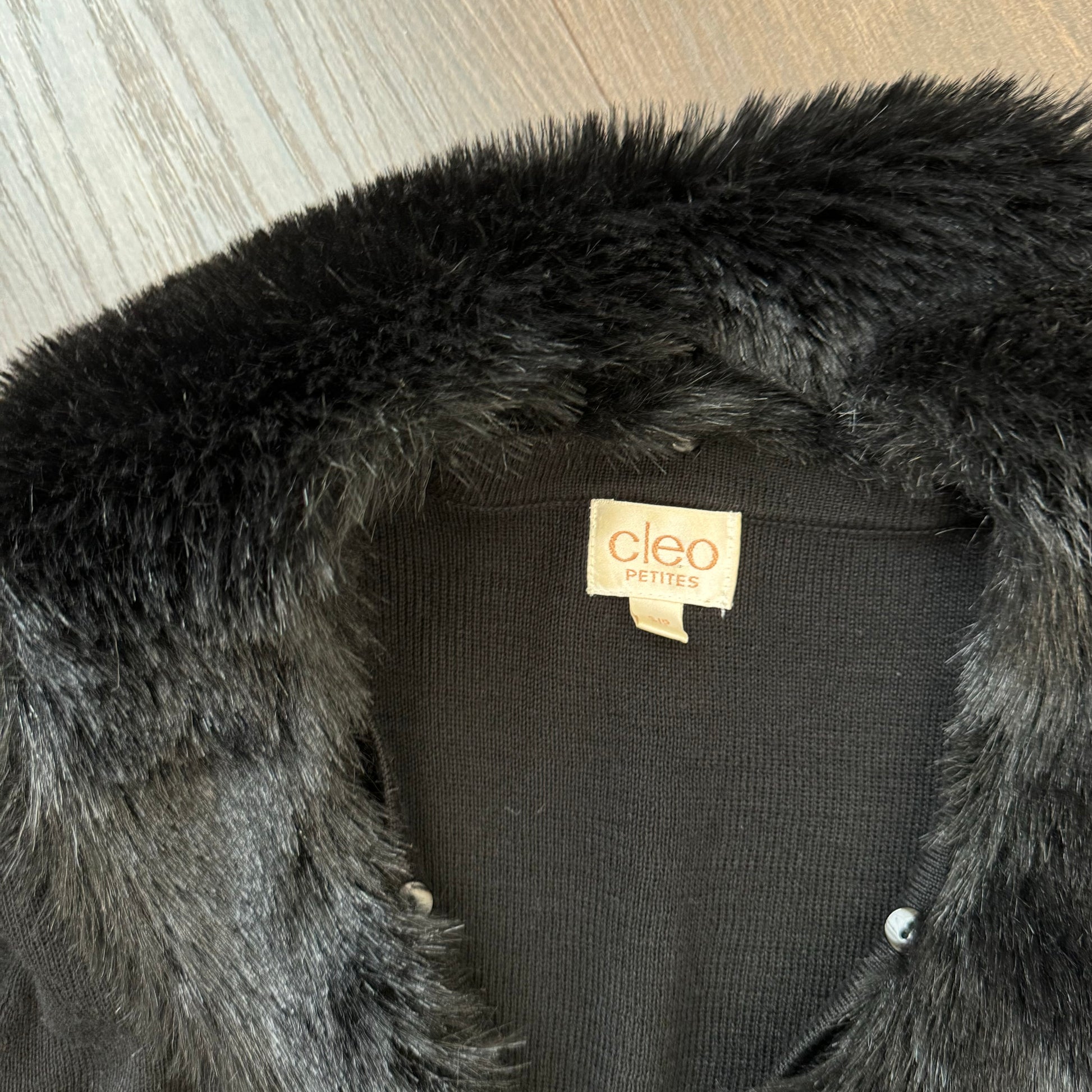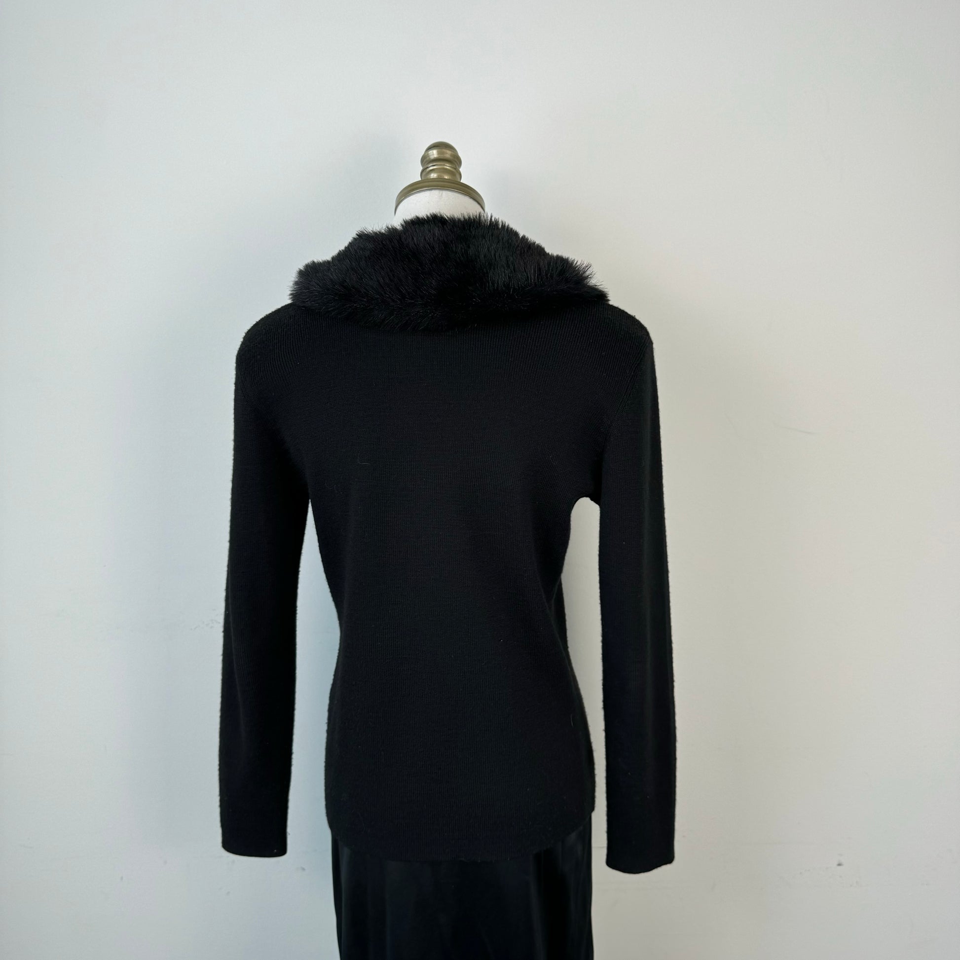 Details: Black vintage cardigan with fur trim, button-up closure, detachable collar, padded shoulders, and wool blend material.