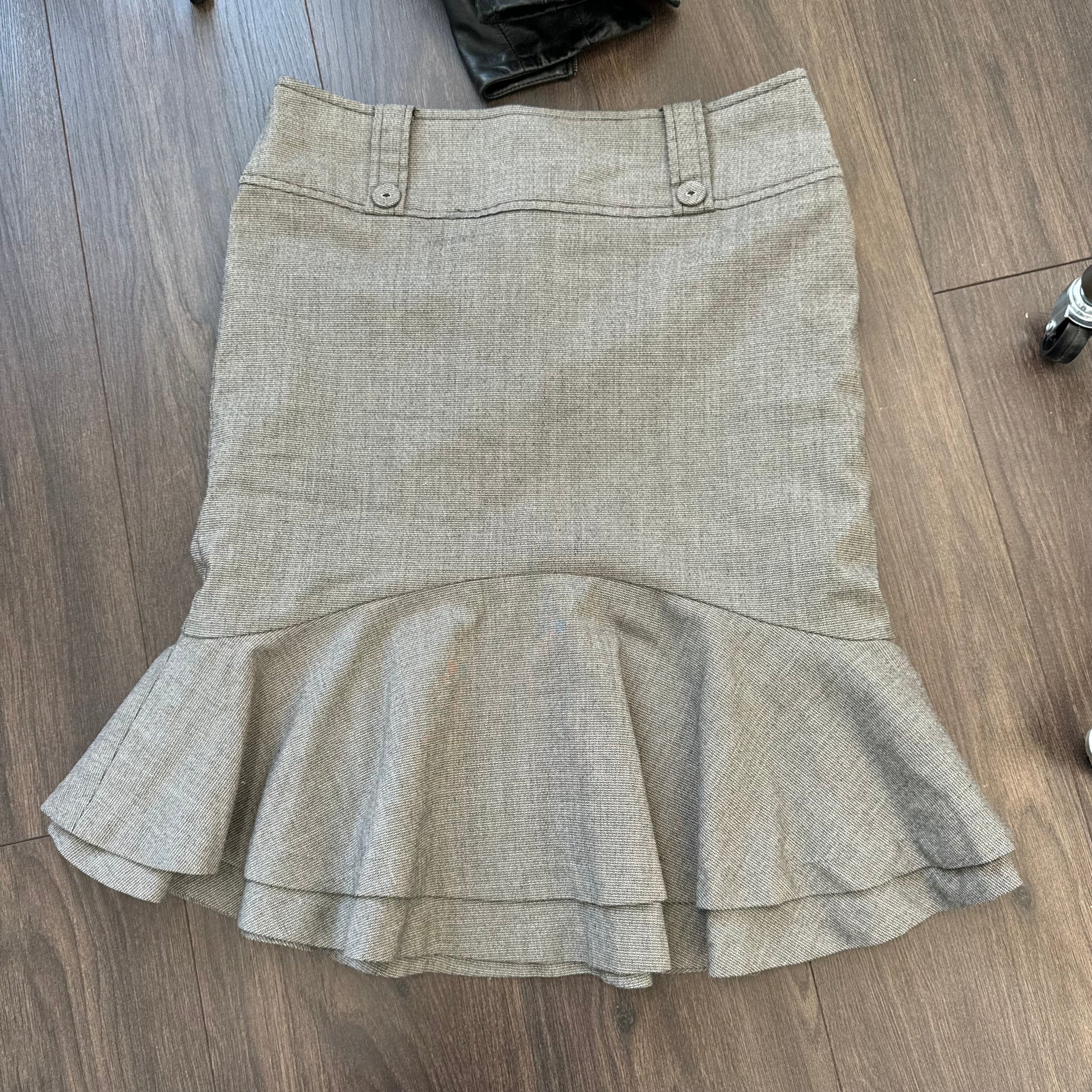 Details: Vintage brown/grey midi skirt with a ruffled hem.