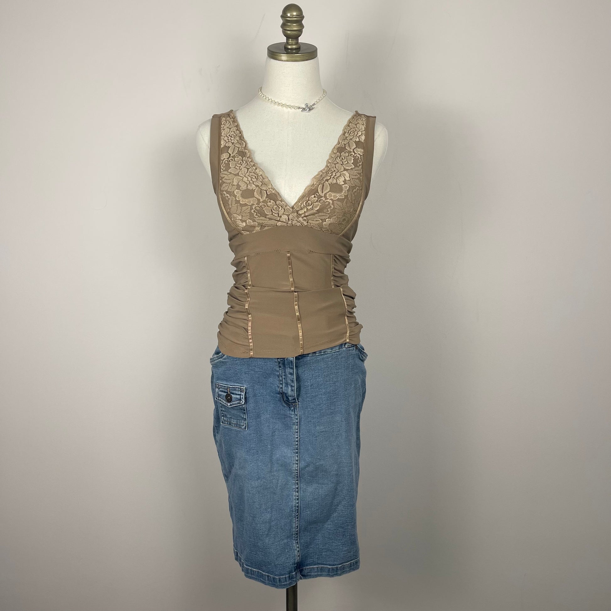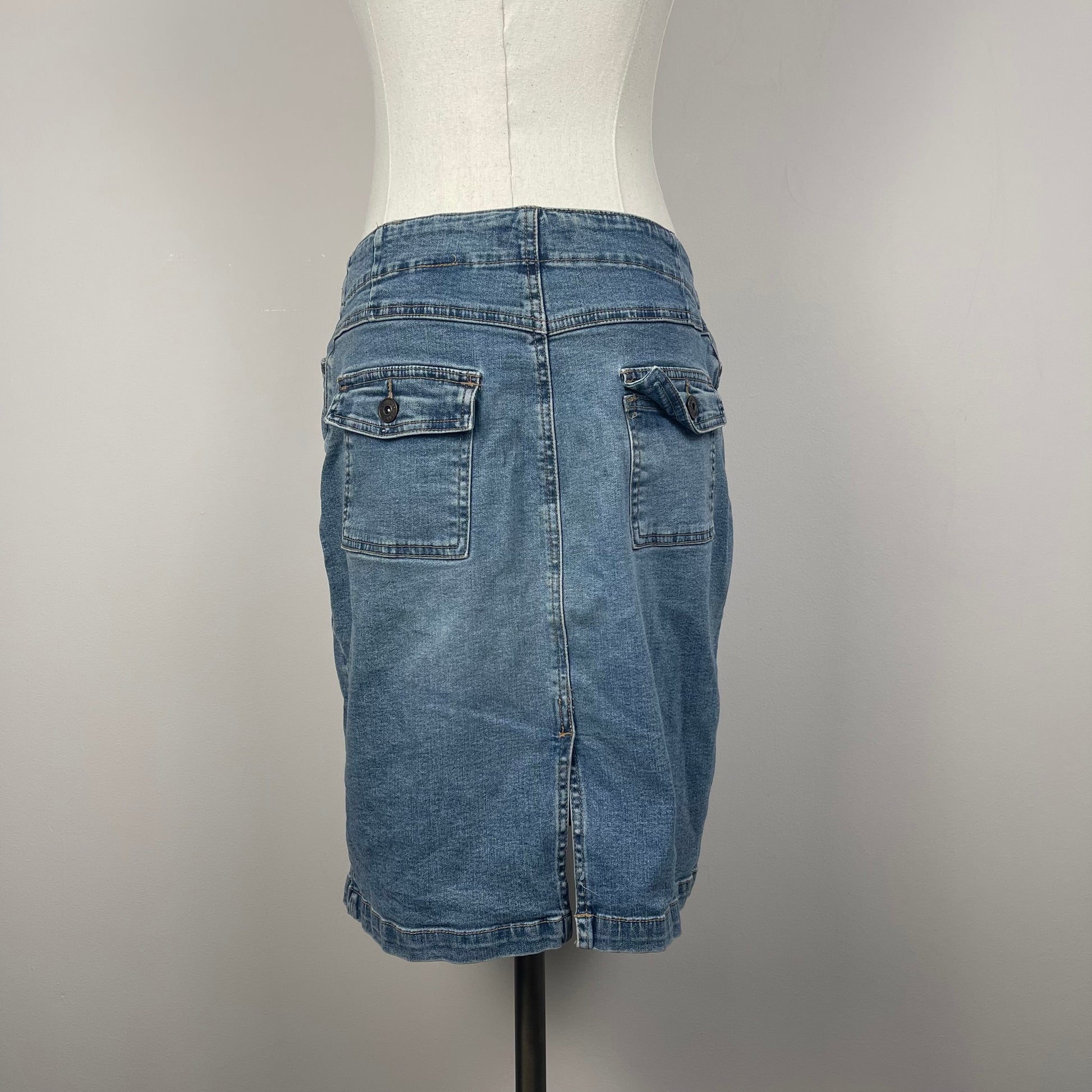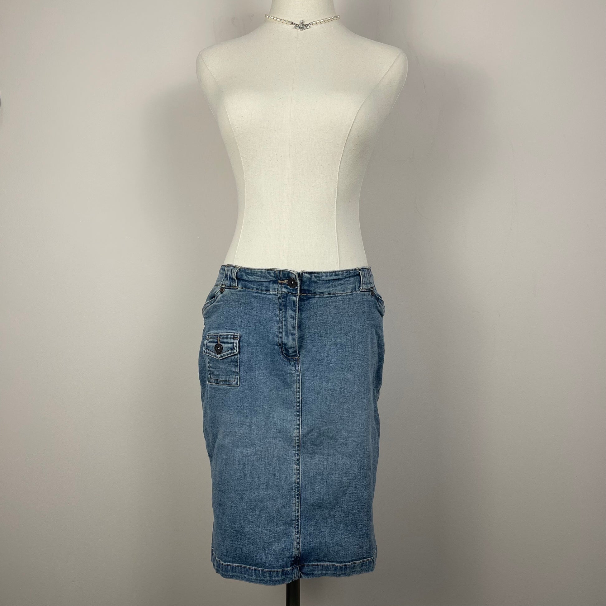 Details: Vintage light wash denim midi skirt with a little pocket on the front side, two pockets on the back, and a slit on the back, creating a stunning silhouette.