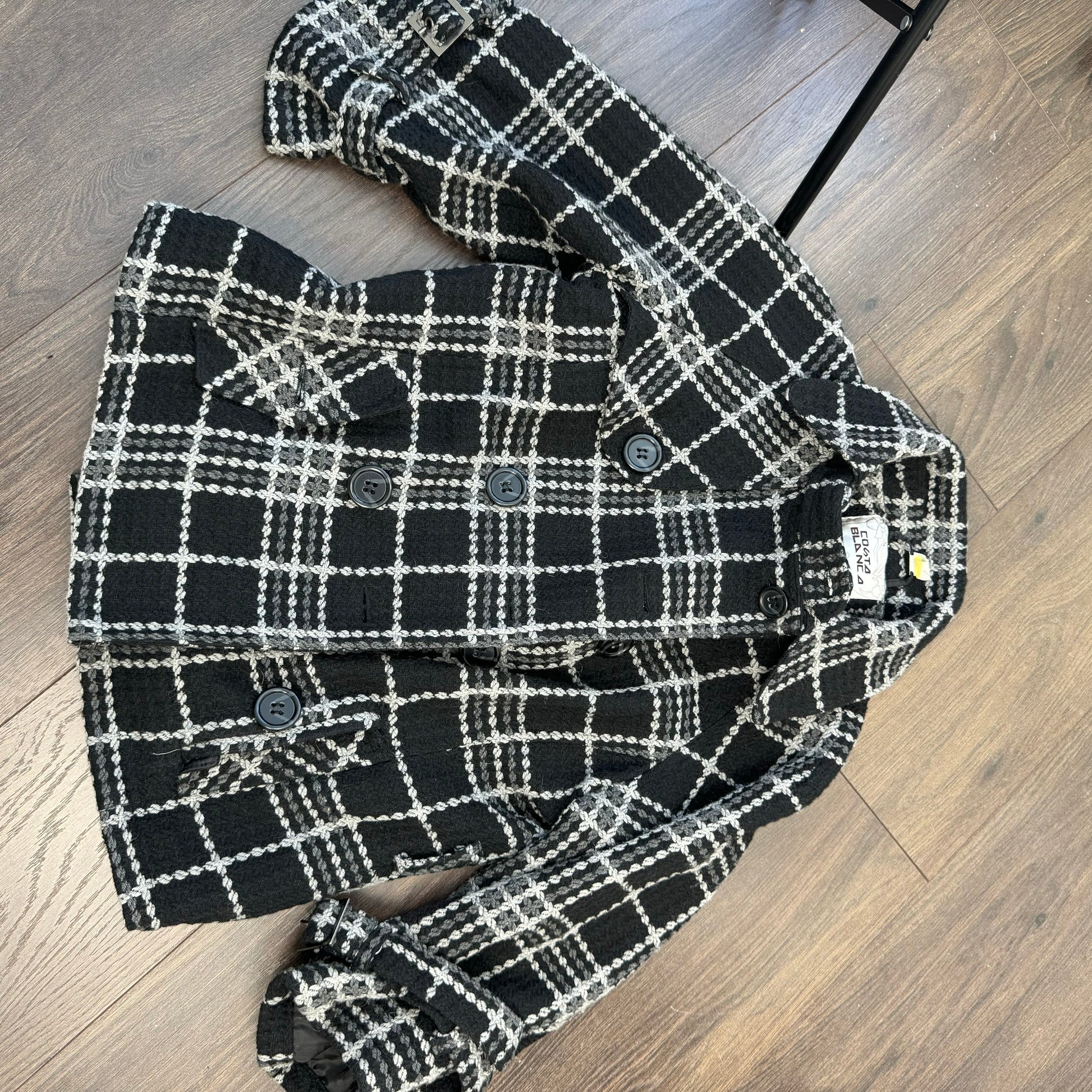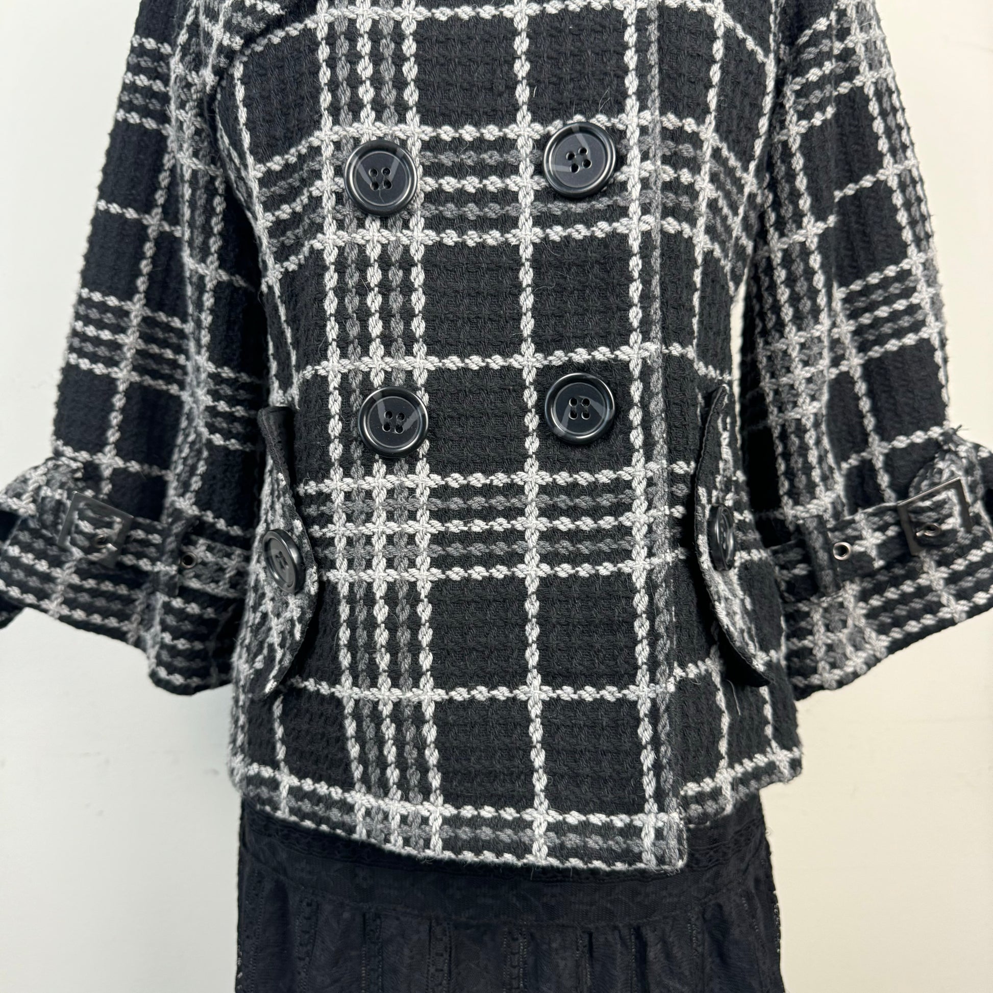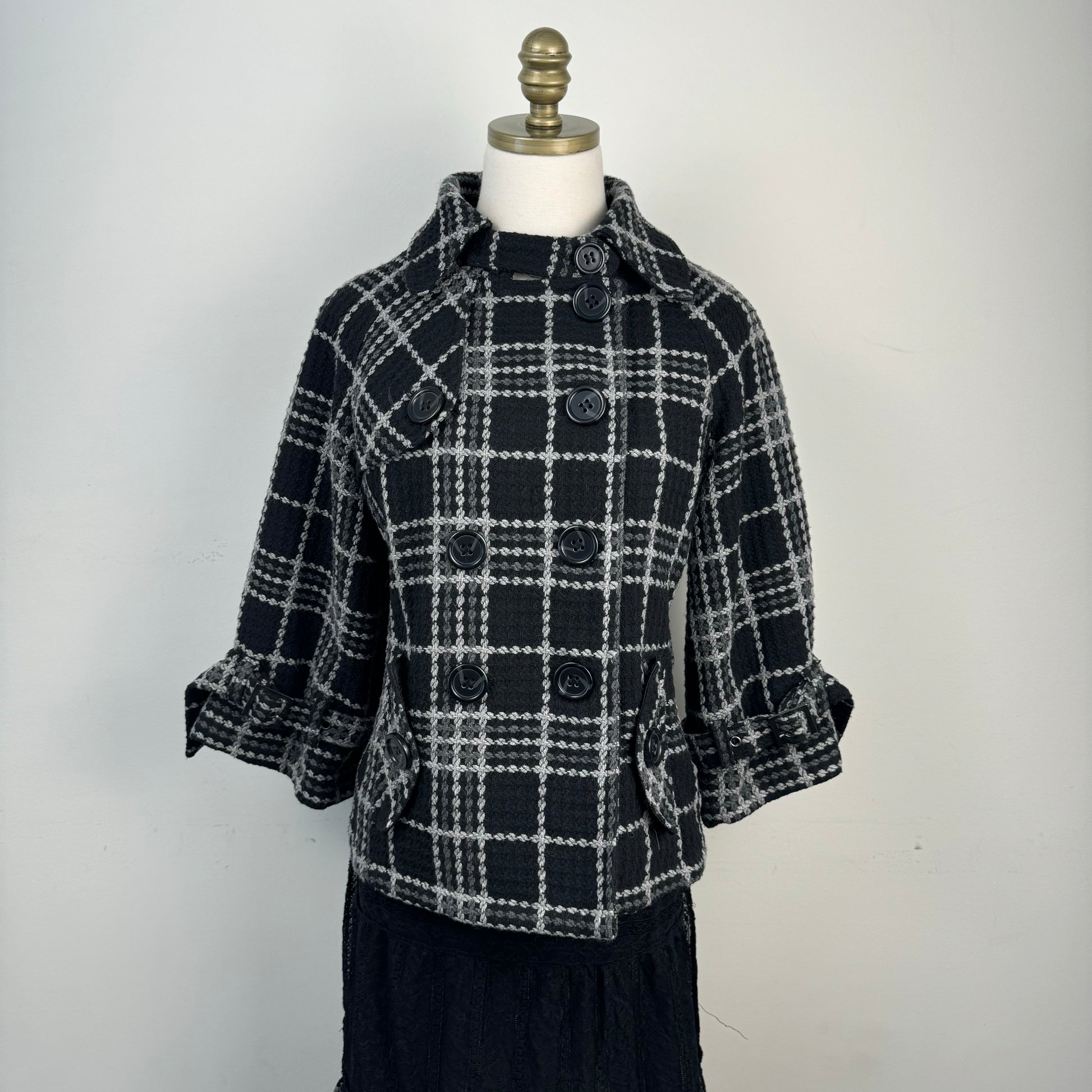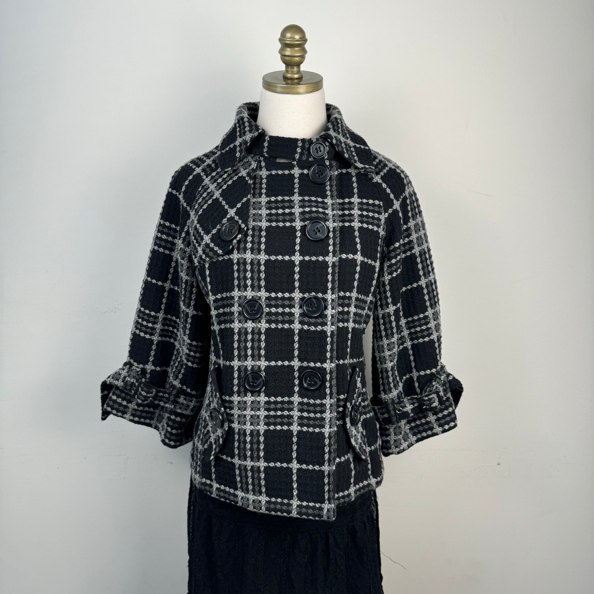 Details: Black and grey plaid textured chunky peacoat with a double-breasted button to the top closure.