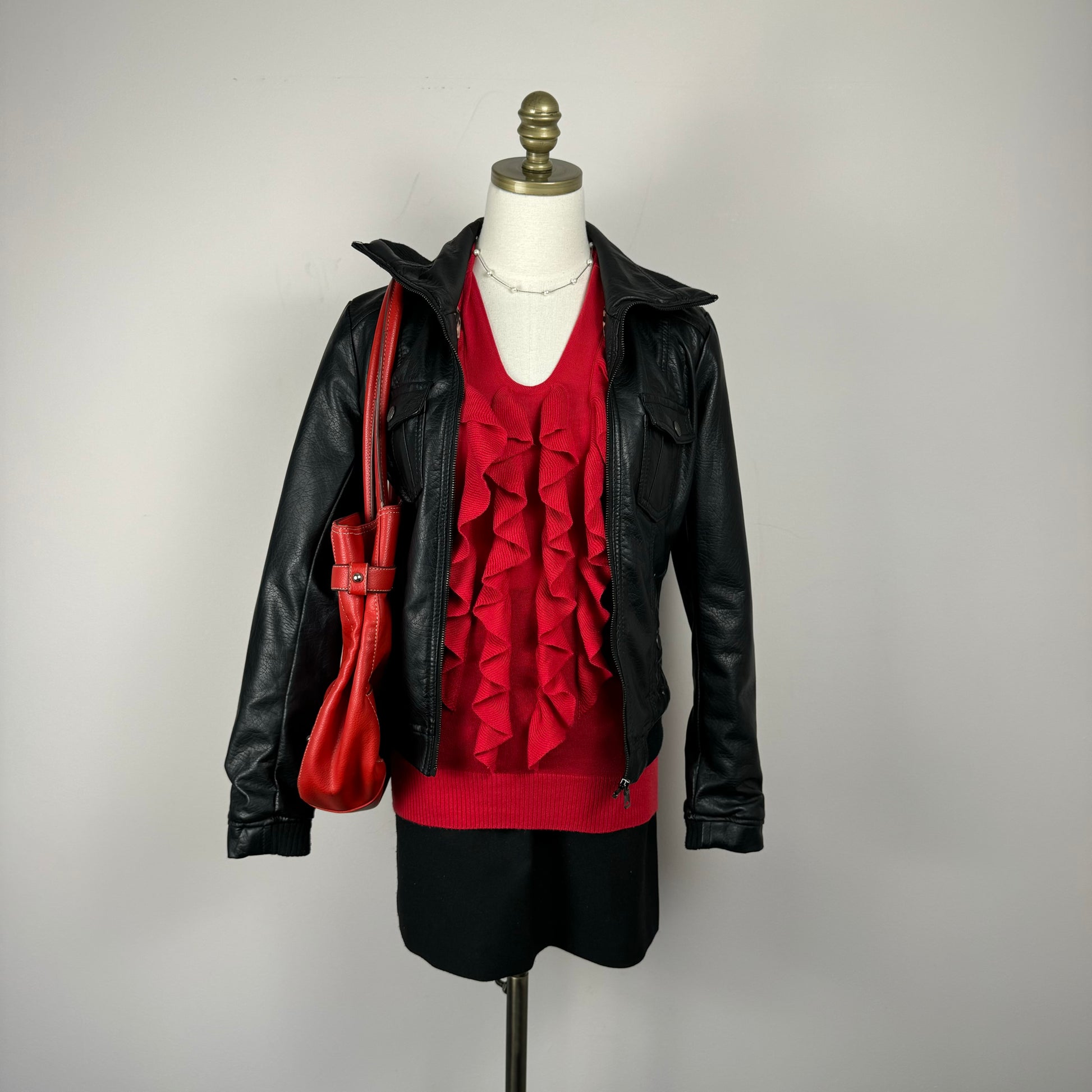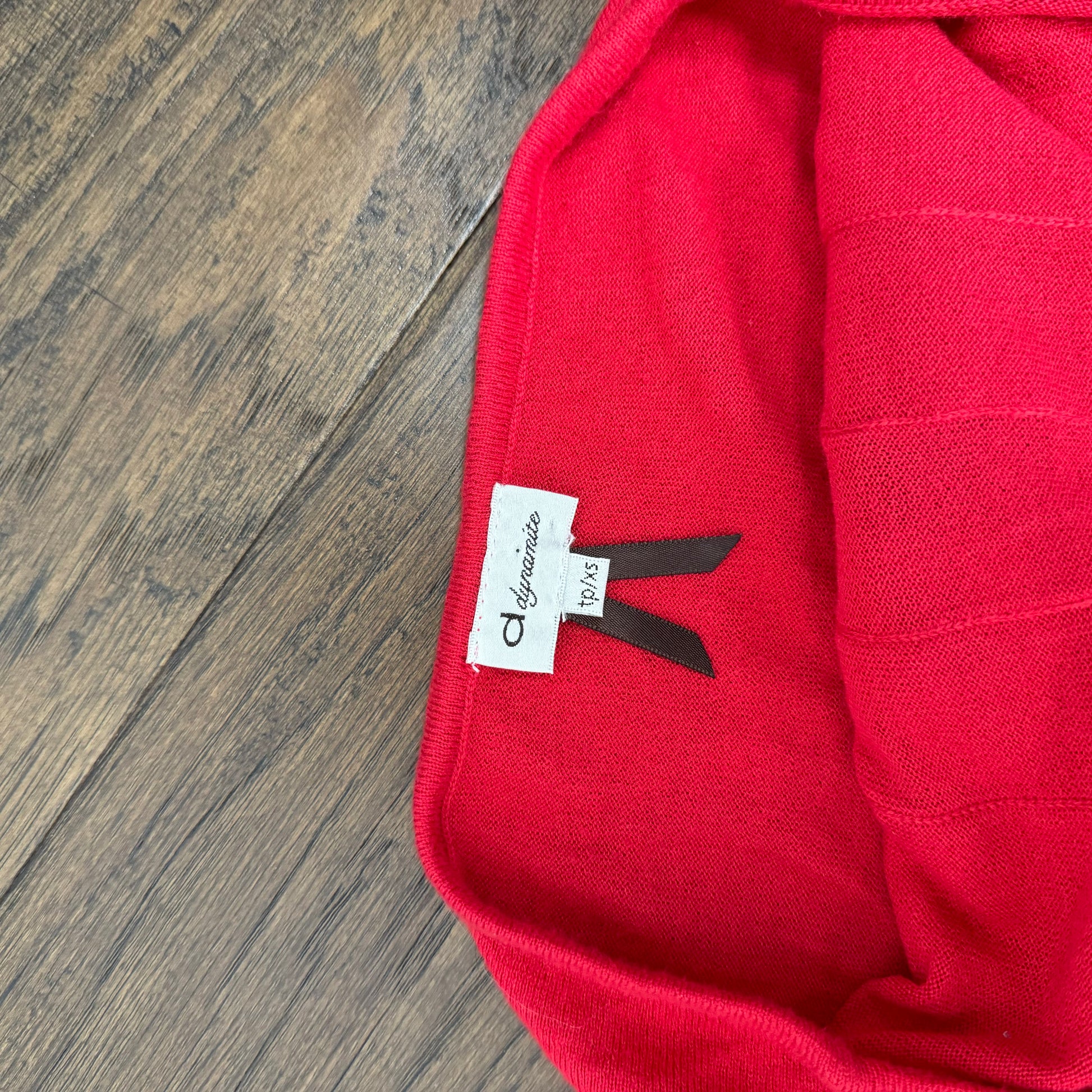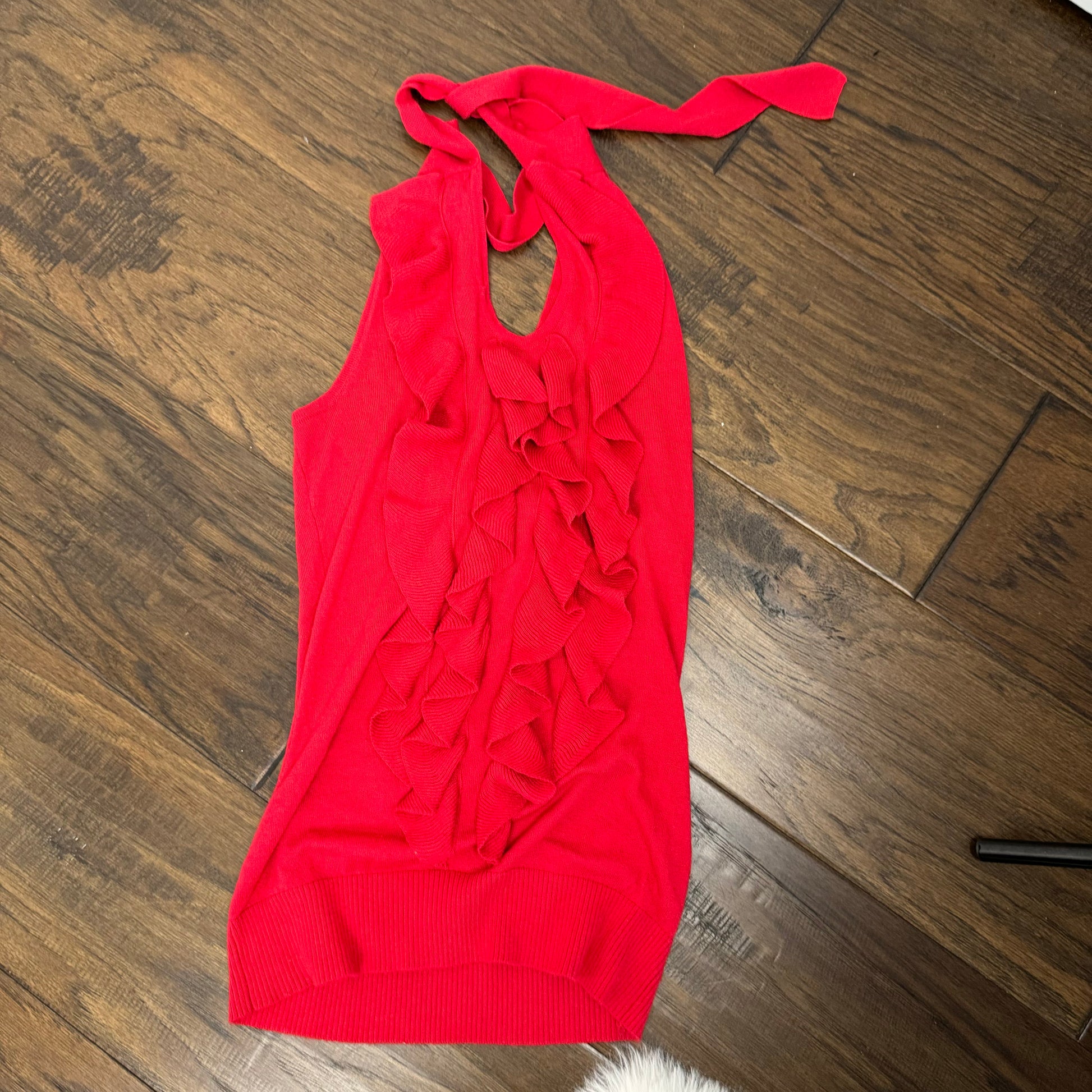 Details: Gorgeous red knit top with a halter neckline, featuring knit ruffles along the front and a stunning silhouette.